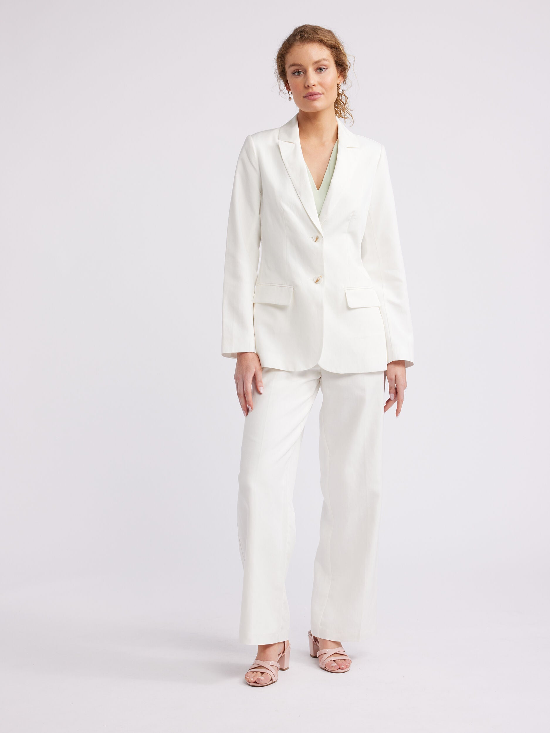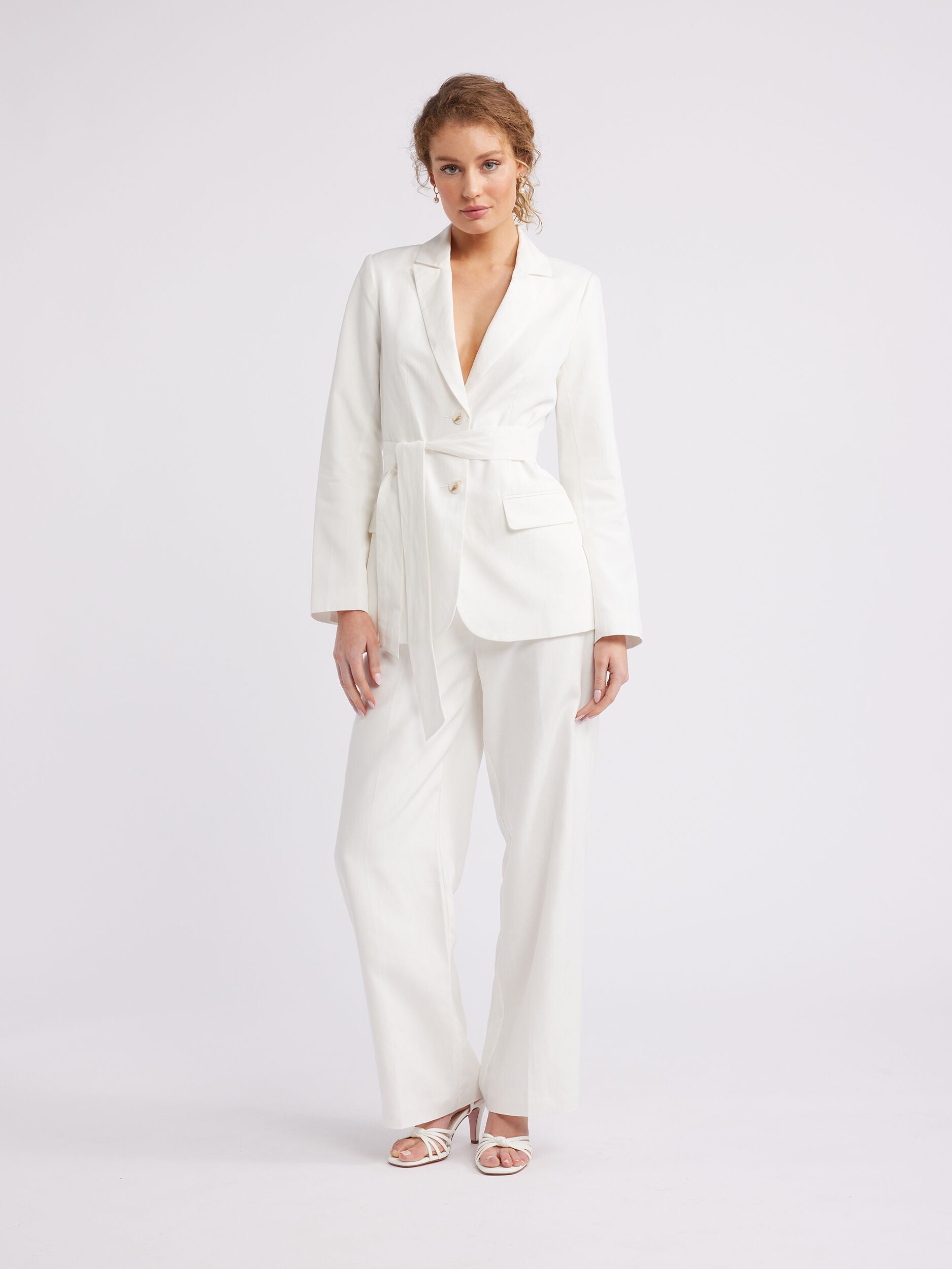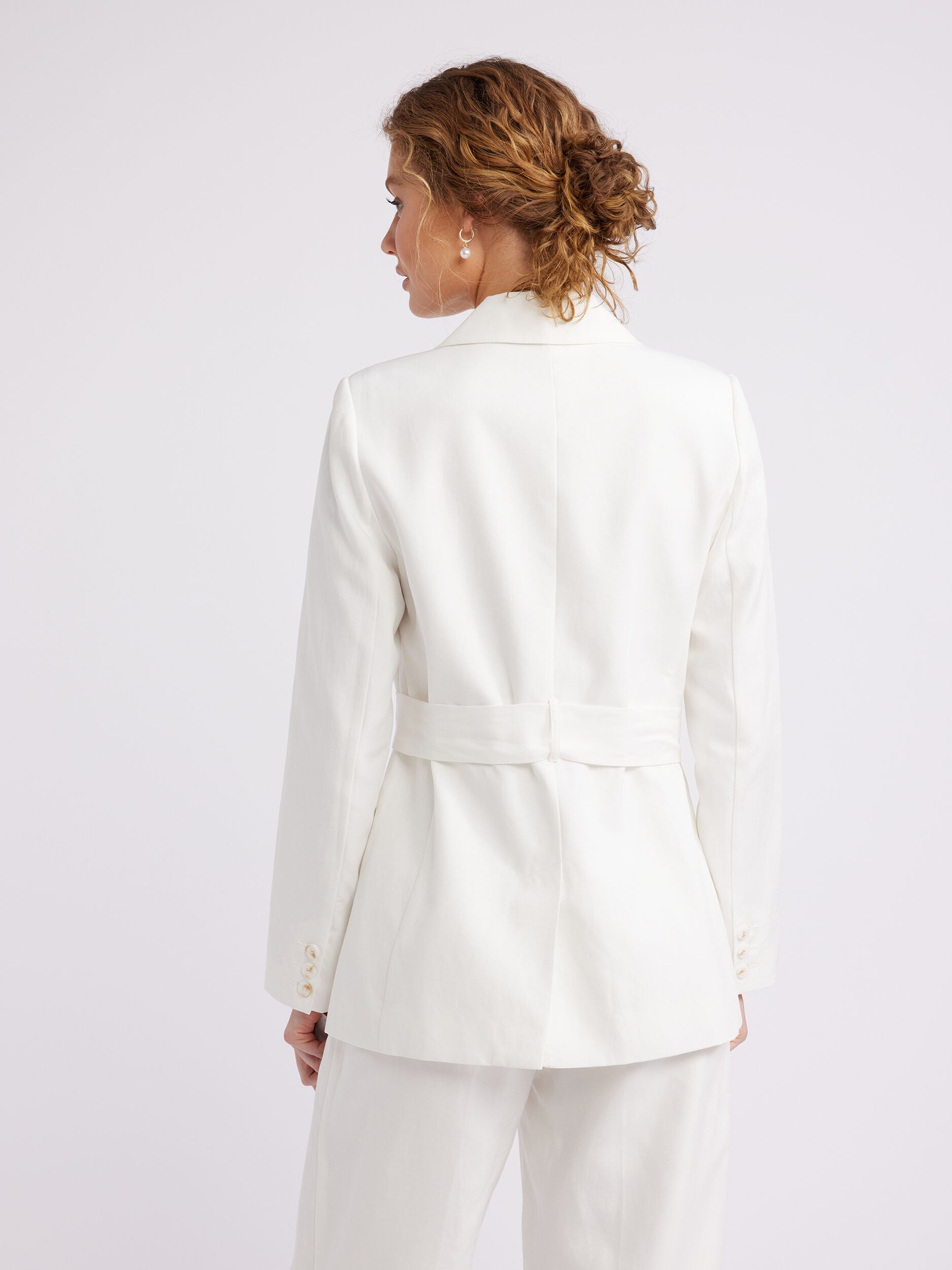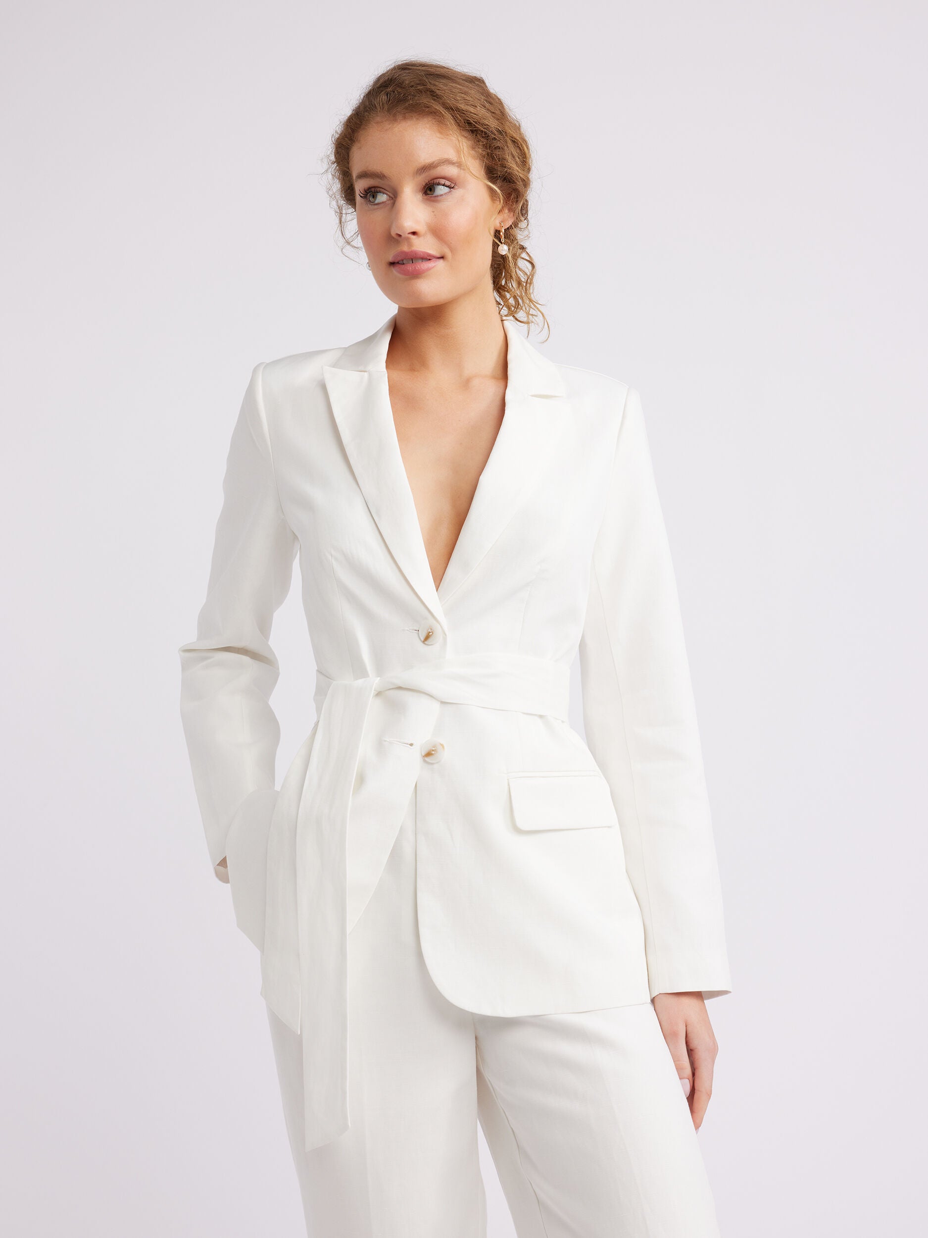 Elevate your style with the Adrienne Blazer. Crafted from lightweight linen fabric in a chic ivory shade, this fully lined blazer features tortoise shell button details, front pockets, and a waist tie for a tailored fit. Its longer length and shoulder padding exude sophistication. The back cuff buttons add a unique touch. Pair it perfectly with the Adrienne Pant for a timeless ensemble that redefines elegance.