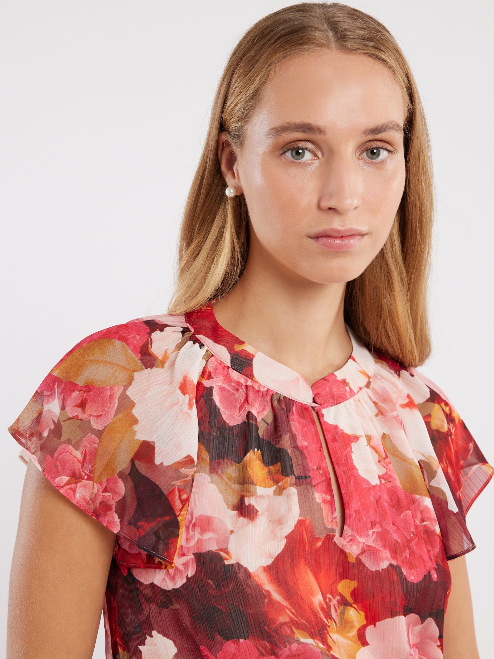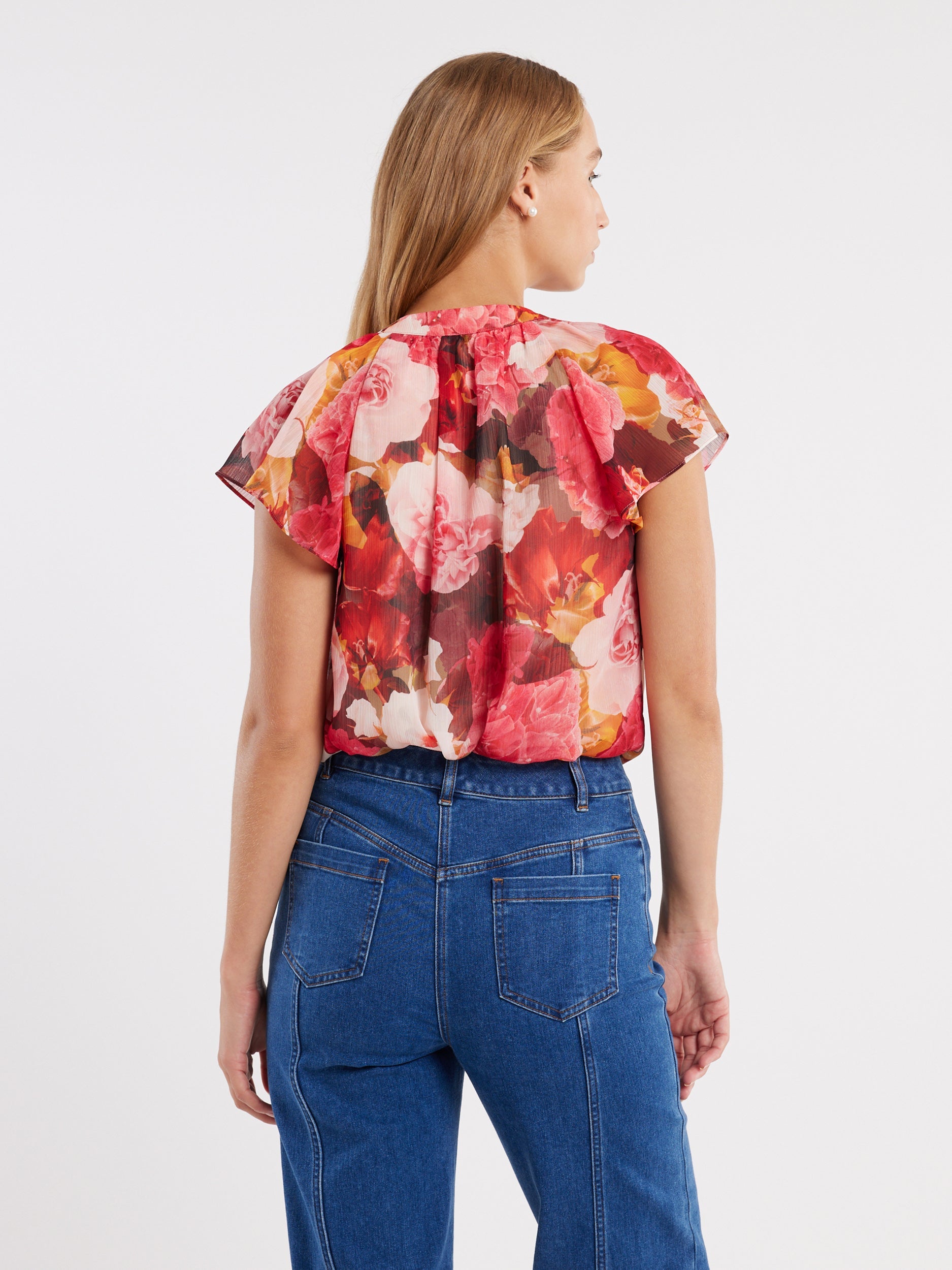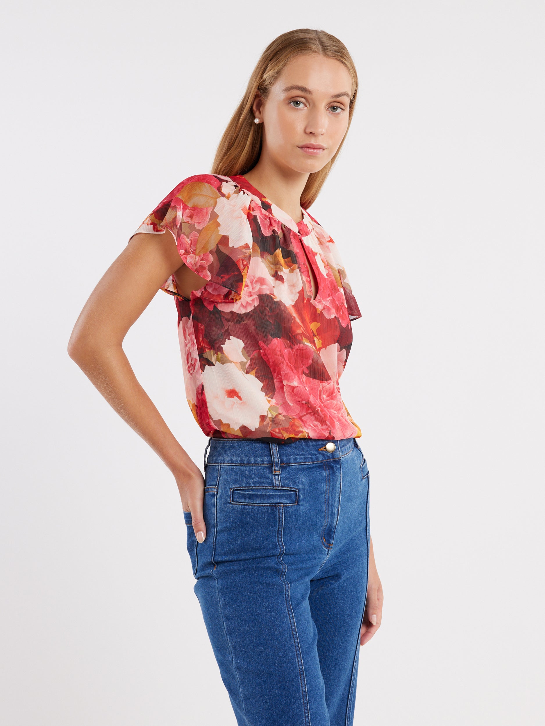 Brighten your winter wardrobe with our new Canvas Bloom Blouse. This gorgeous top features an all-new floral print in warm reds, pinks, and oranges in a floaty georgette fabric. The Canvas Bloom Blouse is the perfect day time to date night top, with a round neckline that can be worn open or closed with the keyhole feature, and short flutter sleeves. With its relaxed fit silhouette, this top is super flattering on every shape and size. We like to pair this blouse with our essential denim jeans, but this versatile palette allows plenty of room for playful colour blocking with tailored pants and skirts!