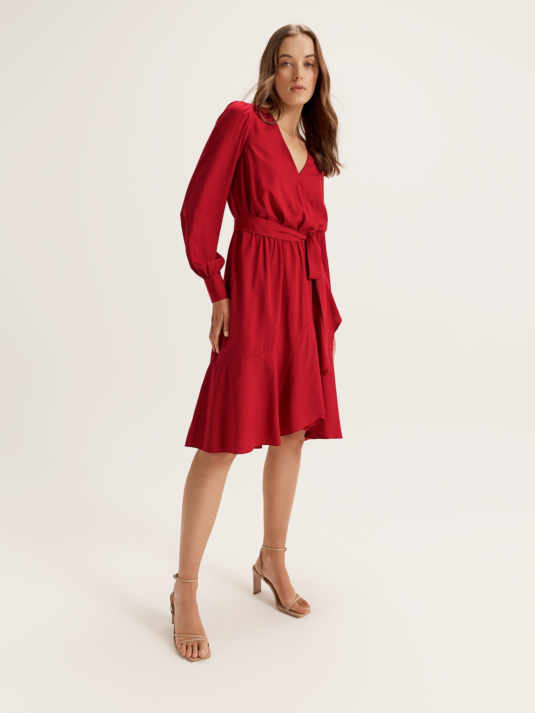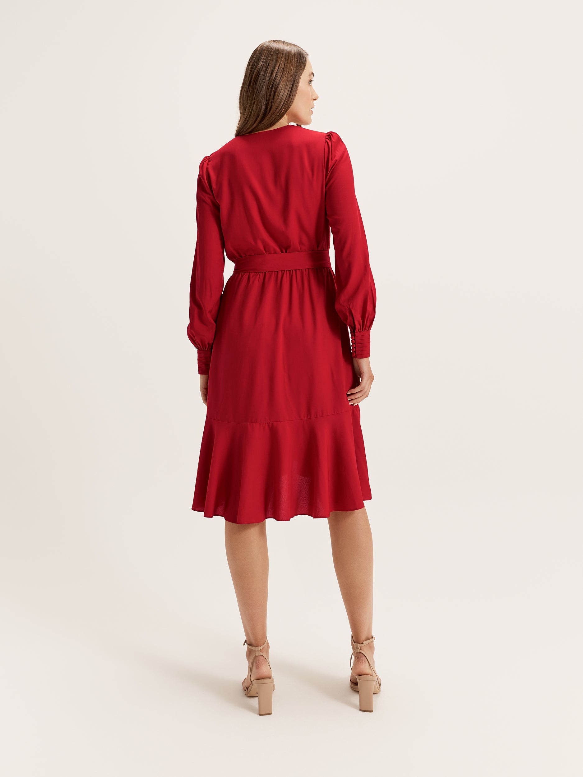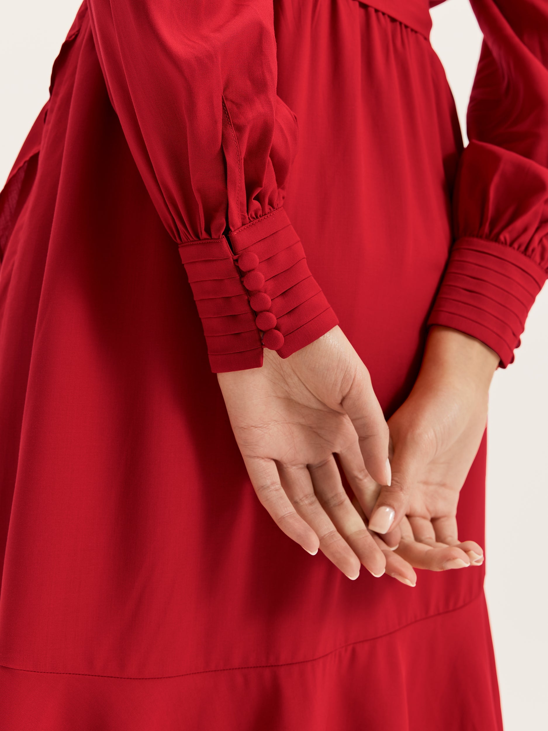 The Cascade Dress in a vibrant red shade features a v-neck crossover bodice with a security button and elasticated waist. Fully lined with a waist tie, it boasts long sleeves with pleated button cuffs. The above-knee length skirt is adorned with a panelled frill for added elegance.