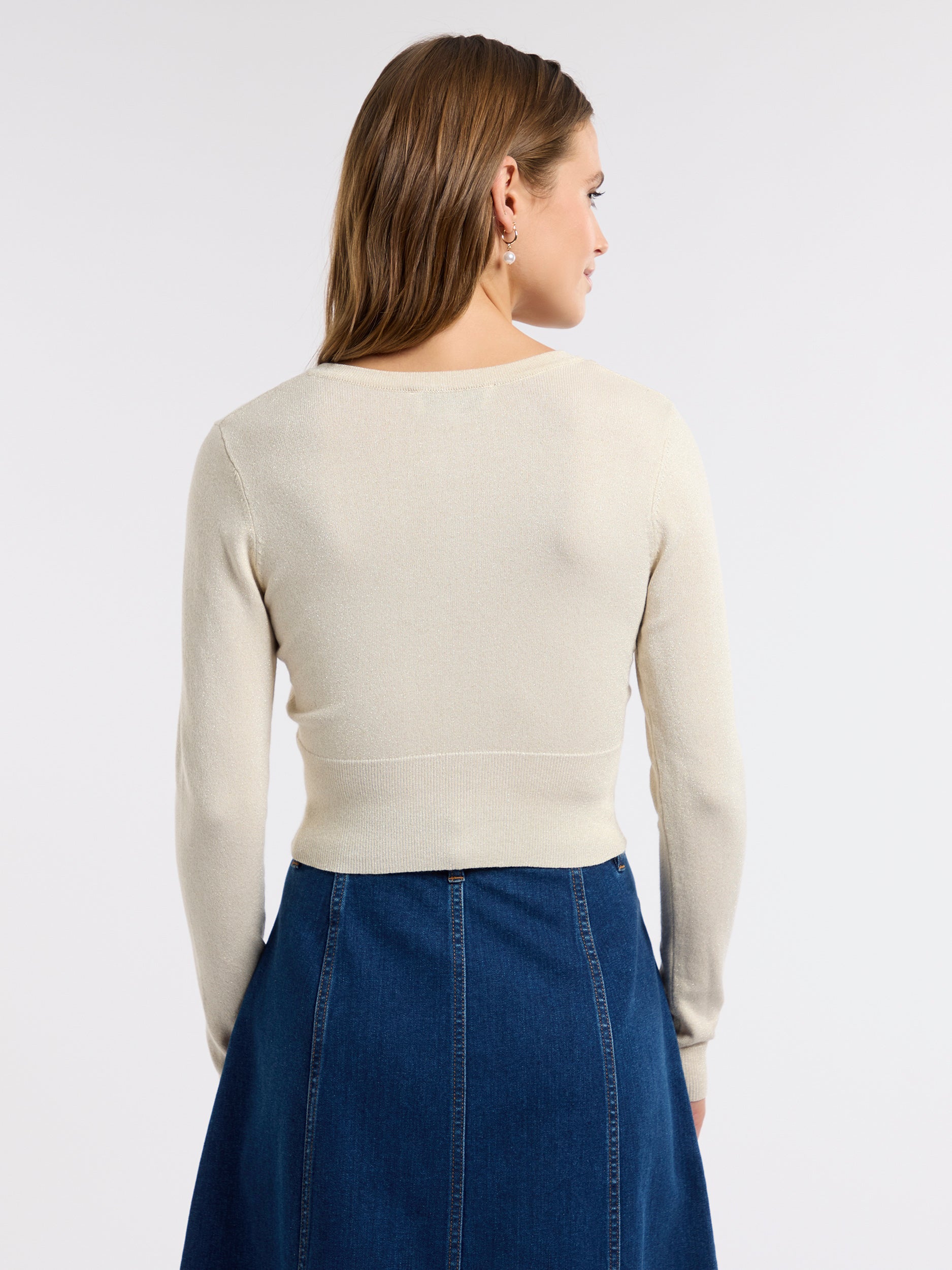 The classic Chessie Long Sleeve Cardigan in cream is the perfect cardi for any Review Occasion and a must-have wardrobe essential. It features a slightly cropped length with a wide hem band, cute embossed dot details, and buttons dyed to match perfectly.