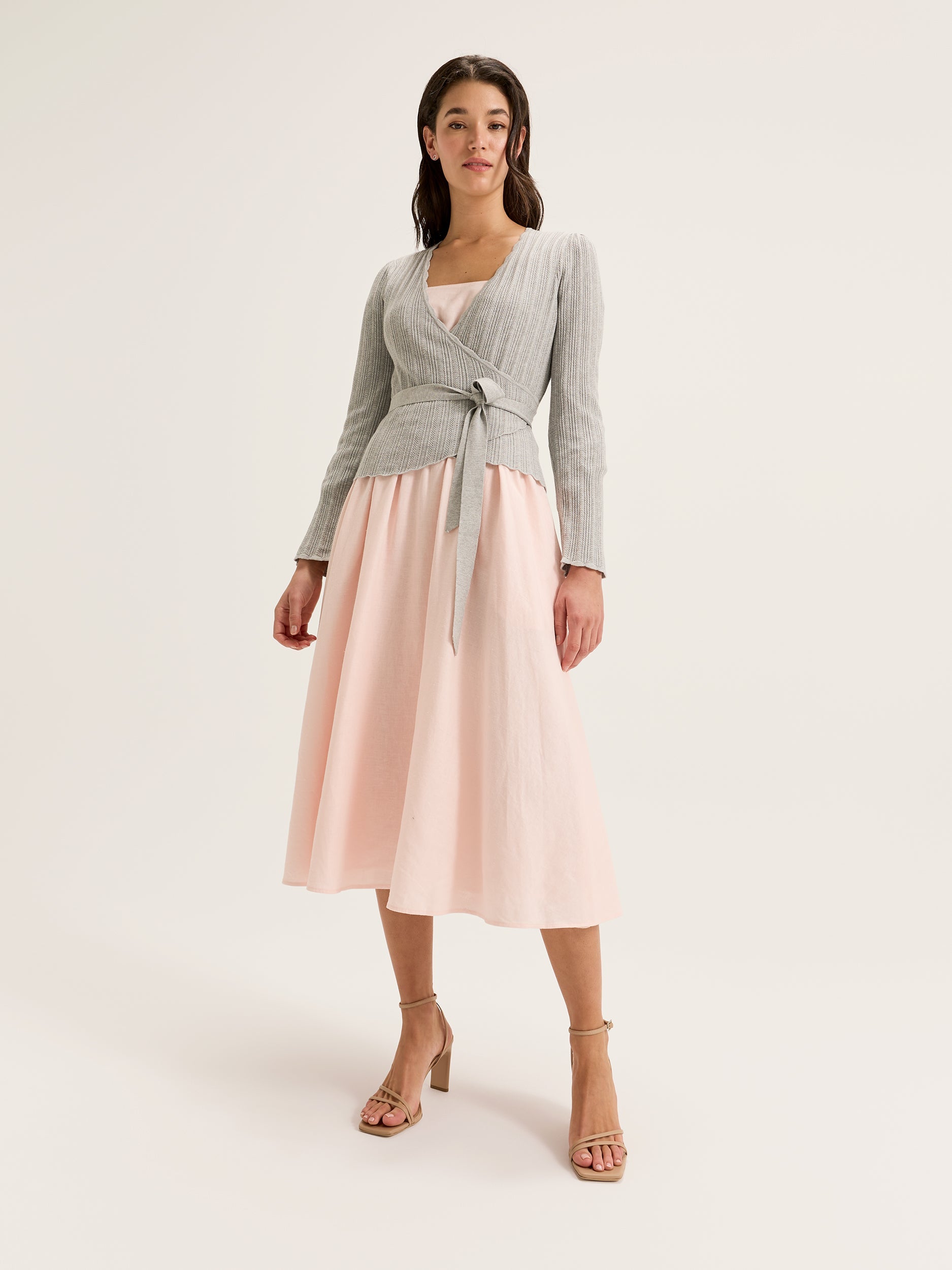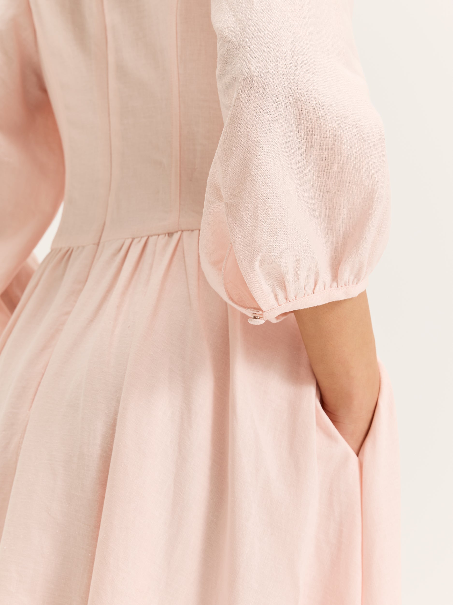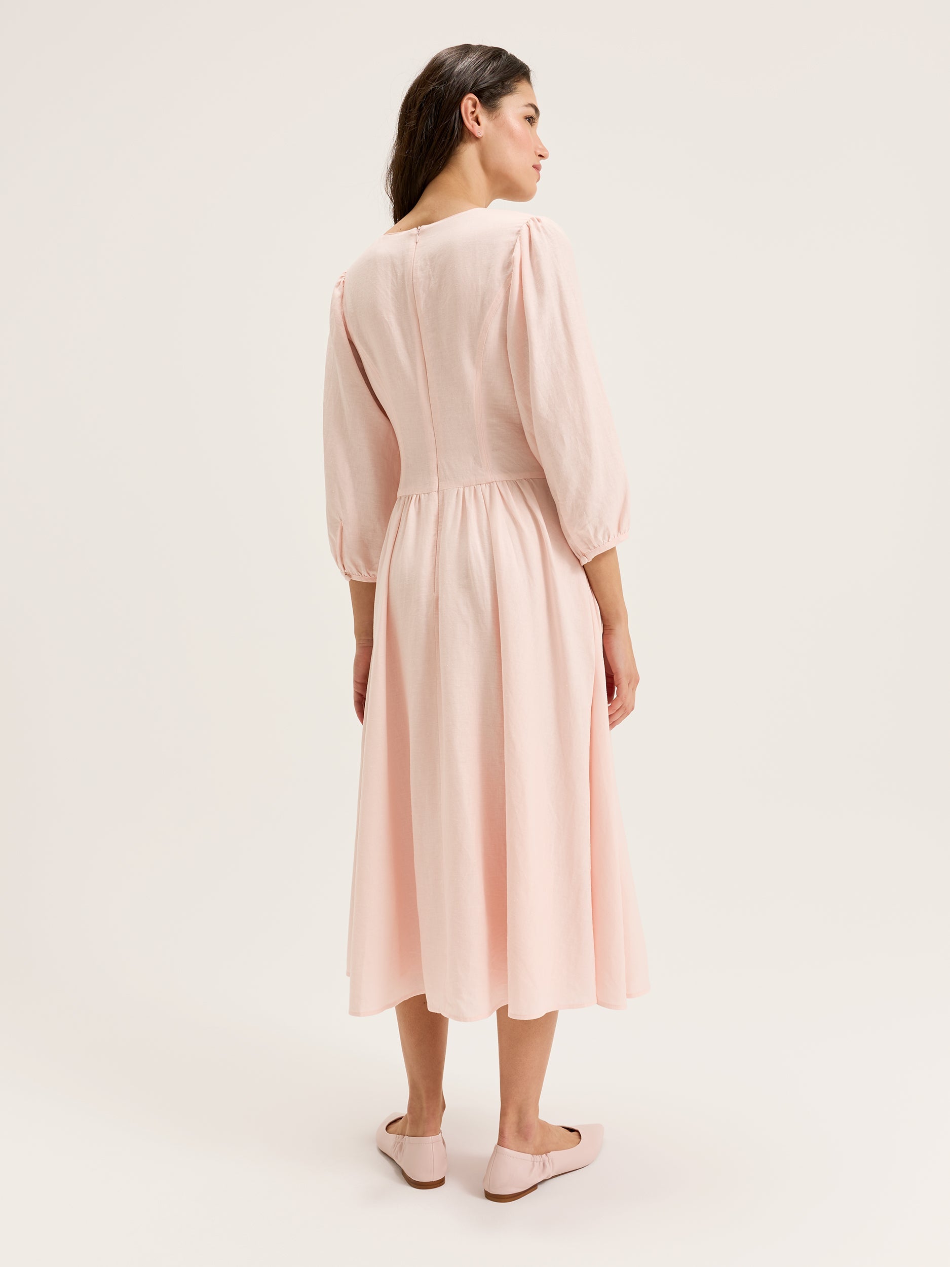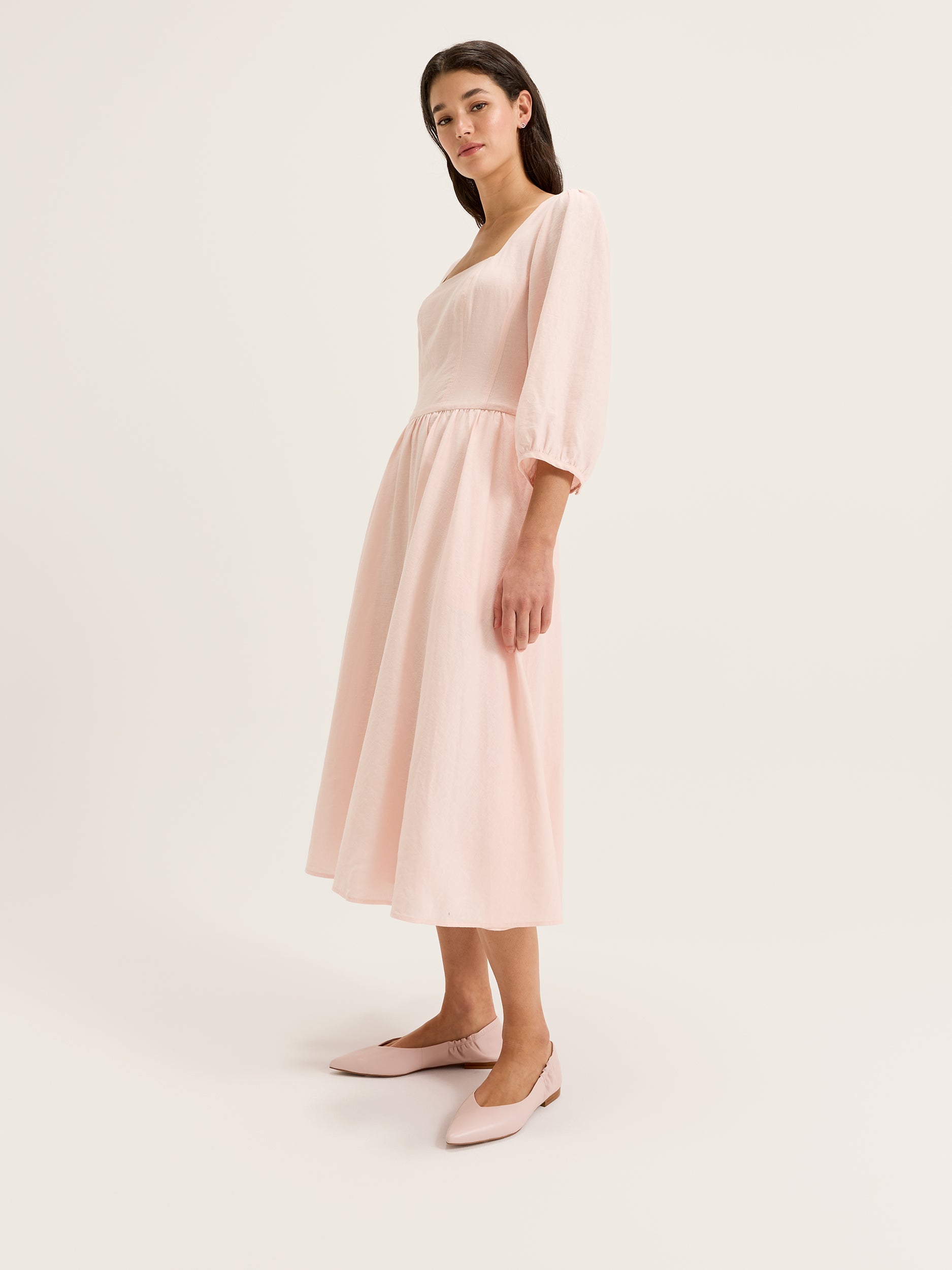 The Coppelia Midi Dress in soft pink is the vintage-inspired dress that'll have you turning heads. This sophisticated take on the viral cottagecore trend features a square neckline and 3/4 sleeves to accentuate its flattering midi length. Crafted with a quality linen-blend fabrication, the Coppelia Midi Dress is also fully lined with panelling through the bodice, making it just as supportive as it is stylish. Boasting intricate details like gathers in the sleeves and gathers in the skirt, this midi dress matches nearly any shoe, making it the perfect versatile piece for work or play.