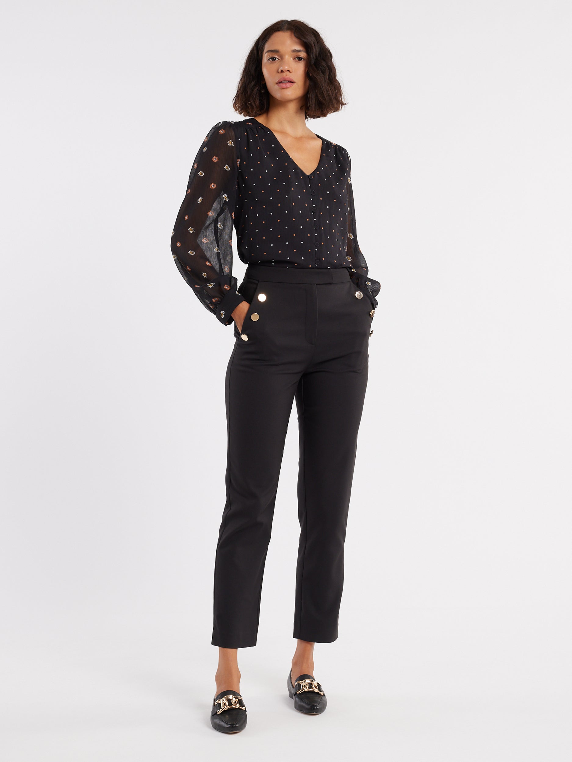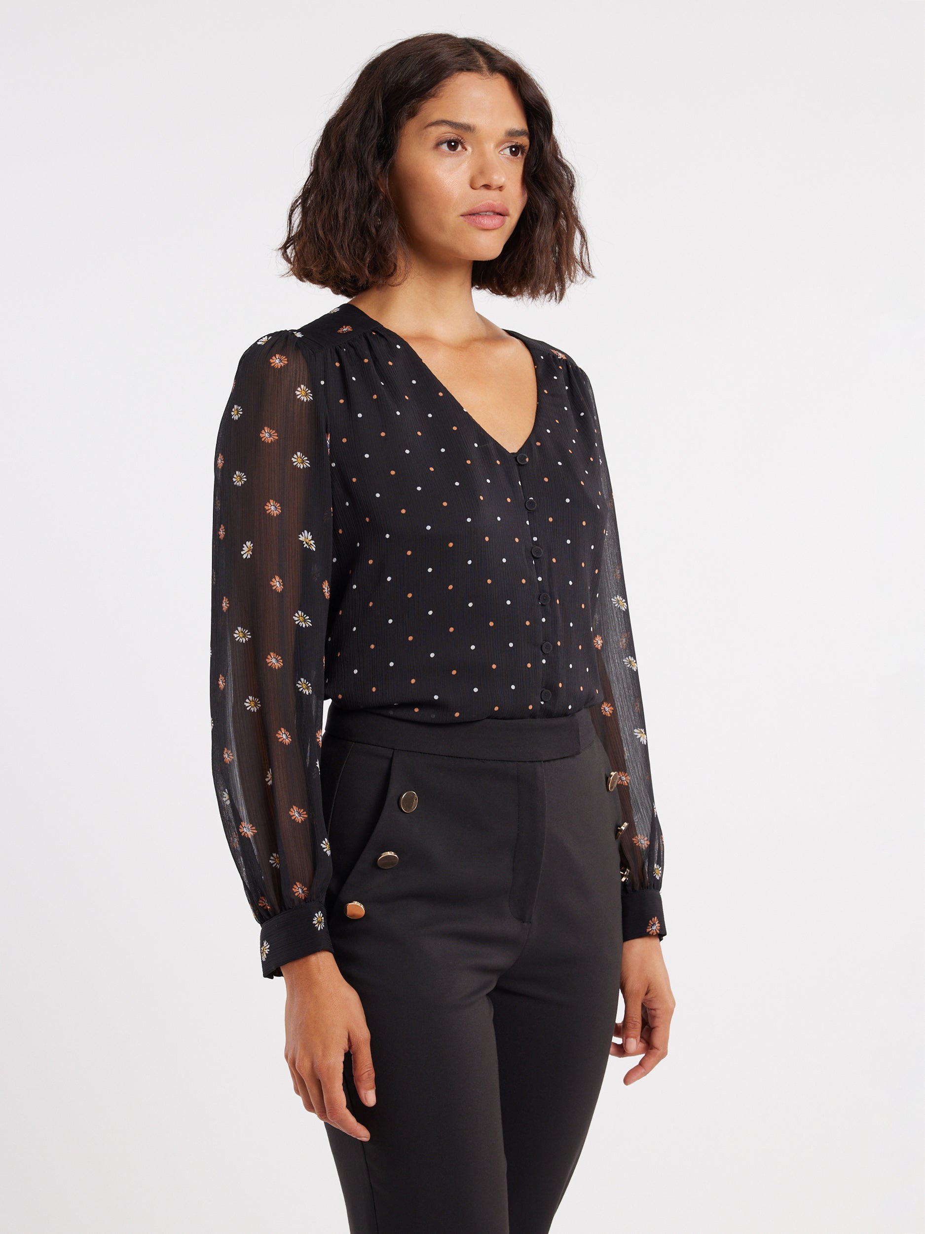 Feeling bored by your work clothes? We have the perfect remedy: our new Daisy Chain Blouse! This stunning top is the ideal piece for elevating your work wardrobe from drab to fab. Made of a lightweight georgette fabric, the Daisy Chain Blouse features a beautiful spot print on the bodice and a contrasting daisy print on the sleeves, has a slight crinkle texture, and a relaxed fit for tucking into your favourite work pants and skirts. The Daisy Chain Blouse is cut with a v-neckline, long sleeves, and a button front, a truly feminine and fashionable top for wearing throughout the season.