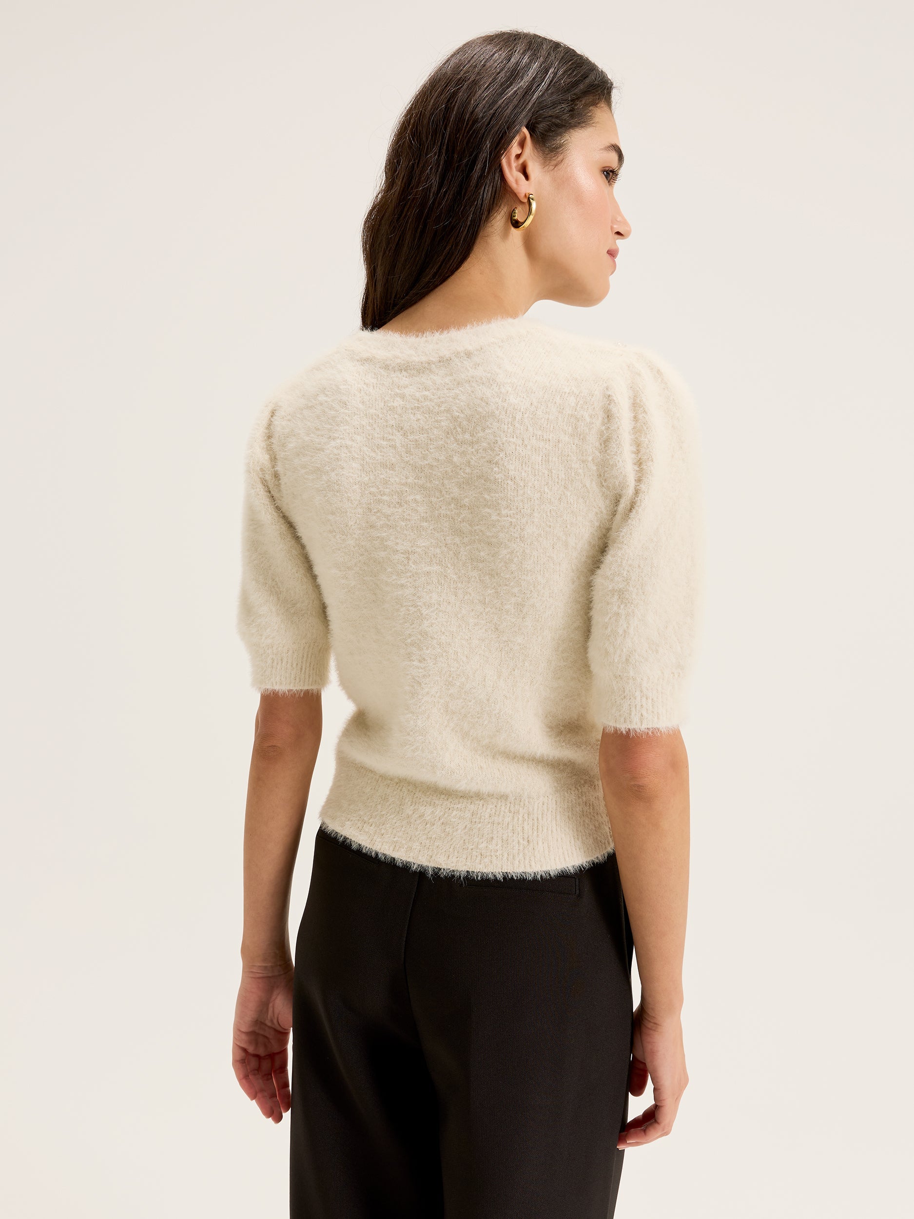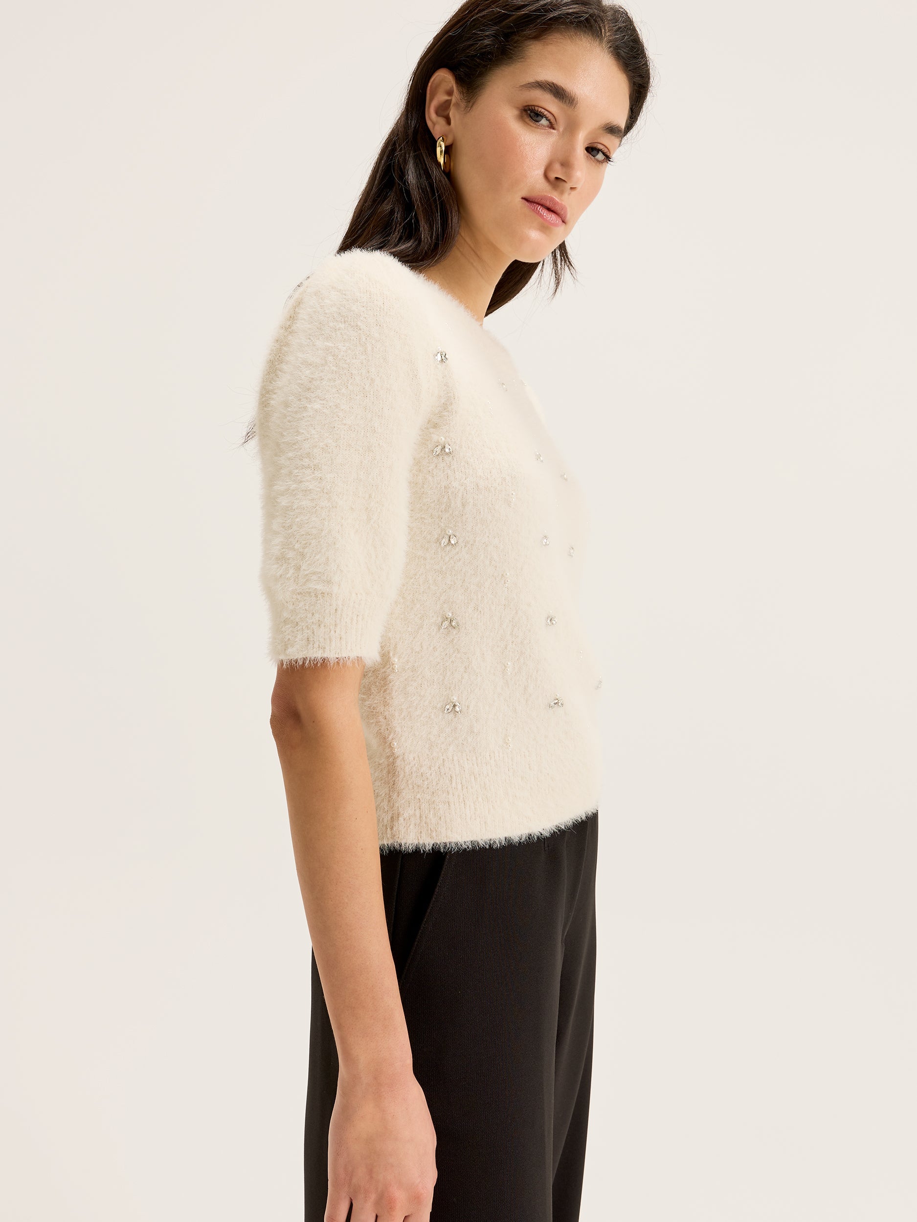 Elevate your everyday ensemble with our Diamonds & Pearls Knit Top, exquisitely crafted from luxurious eyelash yarn. Adorned with delicate jewel embellishments and featuring short sleeves, a shorter length design, and subtle gathering at the shoulders, it's a chic addition to your wardrobe in a soothing cream shade.