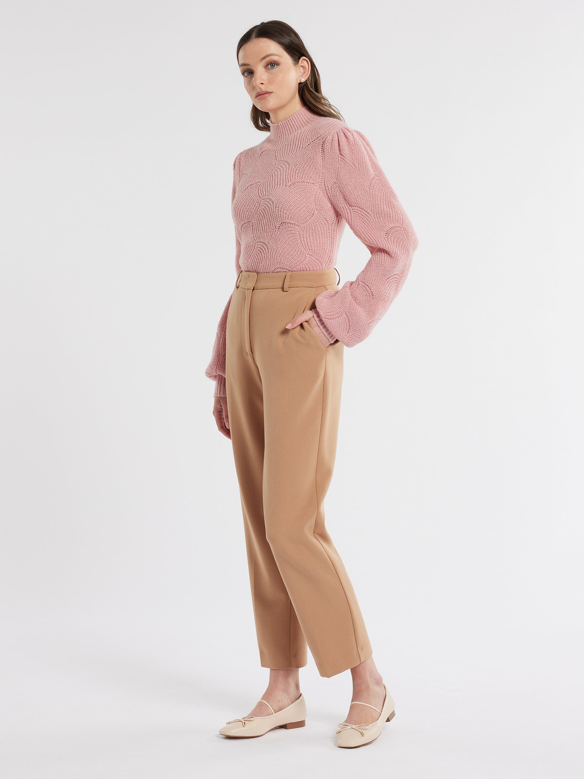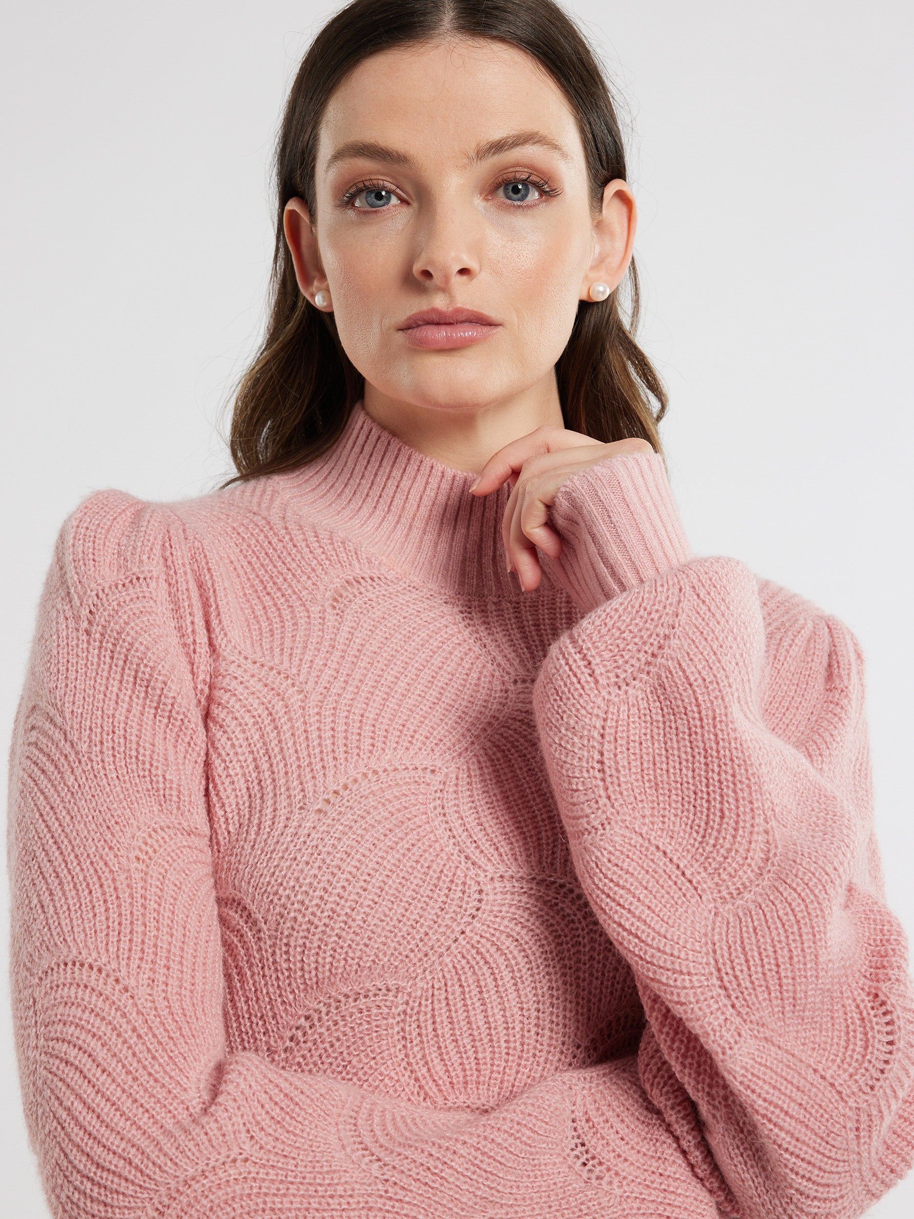 Unveil elegance with our Evelyn Jumper, blending sophistication and warmth seamlessly. Crafted from a luxurious mohair and wool blend yarn, it showcases a rib transfer stitch pattern and high neck, complemented by long sleeves with puff shoulders and a deep rib cuff trim.