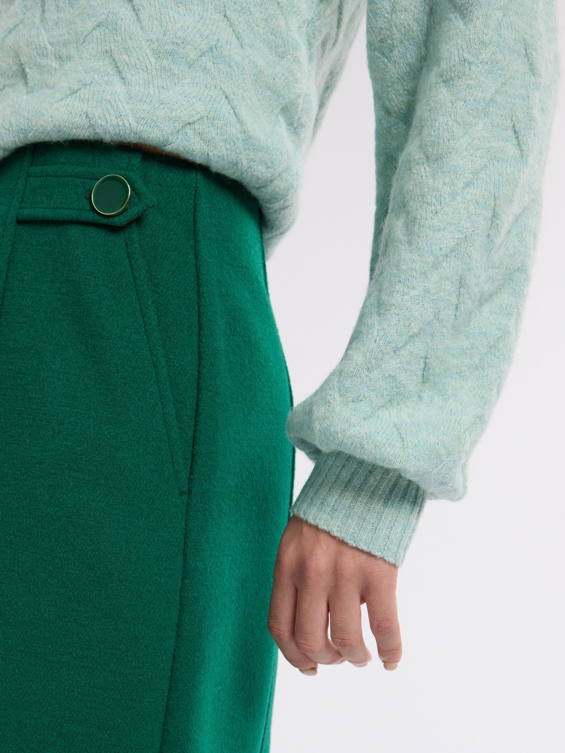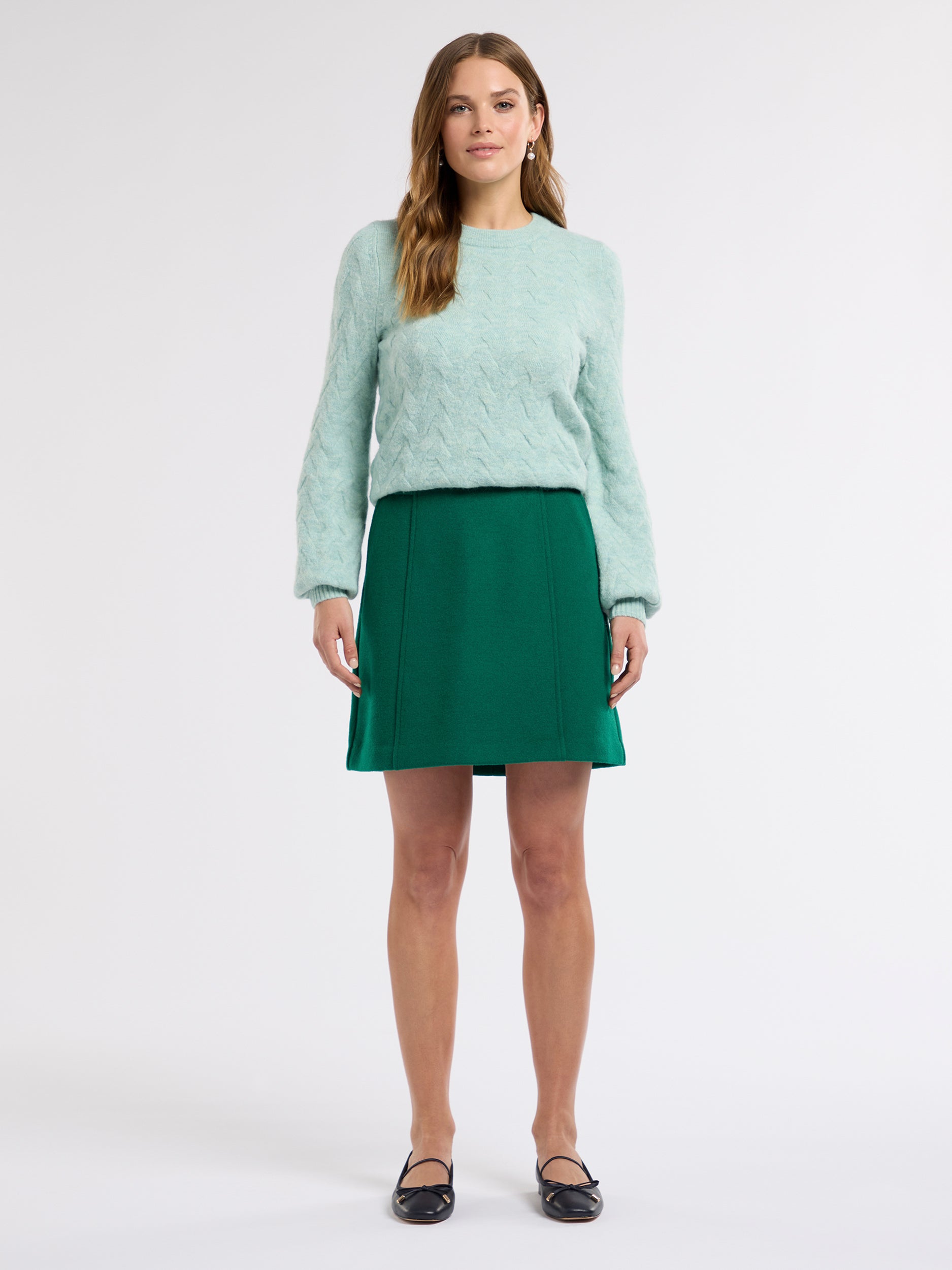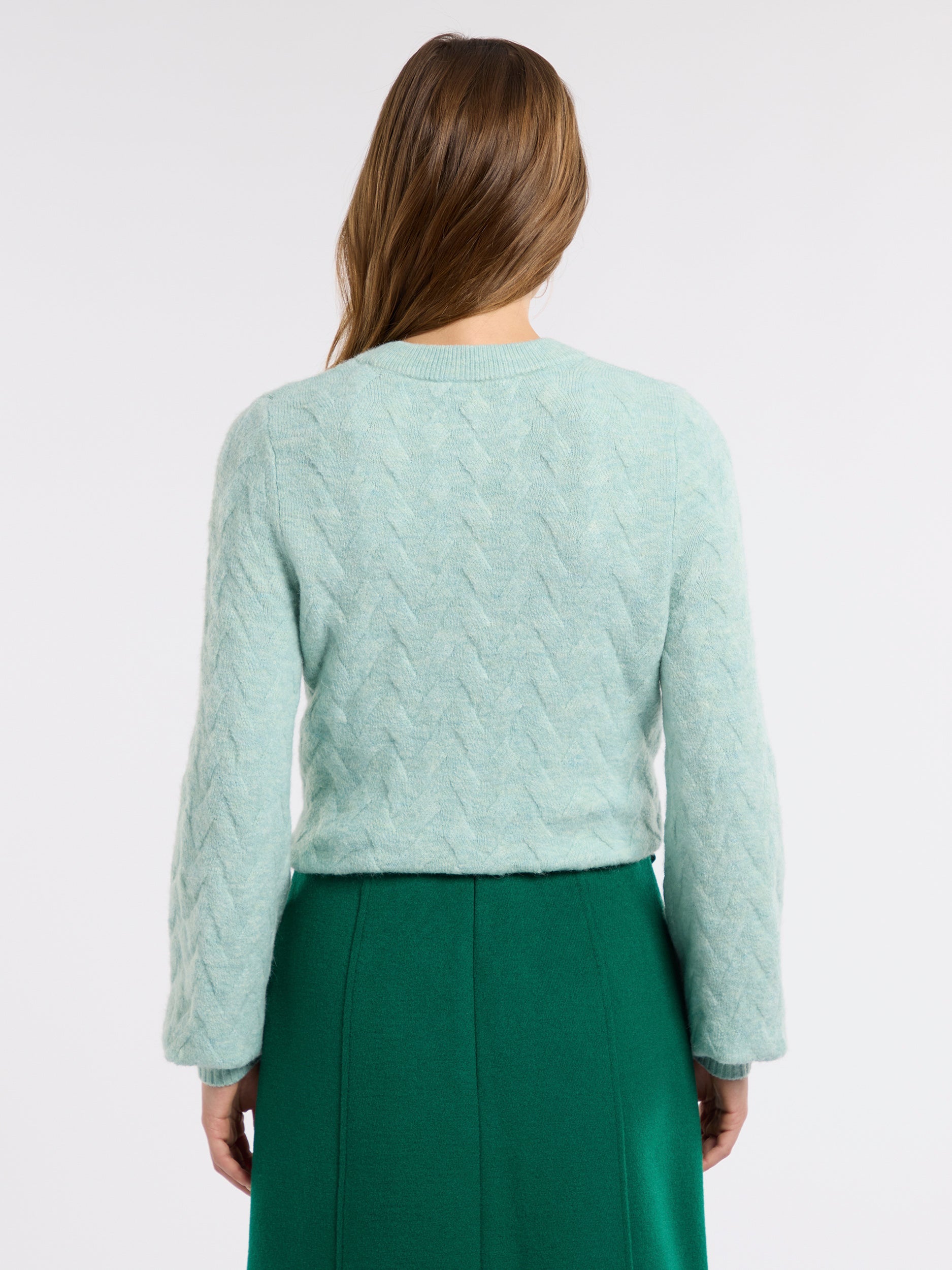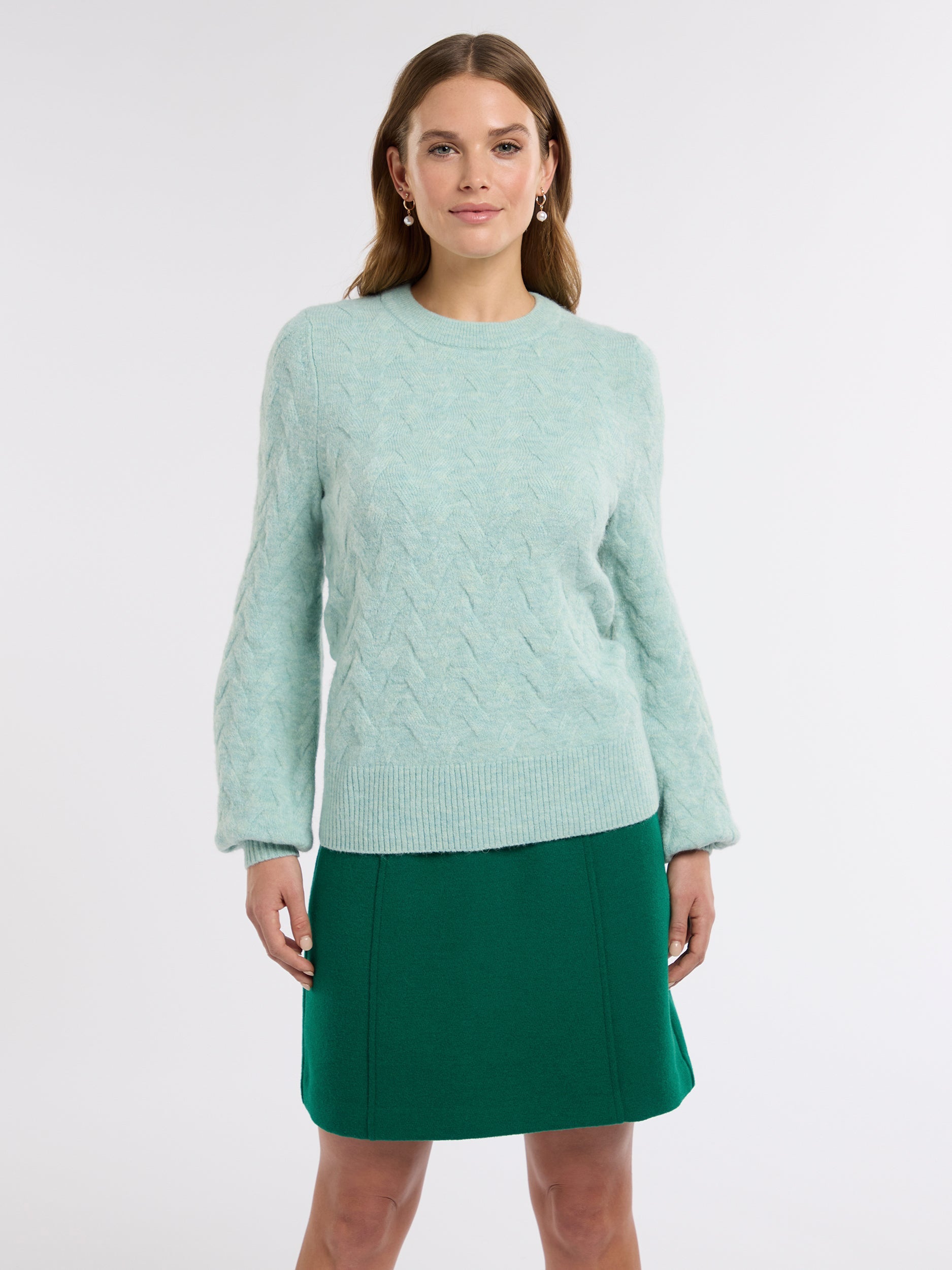 Indulge in the Florentine Jumper, showcasing a cable stitch design in a serene mint shade. Crafted from a warm wool and alpaca blend, its textured yarn offers cozy elegance. The crew neck, hip-length silhouette, and ribbed finishes on the neckline, cuffs, and hemline complete this timeless piece.