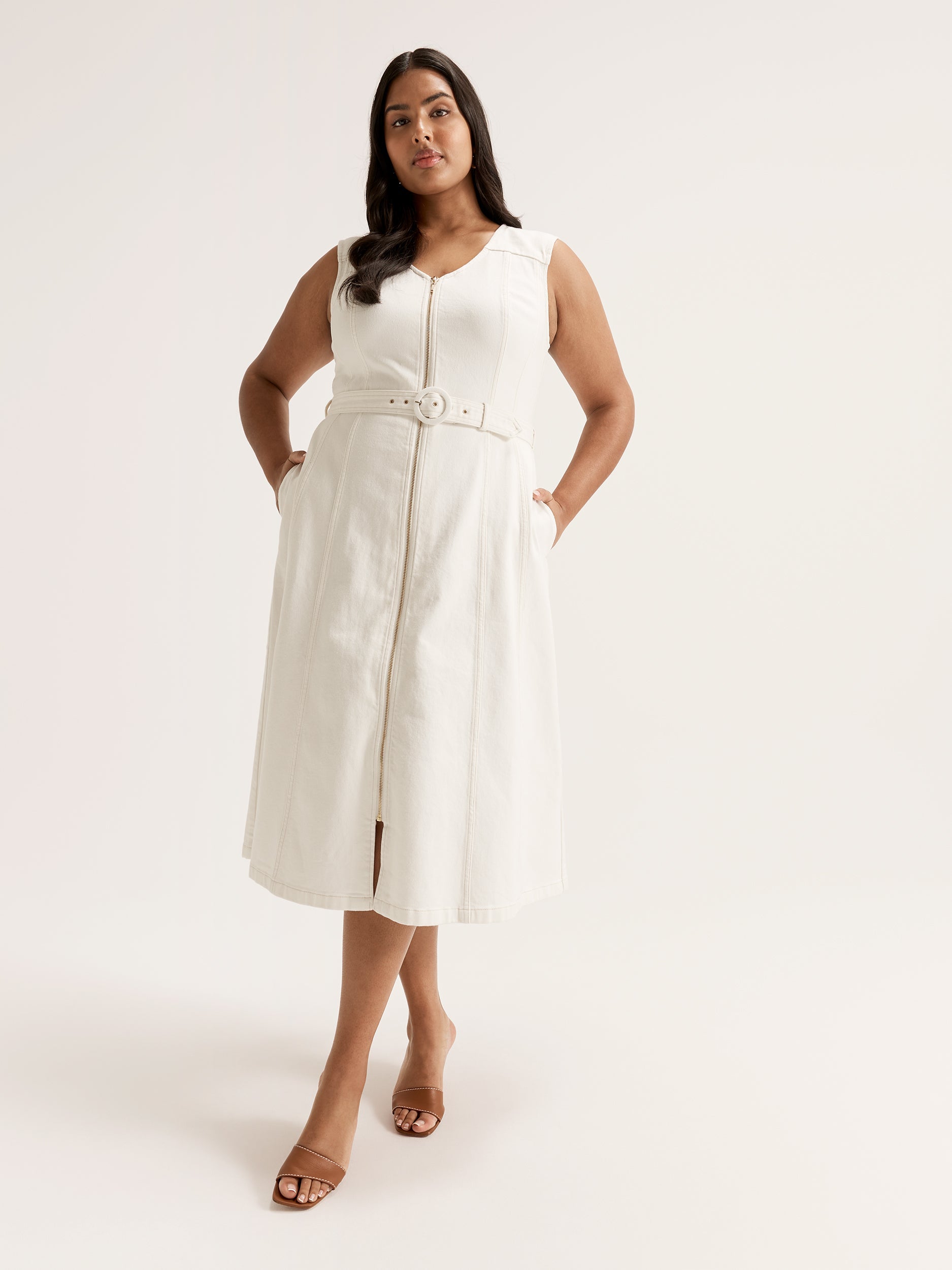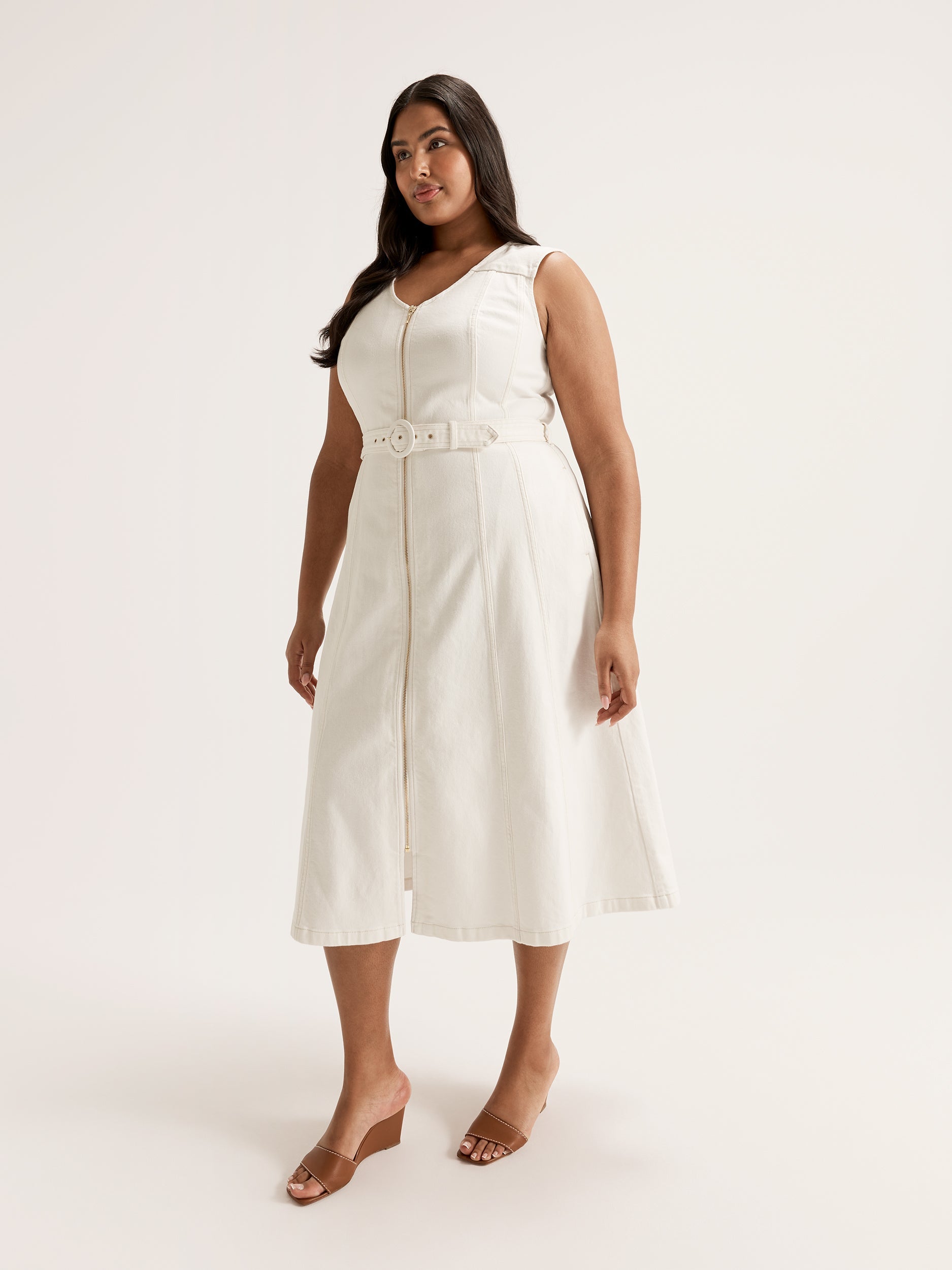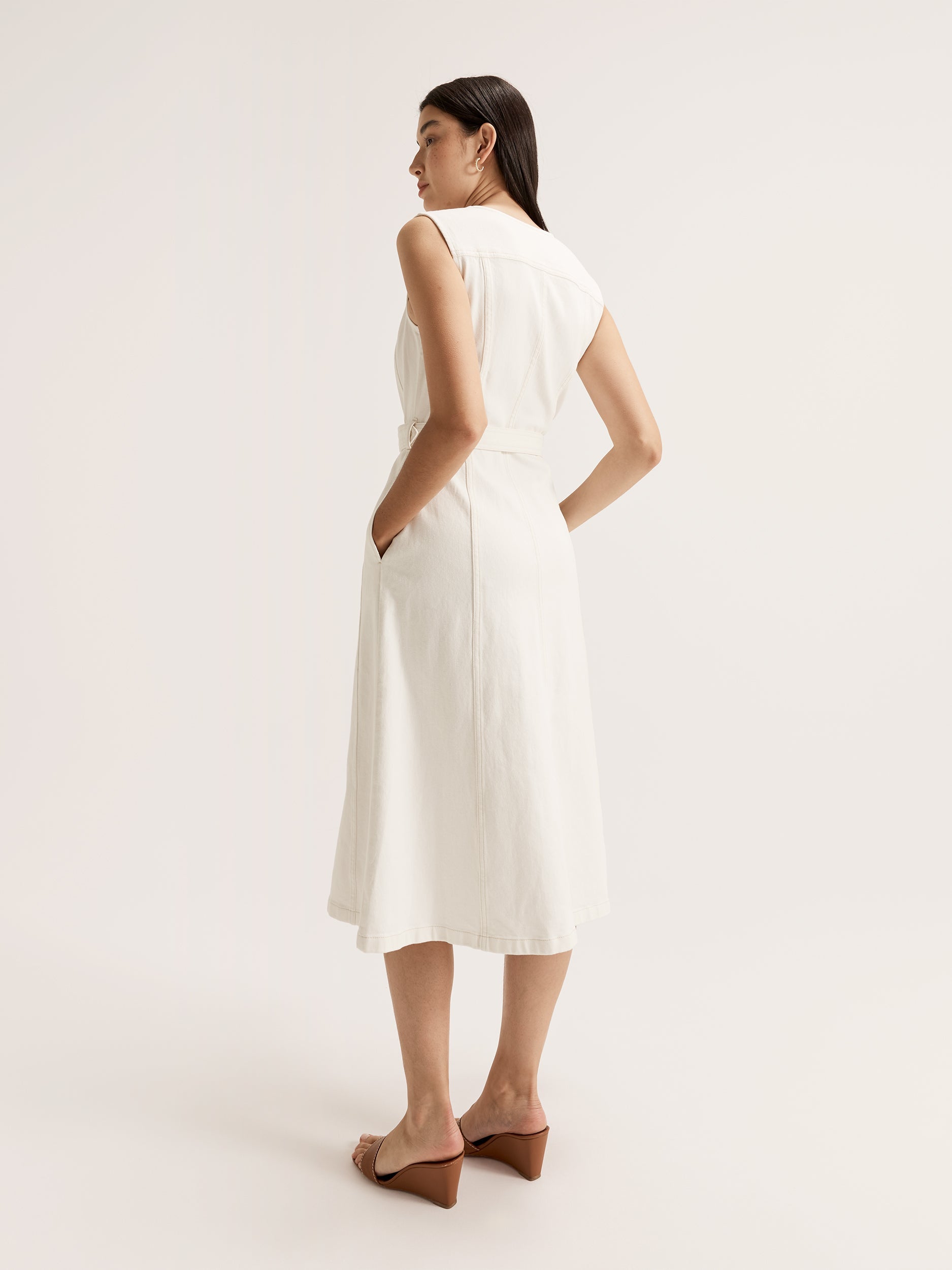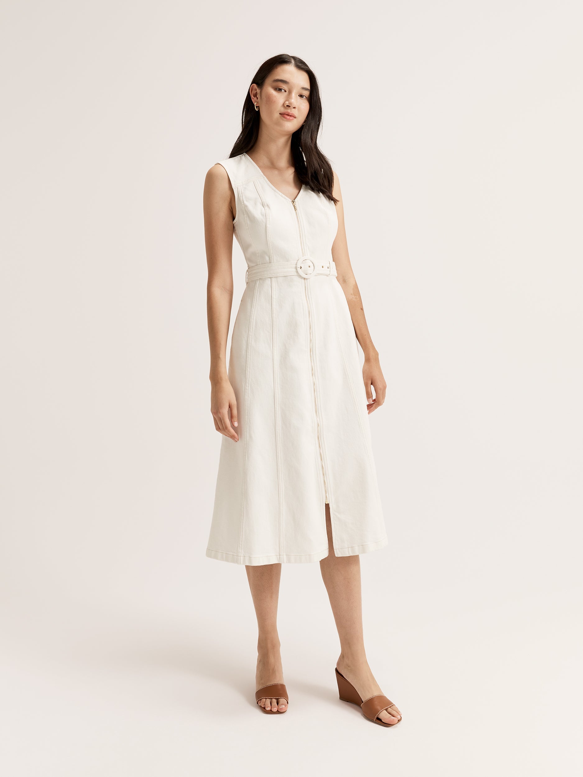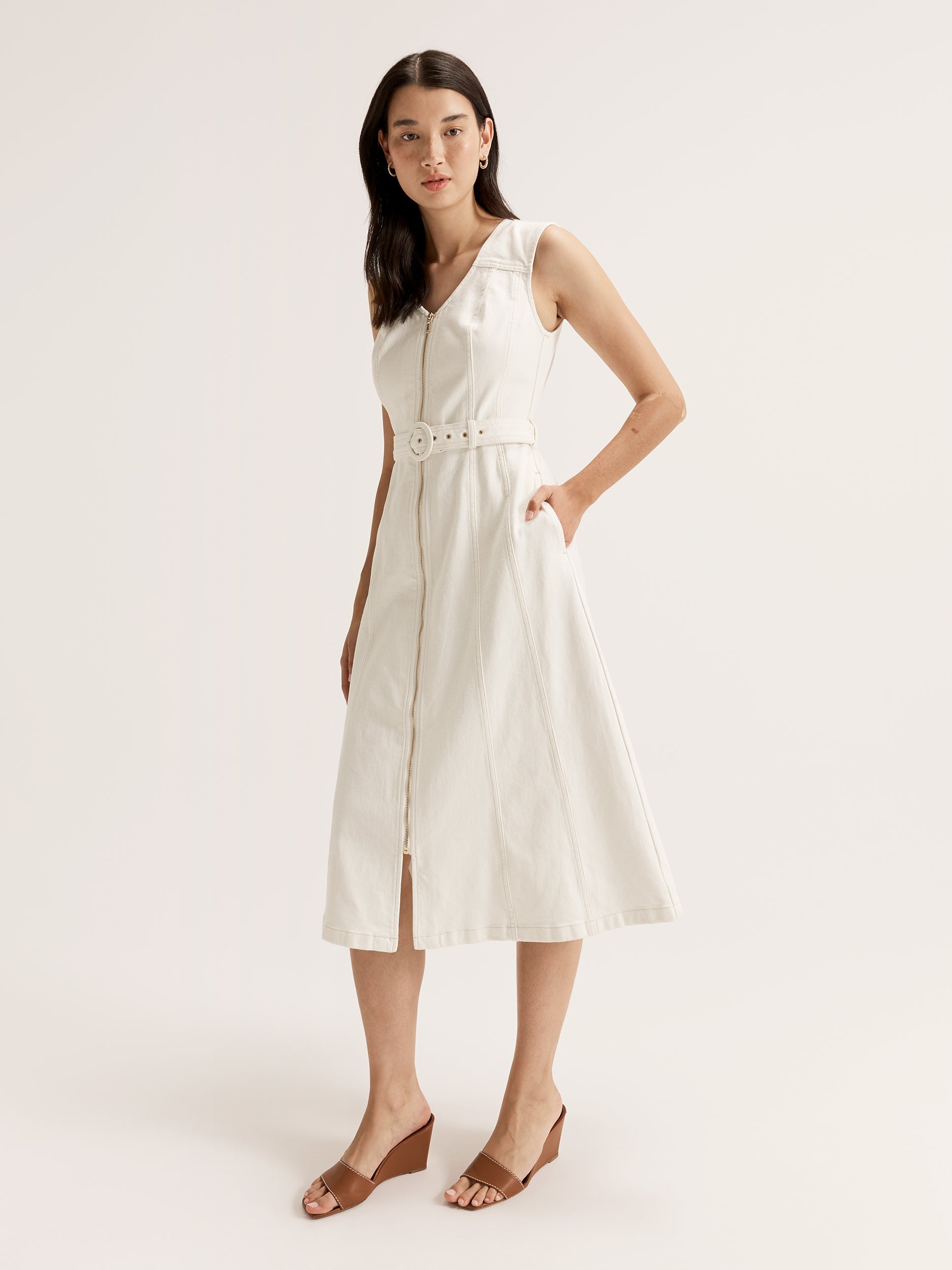 Casual, comfortable, yet effortlessly chic, the Gigi Denim Dress is a must-have piece for elevating your wardrobe this season. Made from our signature stretch cotton denim, the Gigi Denim Dress is an absolute dream to wear, with a soft lining and structured fit that is designed to flatter any body shape. Cut to a midi length, the Gigi Denim Dress has a v-neckline and sleeveless bodice, full zip closure down the front, and a self-fabric belt to cinch in the waist. Made in a cool, light ecru colour, the Gigi Denim Dress features contrast stitch and panel detailing throughout. Style for weekends out on the town with a pair of comfy tennis shoes and a printed neck scarf, or style for date night with a pair of patent leather heels and a matching handbag.