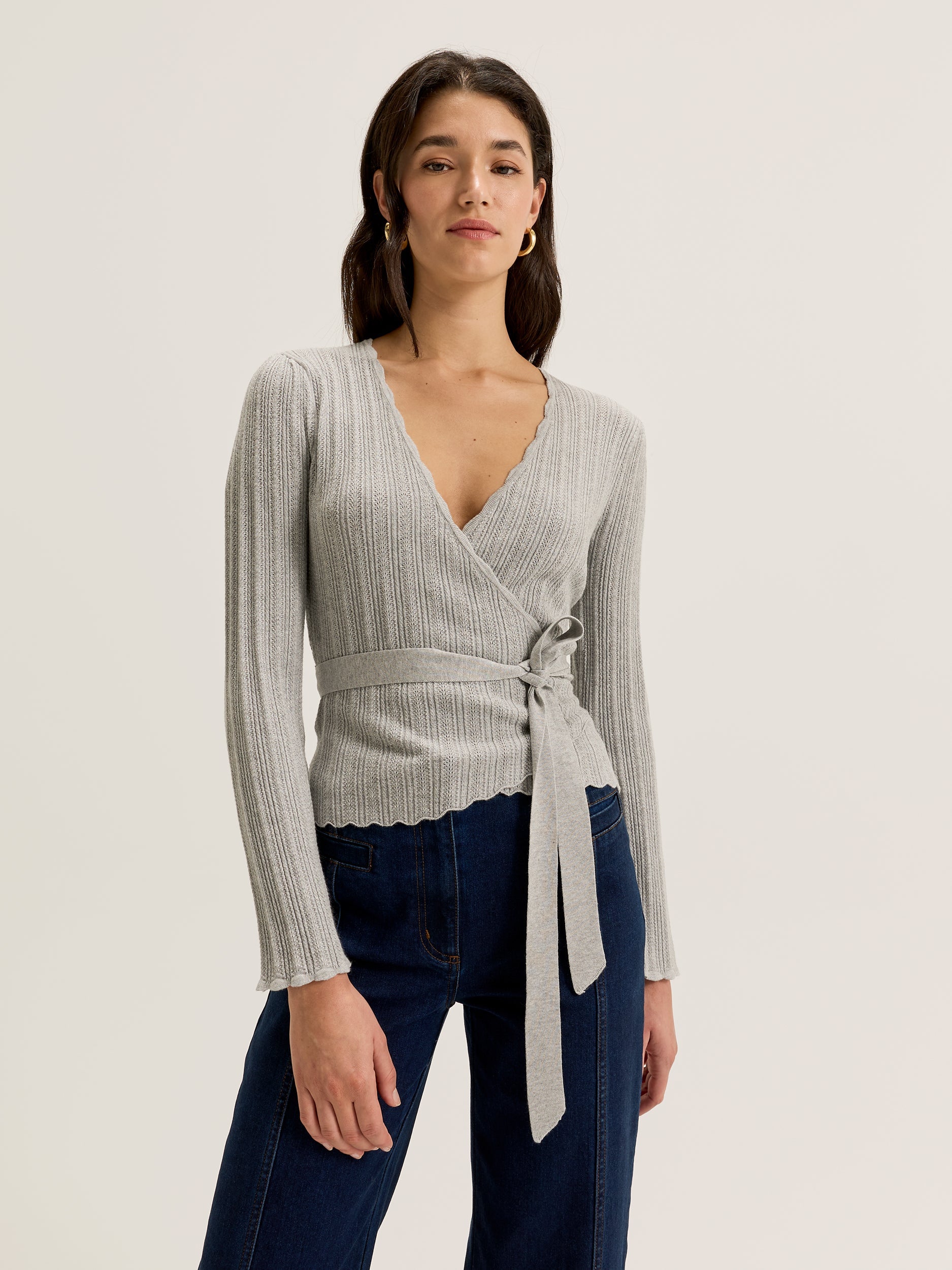 The Giselle Wrap Cardi in grey features a lightweight, delicate pointelle stitch in a yarn blend fabrication. This true functional wrap cardi showcases a v-neckline with scallop detailing along the neck, hem, and cuffs. Hip-length for versatile styling.