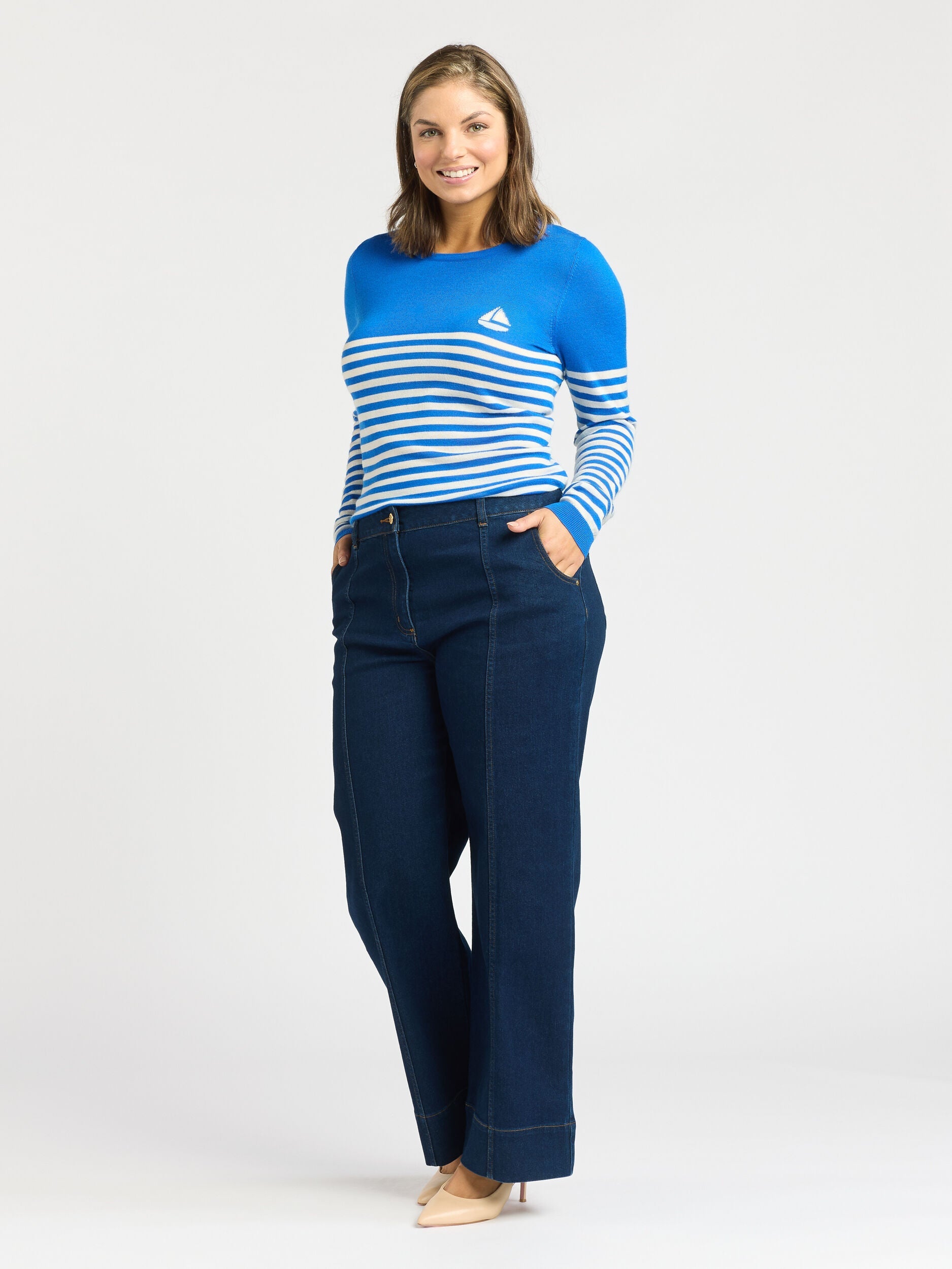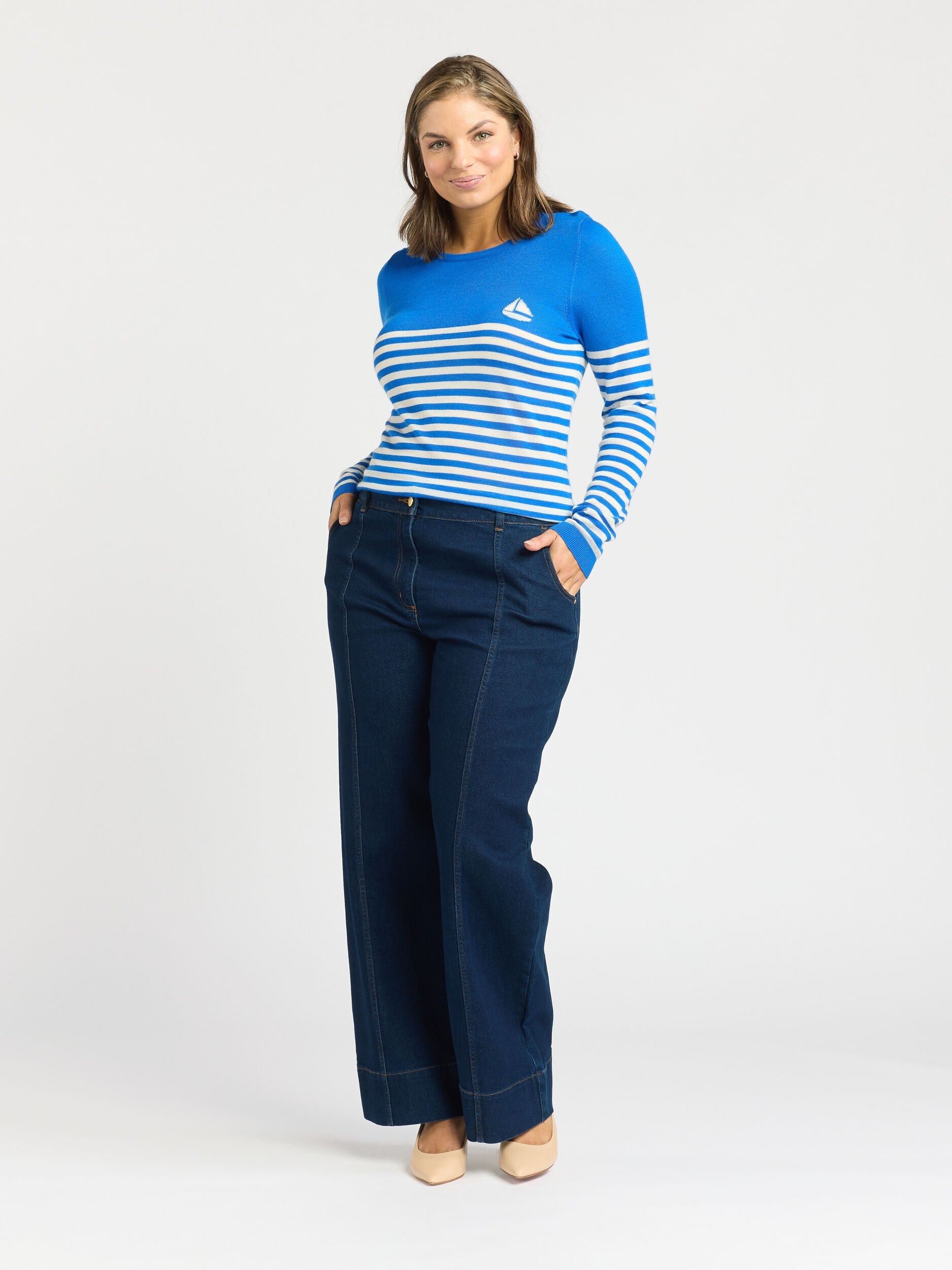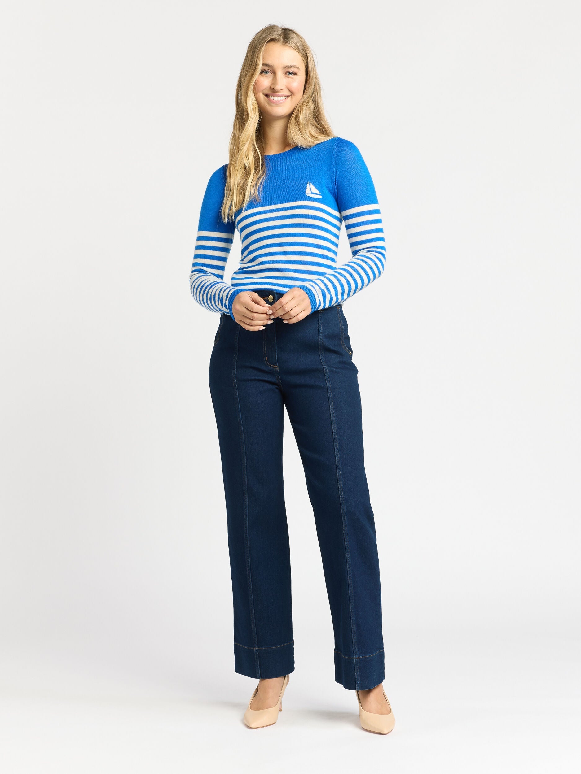 Elevate your knitwear collection with our Harbour Jumper. Crafted from 100% merino wool, this jumper showcases a captivating cobalt blue and ivory stripe design. The playful sail boat feature adds a whimsical touch, while the long sleeves with rib cuffs provide both style and warmth.