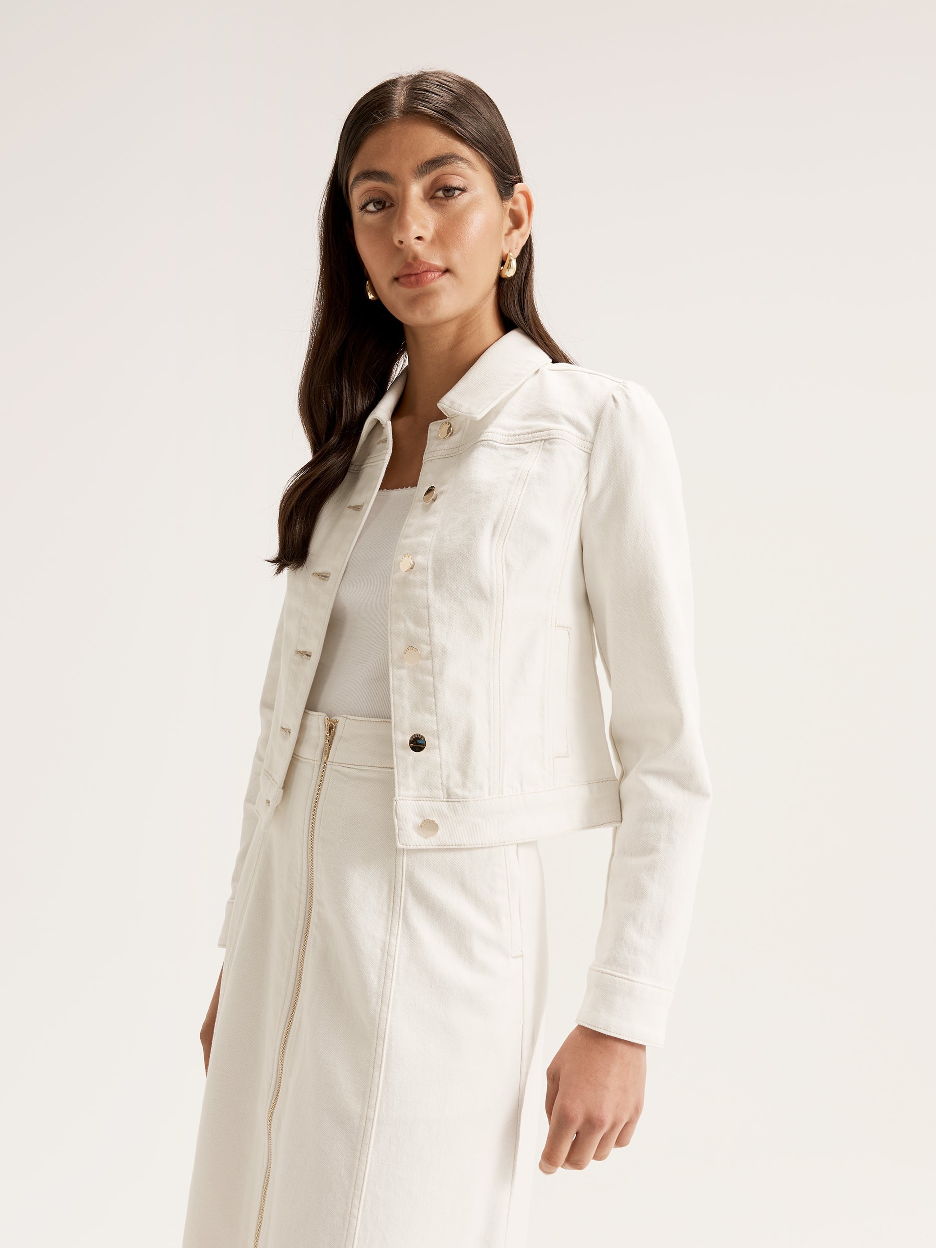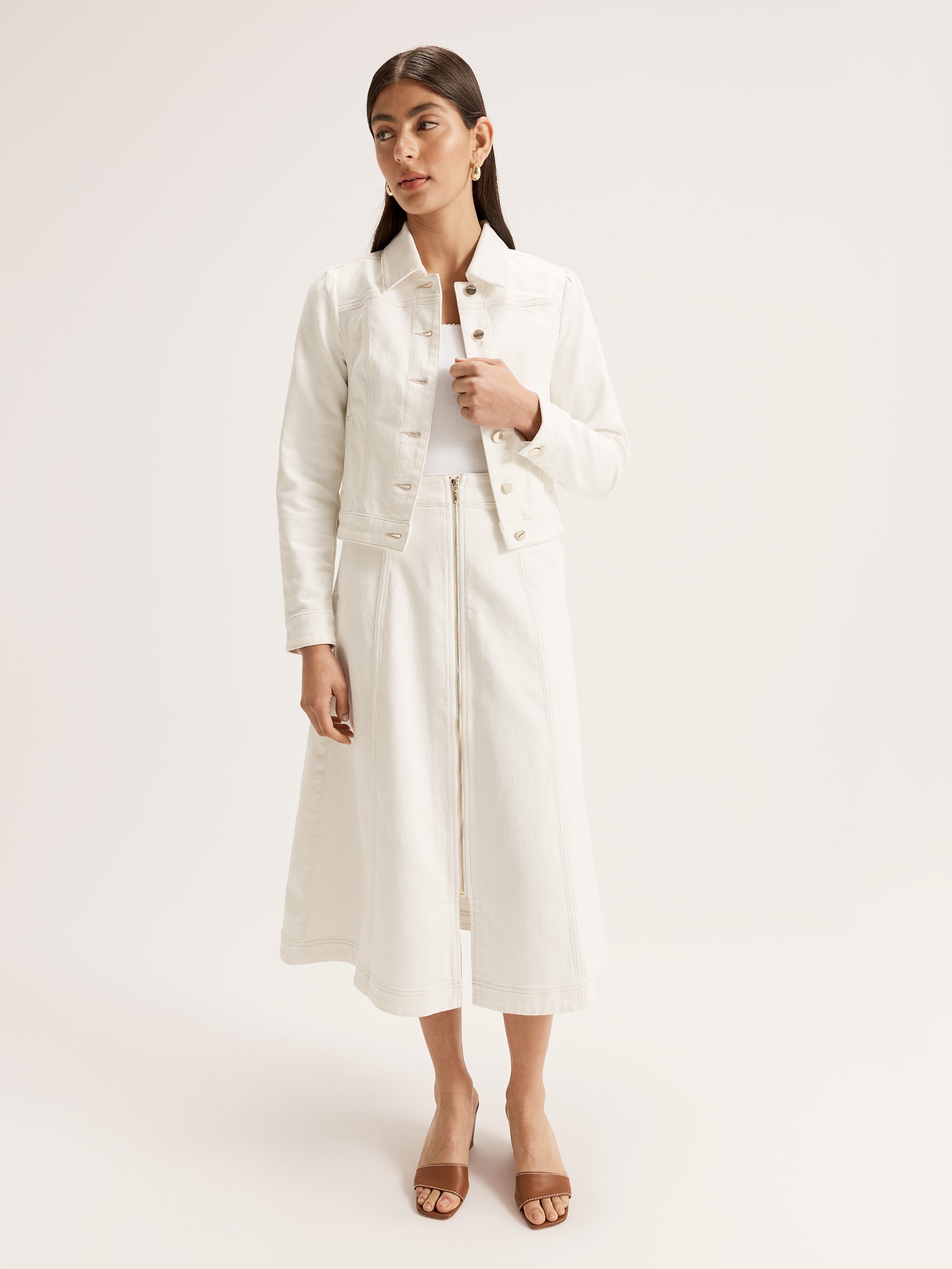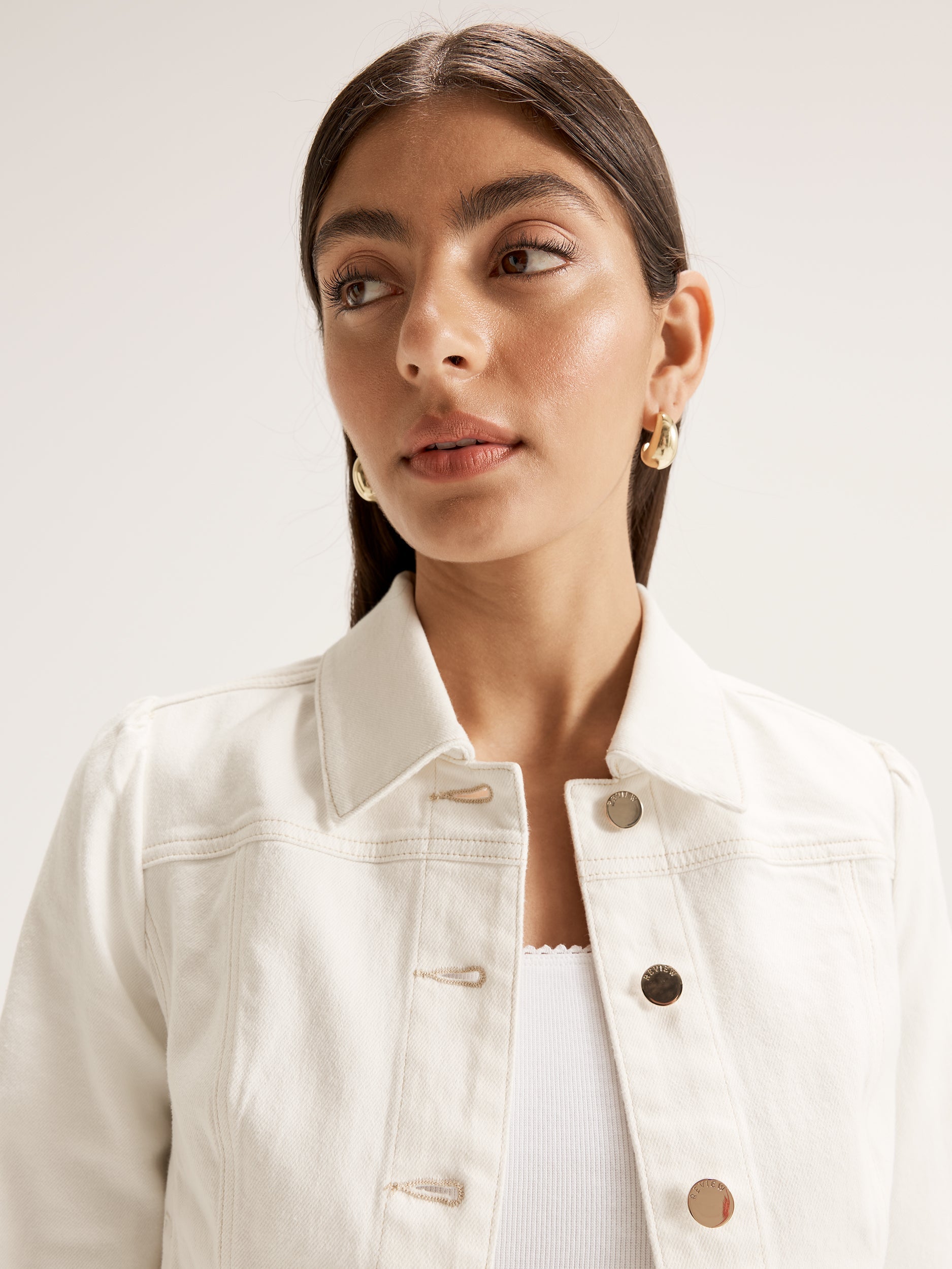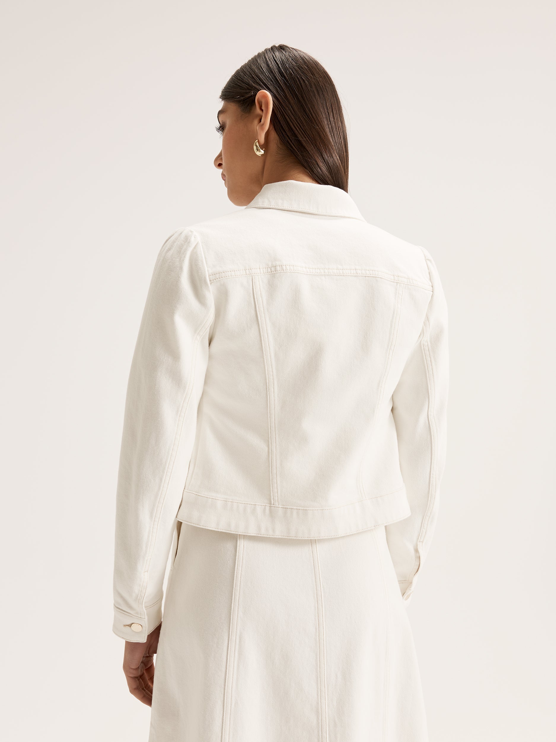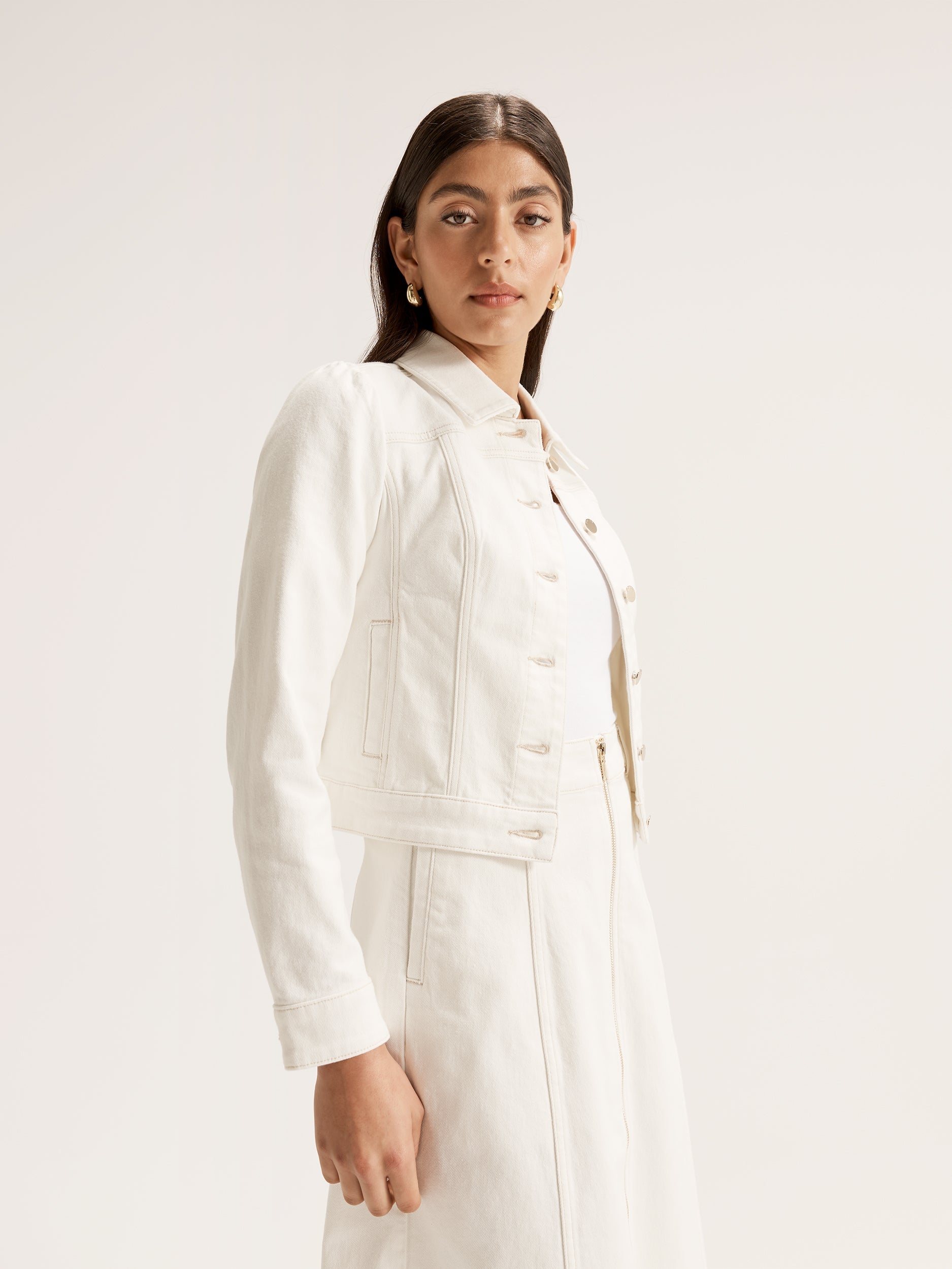 Another fresh take on classic denim, the Jagger Denim Jacket will take your spring and summer wardrobe to new heights. Made with our soft stretch cotton fabric, the Jagger Denim Jacket is a classic trucker jacket style with collared neckline, button front, and contrast stitch detailing throughout. Complete with front pockets and Review branding on the buttons, the true standout detail of this jacket is the soft, light ecru colour that adds a freshness to your wardrobe. Style with your favourite blue jeans, floral dresses, or match with the stunning Gigi Denim Skirt!
