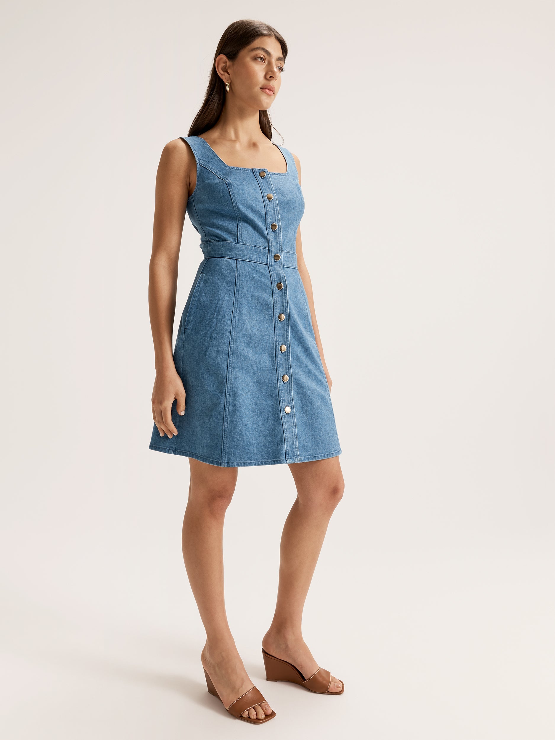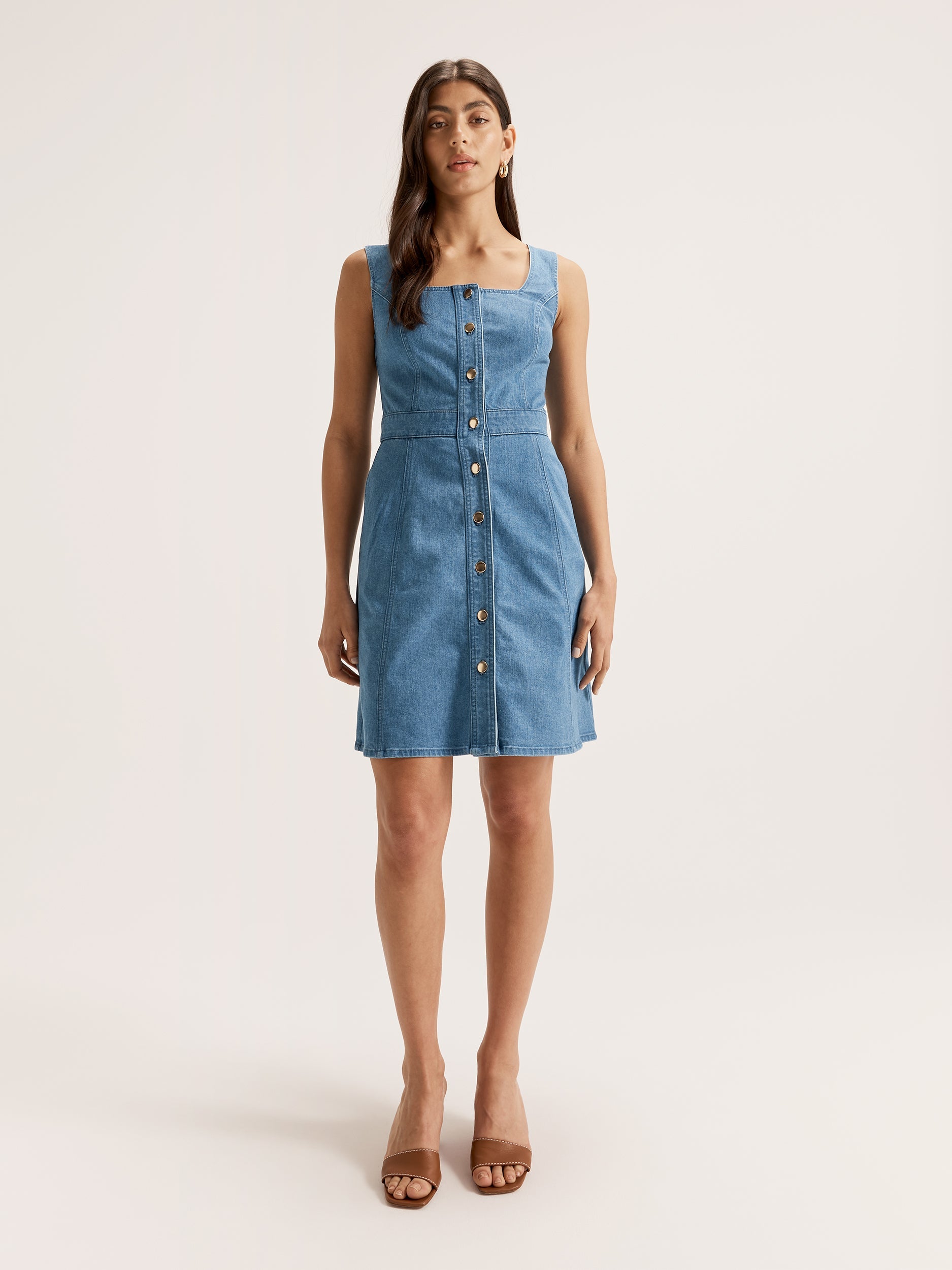 When you need to keep it casual but don’t want to sacrifice your style, the Jagger Short Denim Dress is the perfect choice. Made from our signature stretch cotton denim, the Jagger Denim Dress is super comfortable, with a soft lining and structured fit that is designed to flatter any body shape. With a vintage blue wash, the Jagger Denim Dress leans into the funky style of the 70s with gold stud buttons down the front and a flattering square neckline complete with handy side pockets. A versatile dress for styling in any season, layer the Jagger Denim Dress over tights and a printed blouse for a modest or cold weather outfit, or soak up the summer sun with sandals and a chic hat.