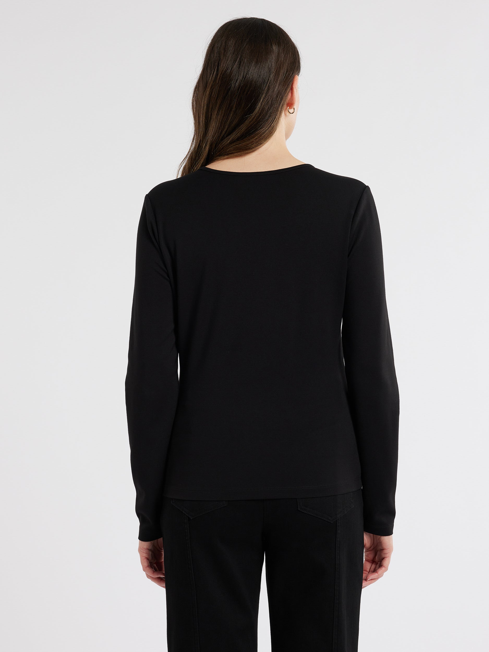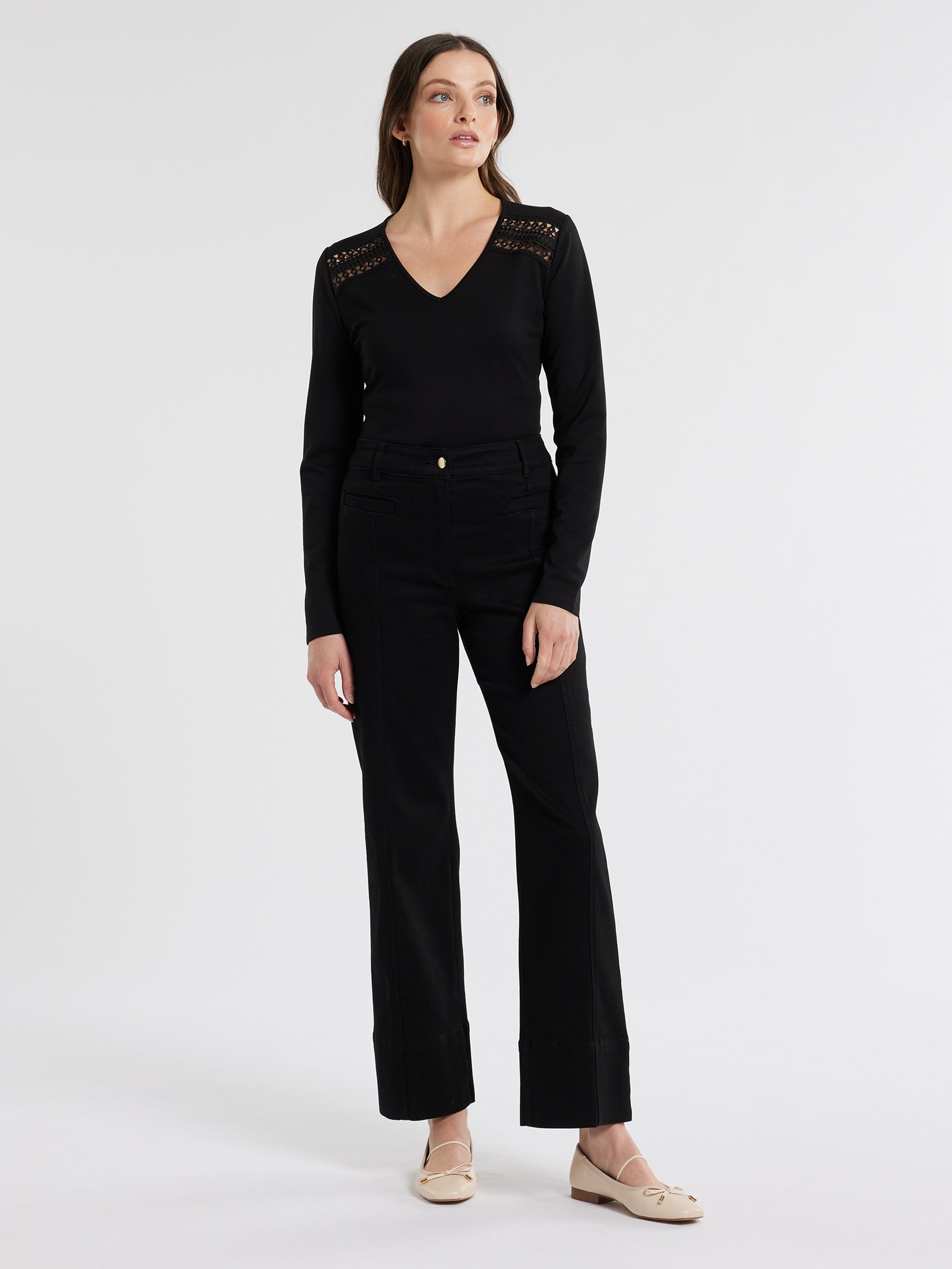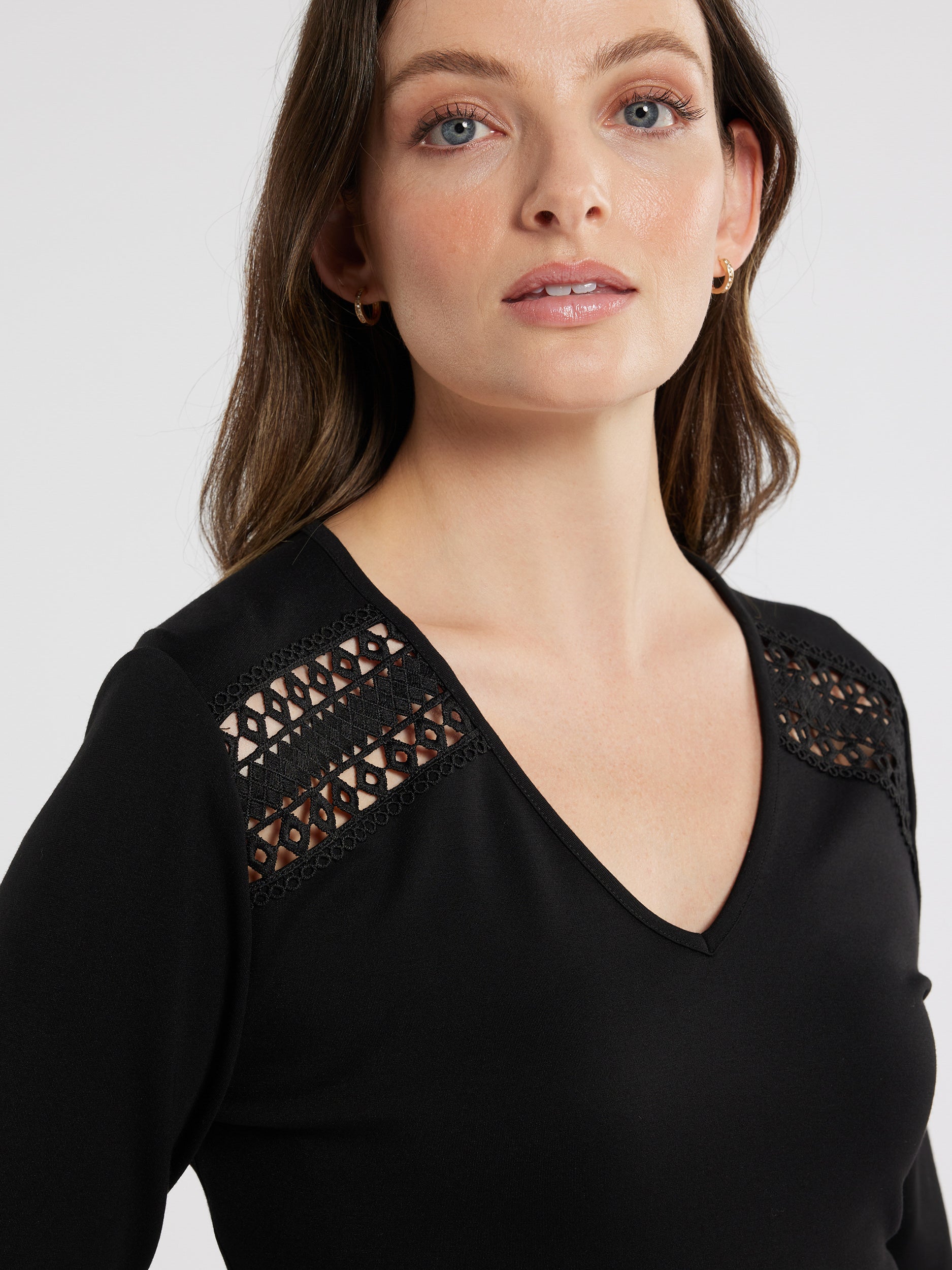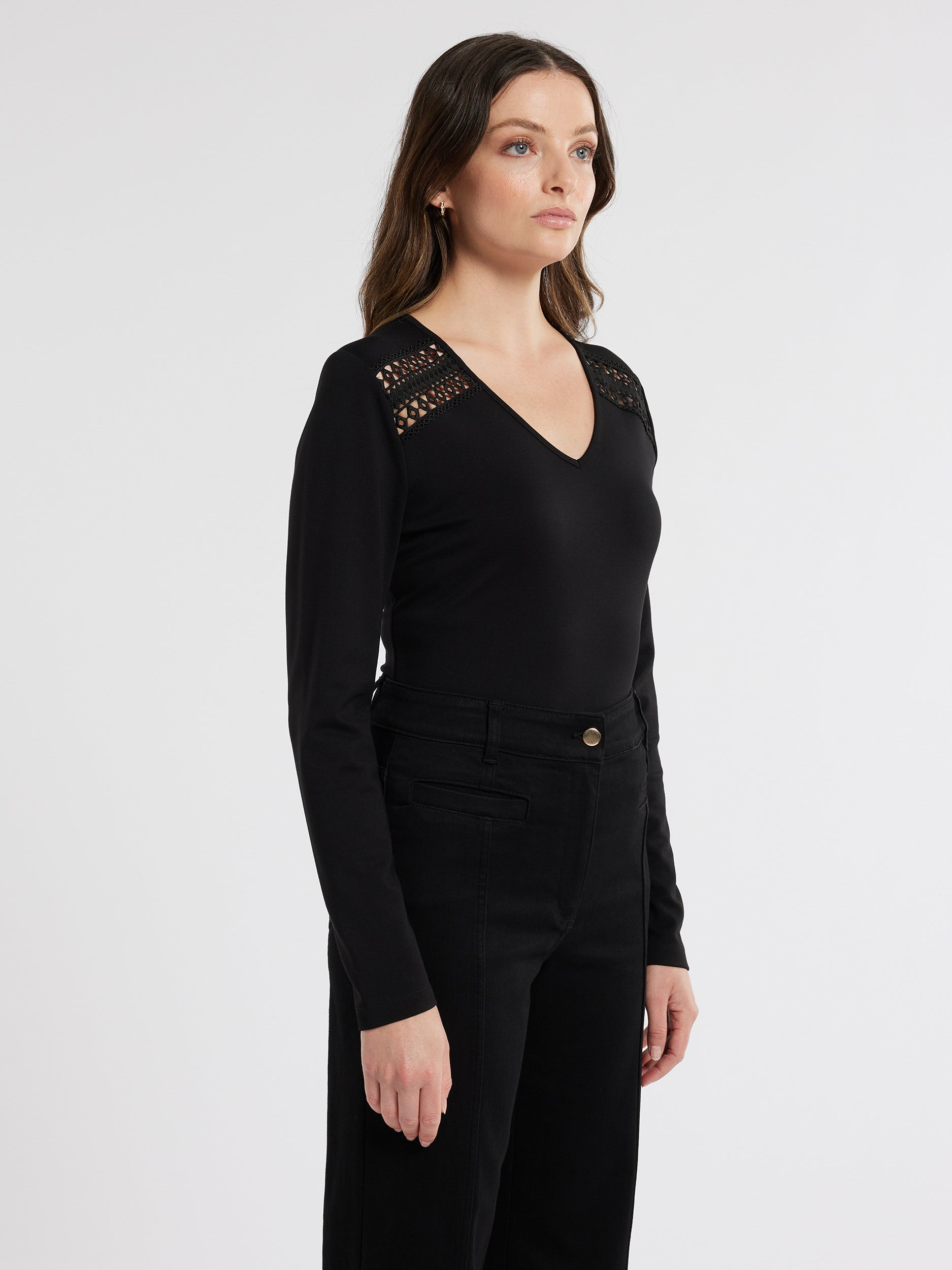 The Julianna Top in black combines timeless elegance and modern charm. Crafted from soft ponte fabric, it features long sleeves, a V-neck, and delicate lace insert detail below the shoulder. This fitted, hip-length piece effortlessly enhances any wardrobe, making it a versatile choice for day or night.