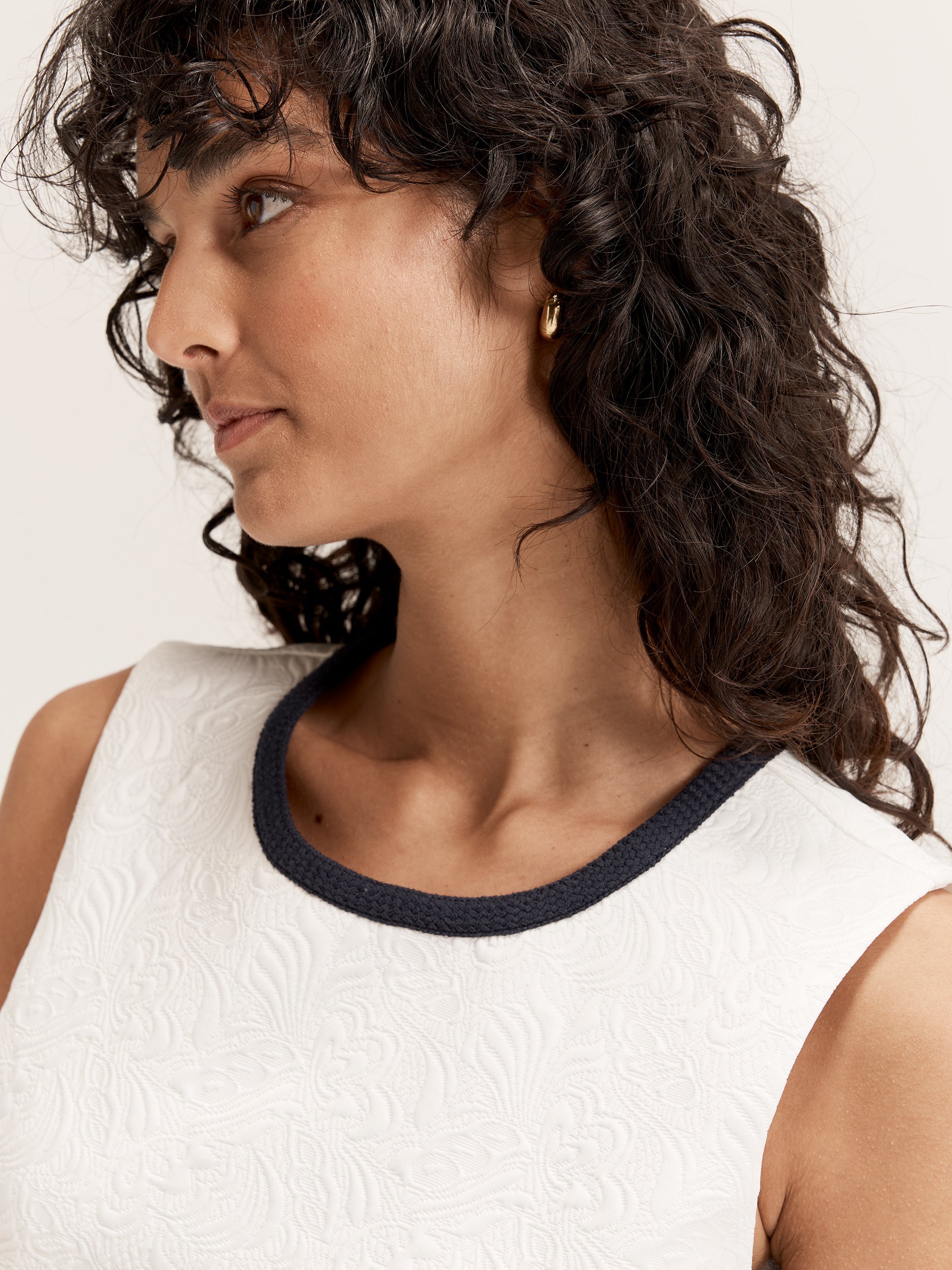 The Kaia Shift Dress in ivory features a contrast neckline with braided trim and a dimensional matelassé jacquard fabric. This sleeveless dress has a crew neck, panelling detail, and a fitted waist. With an above-knee length, center back zip, and pockets, it matches perfectly with the Kaia Jacket.