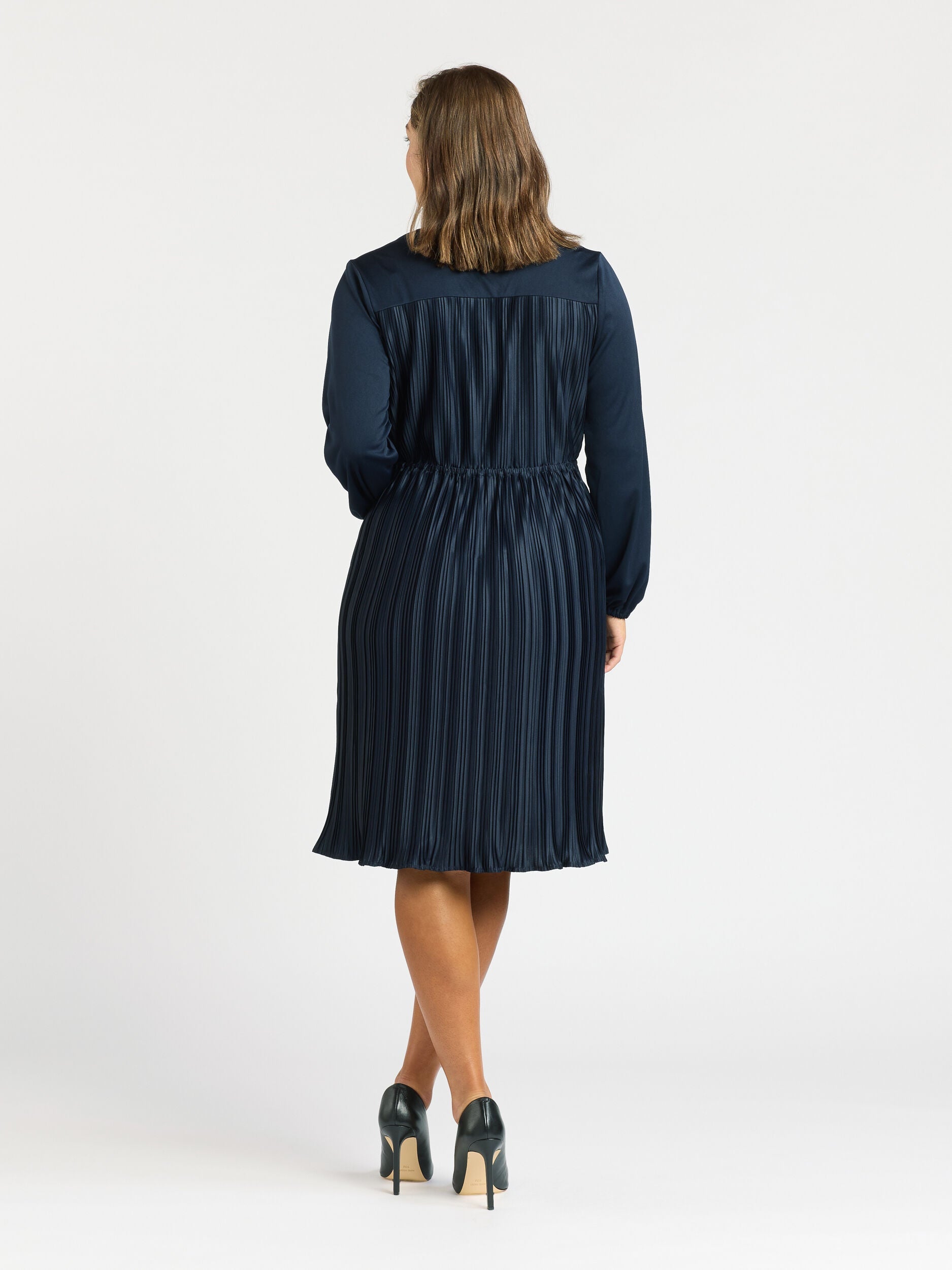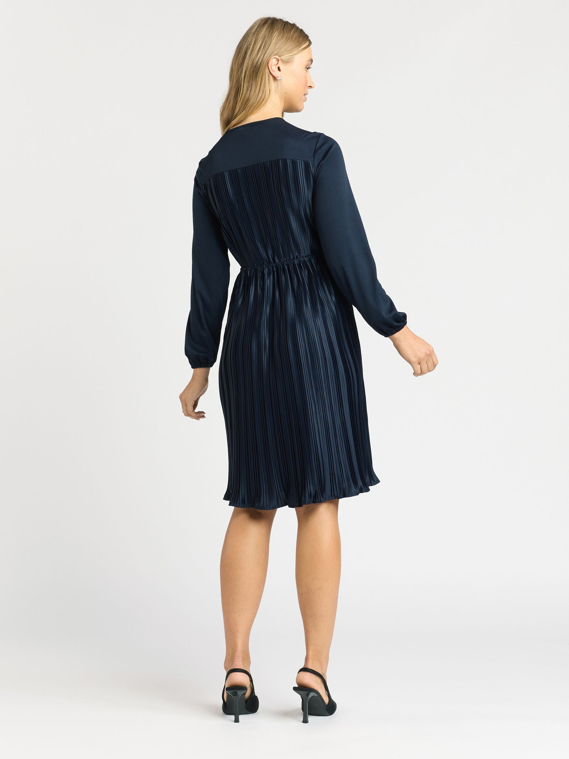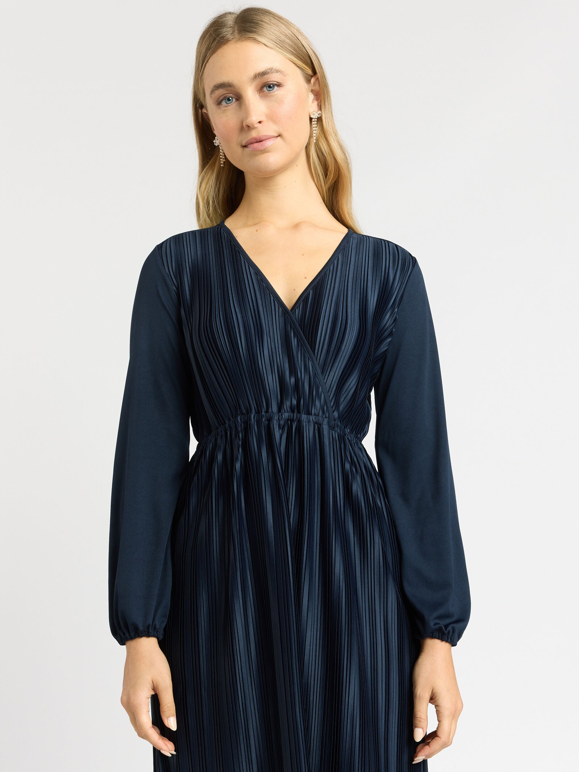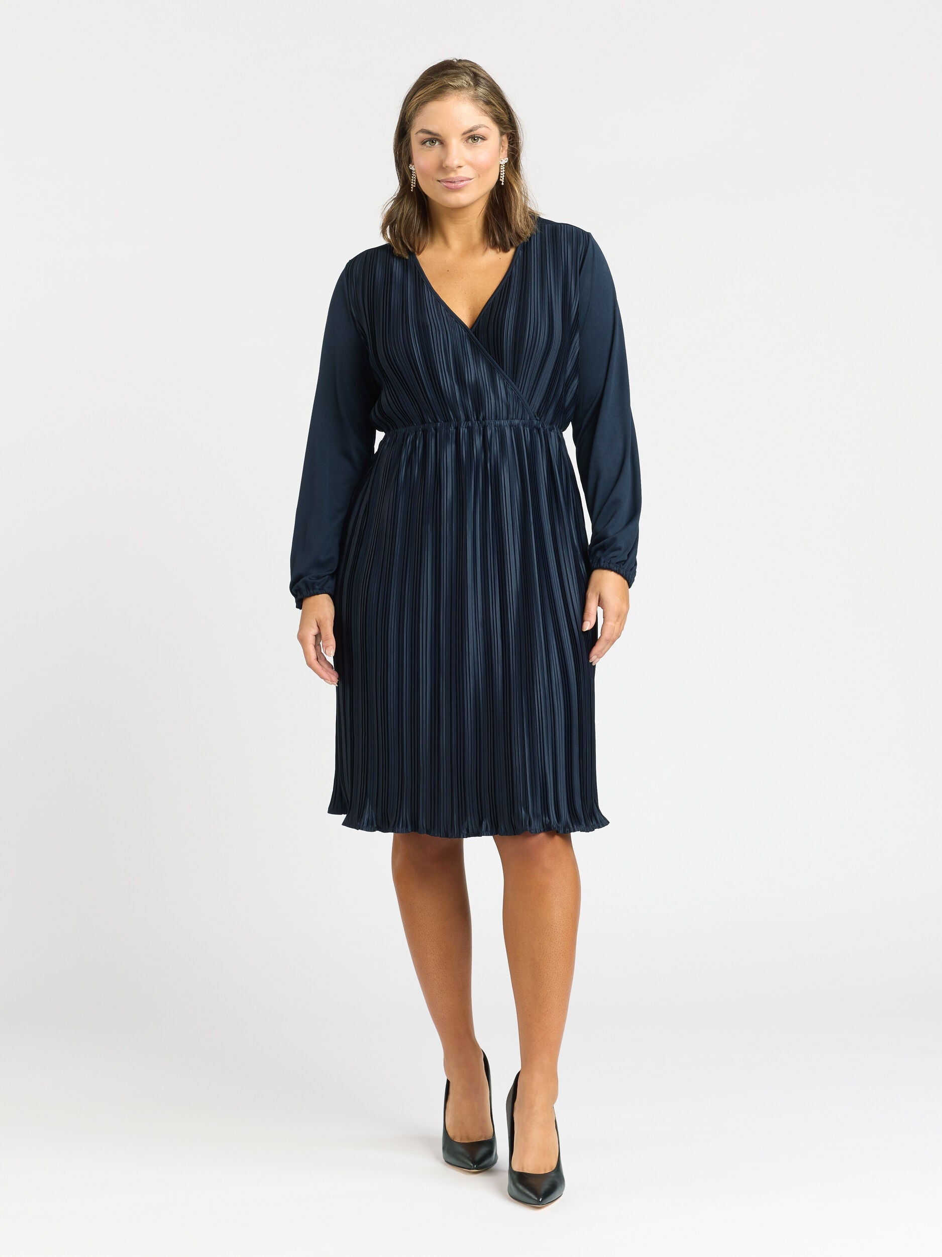 Elevate your wardrobe with the Katerina Jersey Dress. Its V-neckline and cross-over detail exude sophistication, while the long sleeves add a refined touch. The pleated fabric creates an elegant drape, and the elasticated waist ensures a comfortable and flattering fit. With its over-the-knee length and timeless navy shade, this dress is a versatile and stylish choice for any professional setting or special Review Occasion.