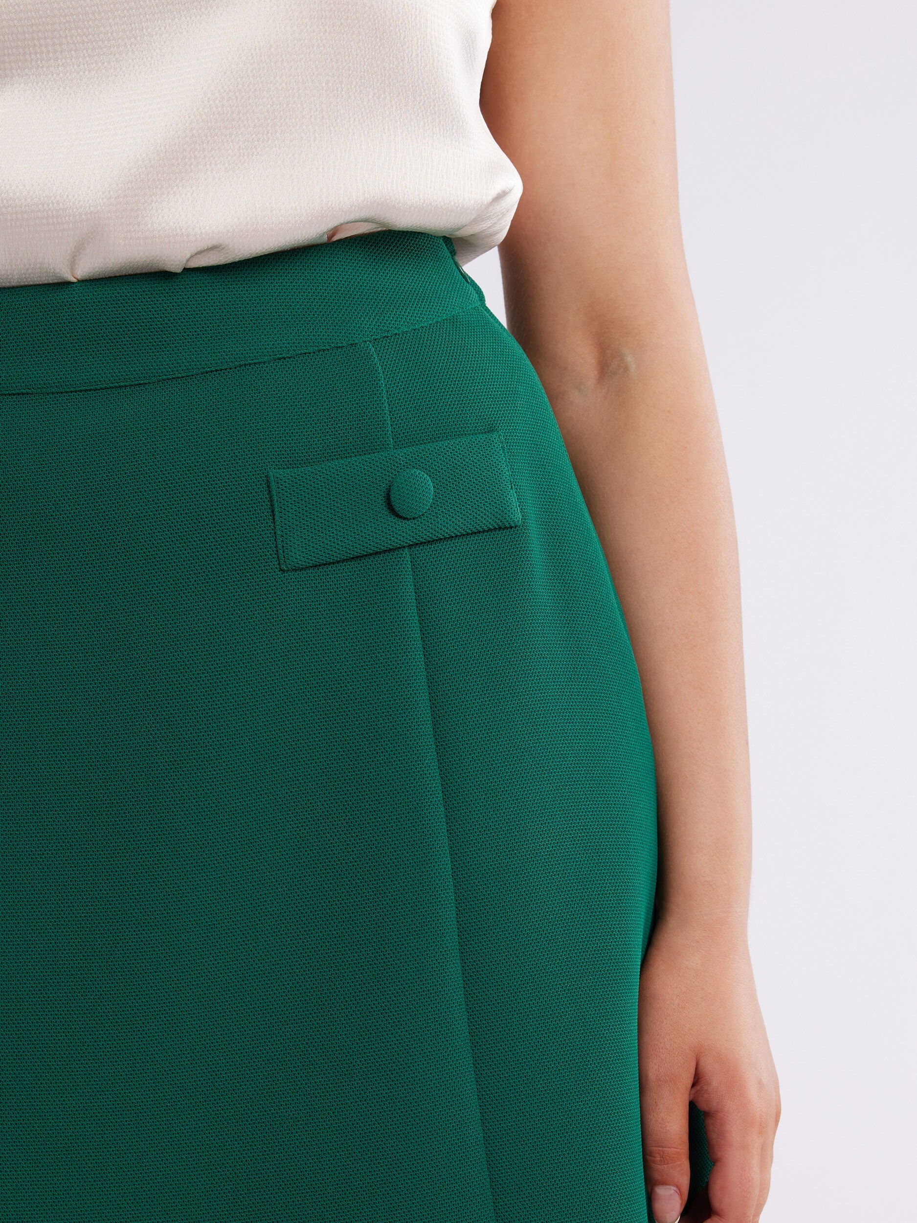 Immerse yourself in sophistication with the Kathleen Skirt. Crafted from textured fabrication, design panels, and mock pocket details elevate its charm. The above-knee length, invisible side zip, and fully lined silhouette showcase timeless elegance, all in a captivating jade green shade.