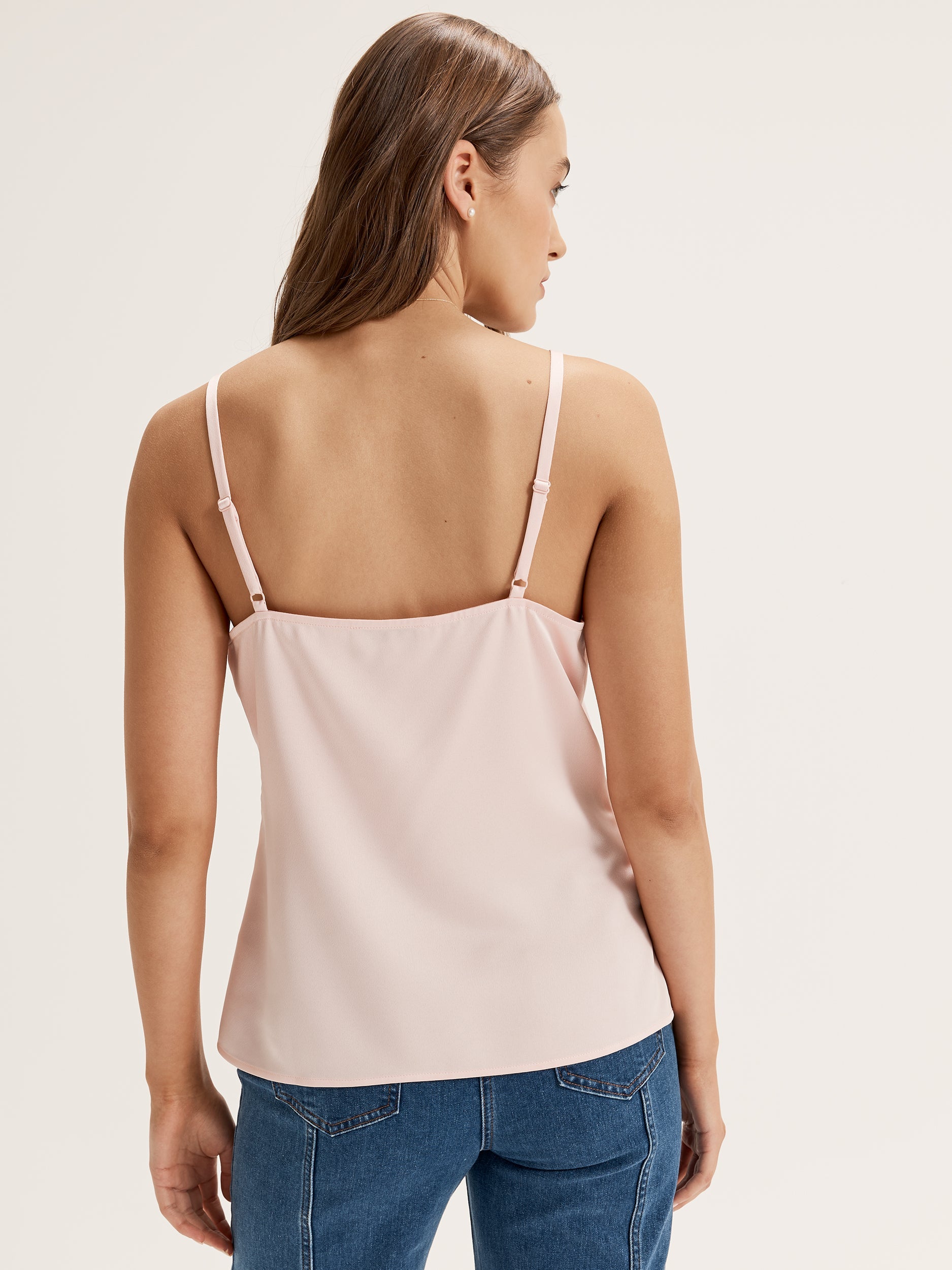 The Marilyn Cami is the answer to your capsule wardrobe woes. This versatile soft pink sleeveless top can be dressed up or down, dazzling as the star of any outfit when paired with pants, or slipped under a coat in the colder months for a more understated look. Featuring a soft V neckline and a contrast lace feature on the front neckline, the Marilyn Cami is crafted with elegance in mind. It’s also designed to flatter any body type, with adjustable strap lengths and a waist that’s the perfect length to tuck in or wear loose.