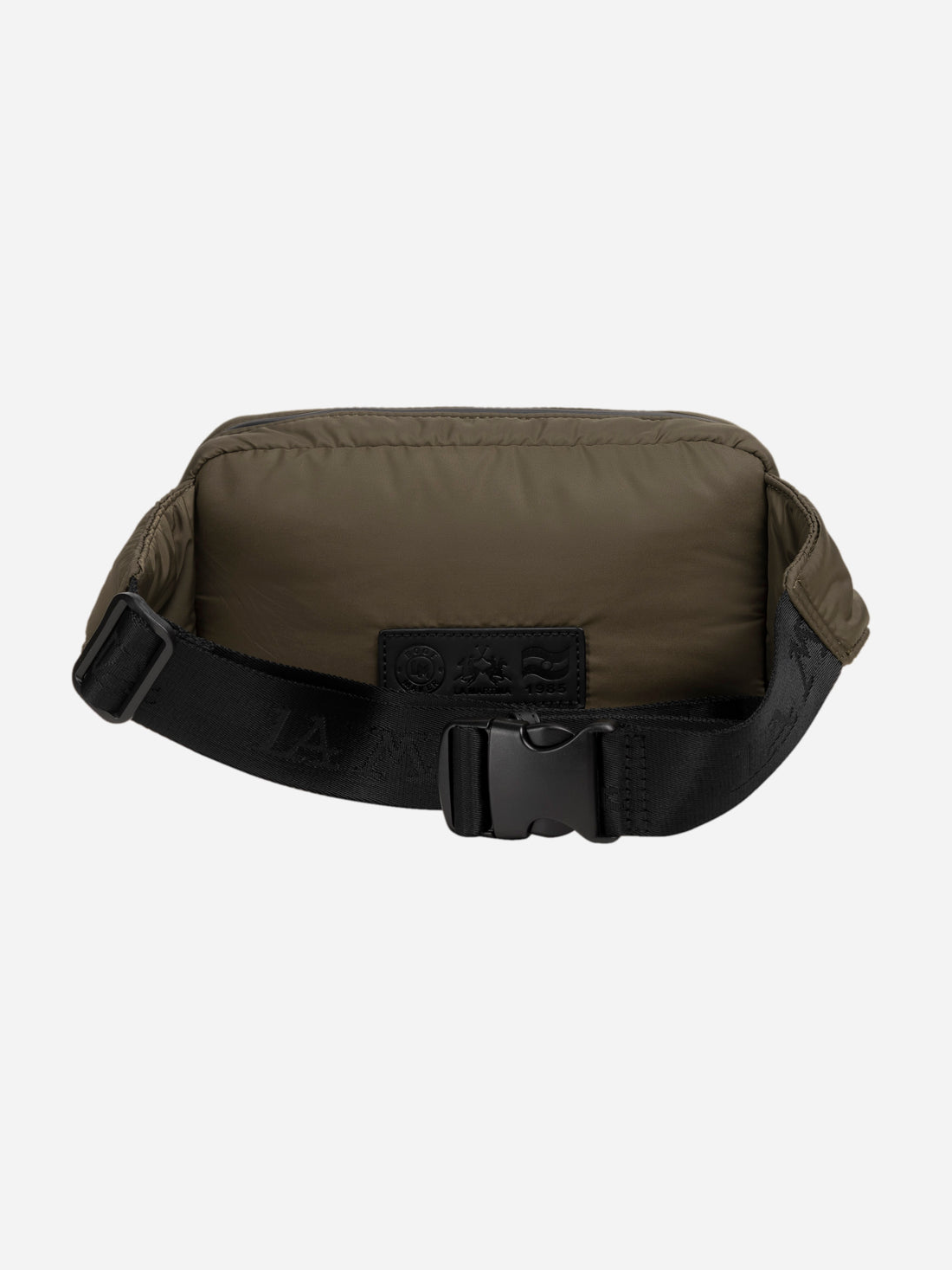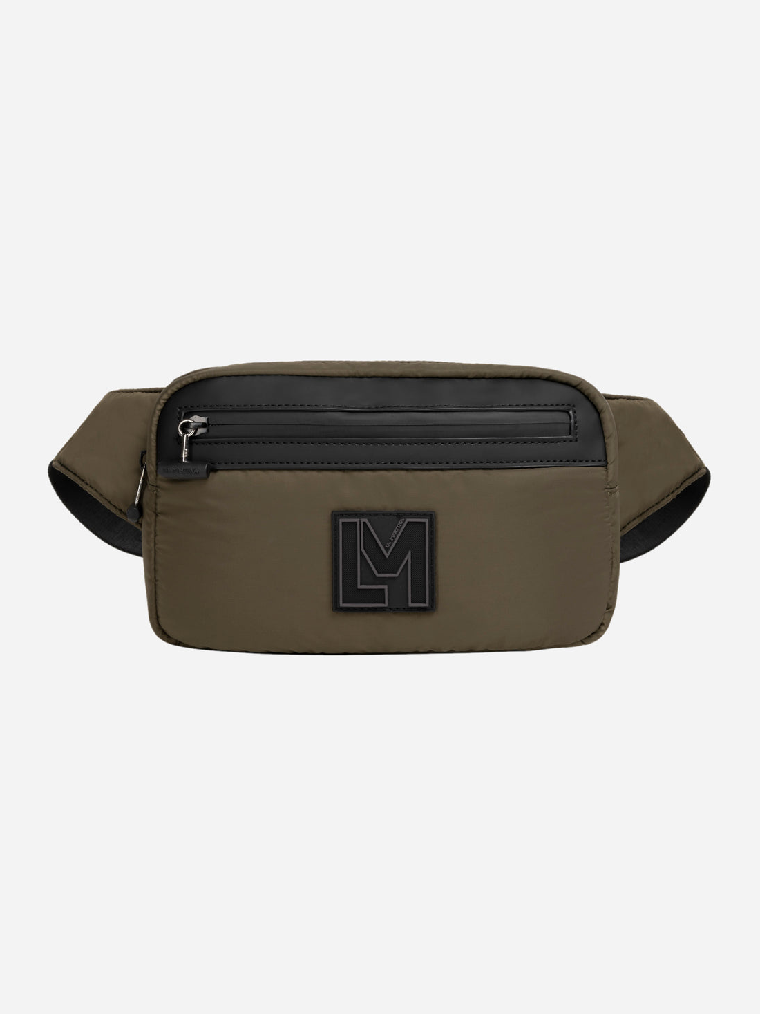 Men's plain bumbag made from synthetic fabric. Complete with a zip fastening. The design features a zipped outside pocket and two inside pockets: one open and one with a zip. The brand initials appear on a rubber plaque appliquéd on the front. Dimensions (length x height x depth) 25 x 15 x 16 cm.