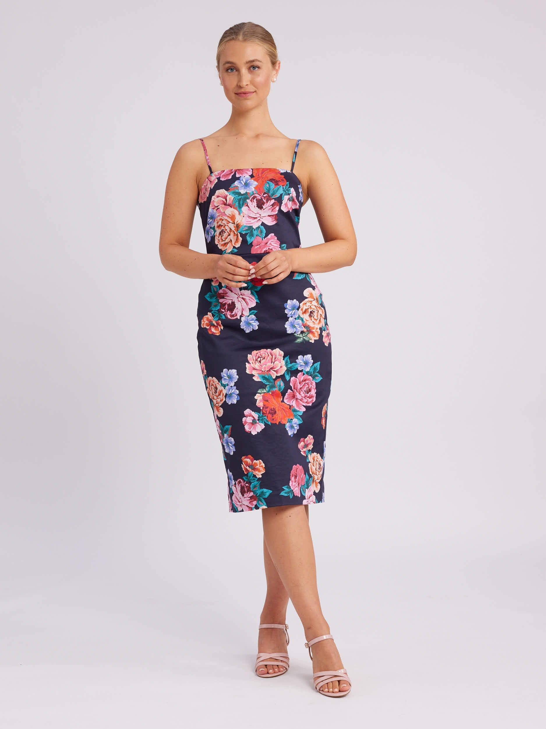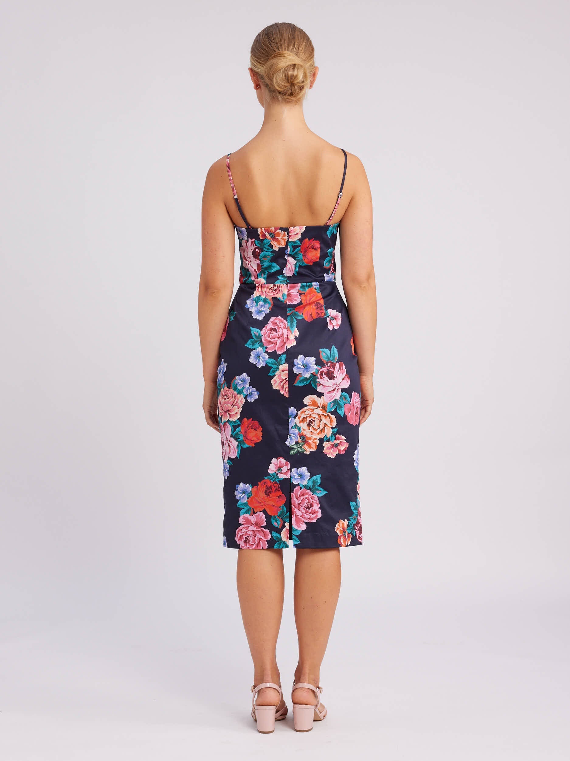 Introducing the Midnight Rose Fitted Dress in our custom red, pink and peach rose print with a navy base. Crafted from stretch cotton sateen fabric, this dress offers a comfortable fit with a touch of stretch for ease of movement. The dress is fully lined in stretch cotton lining, ensuring both comfort and a smooth silhouette. With a fitted strapless silhouette, the bodice is designed with ripper tape and boning with detachable and adjustable straps, allowing you to personalize your look. At the center back, there's a split for ease of movement and a center back invisible zip.The Midnight Rose Fitted Dress is the perfect blend of style, comfort, and versatility. Whether it's a special event or a night out, this dress ensures you look and feel your best in a chic and timeless design.
