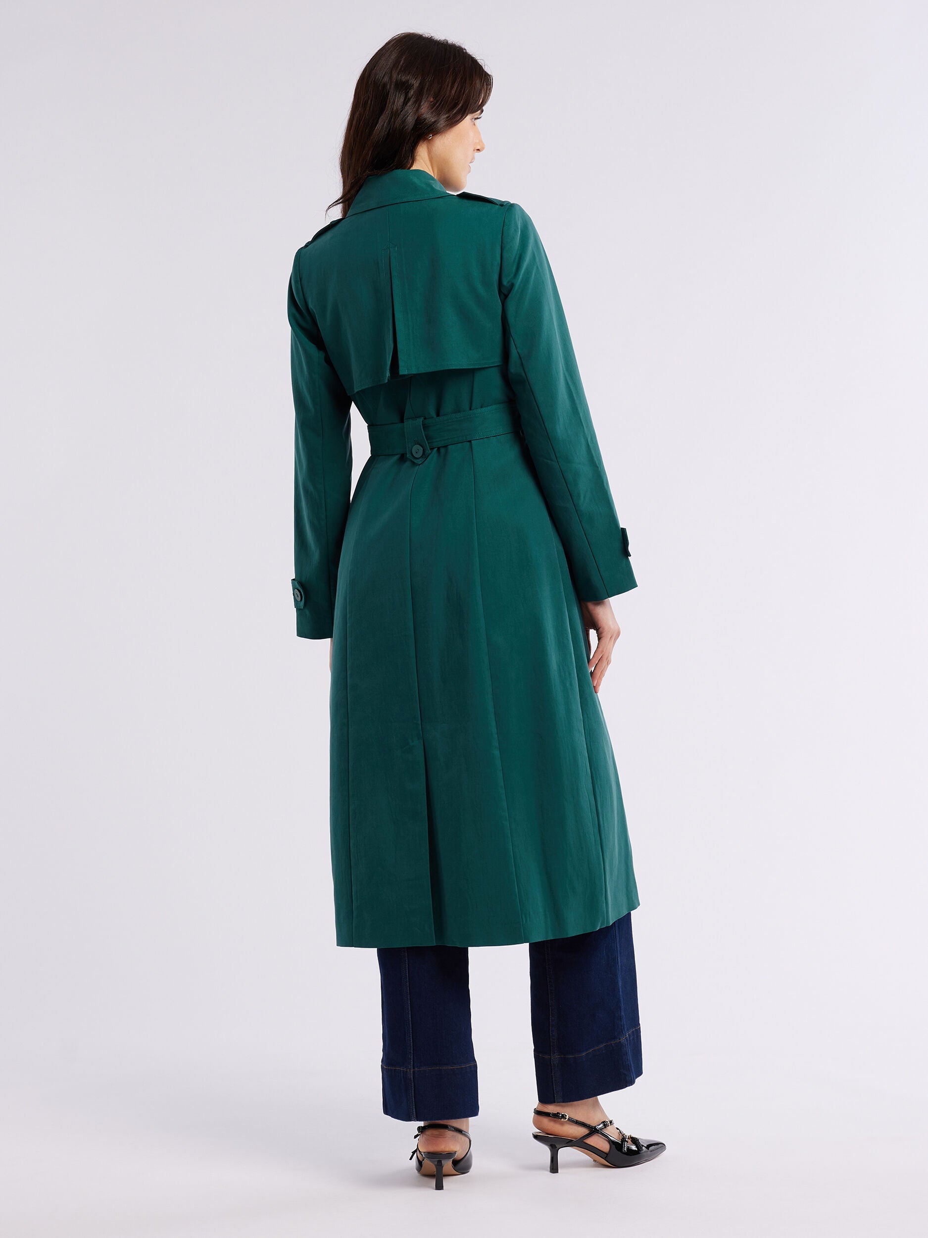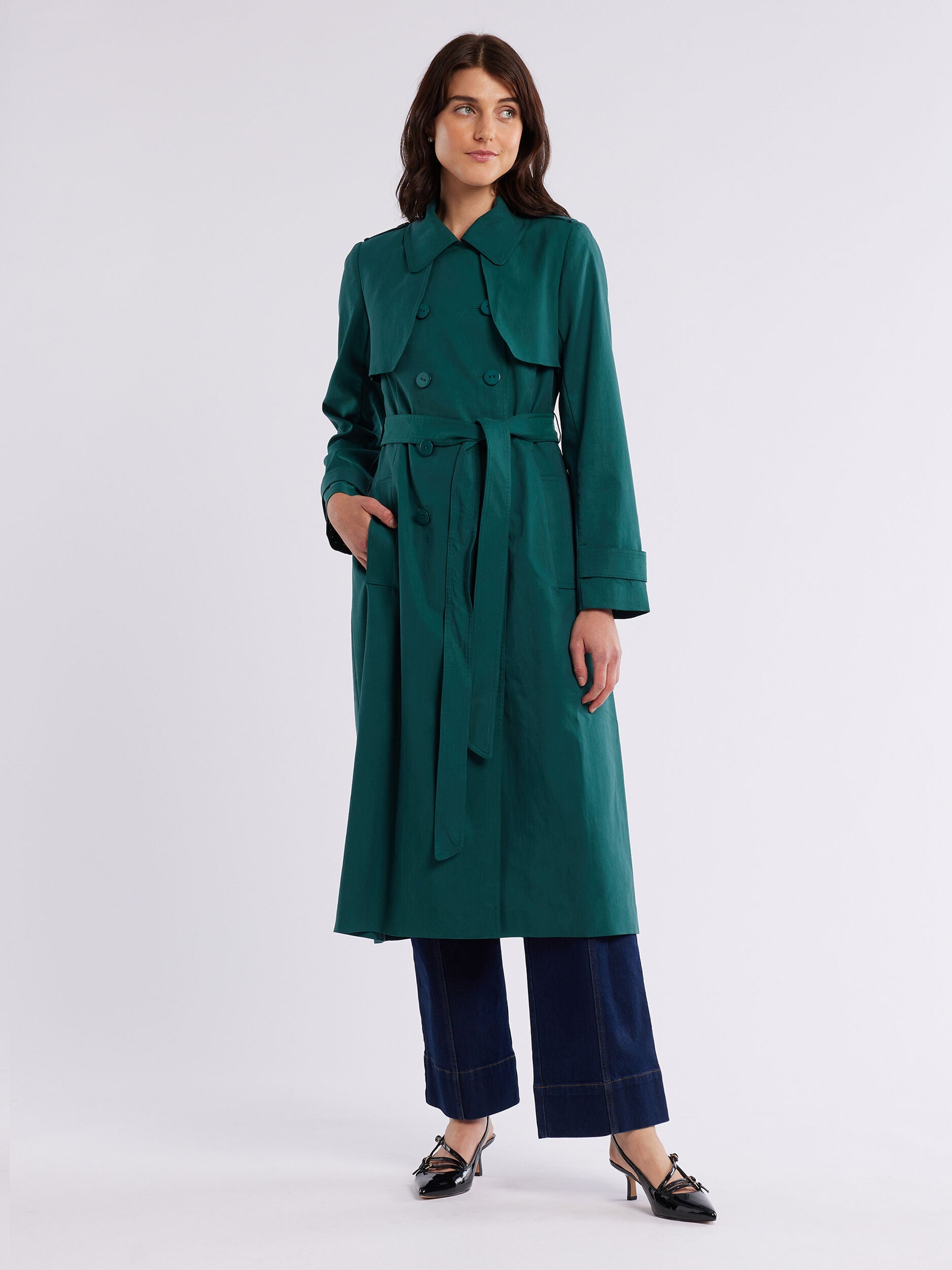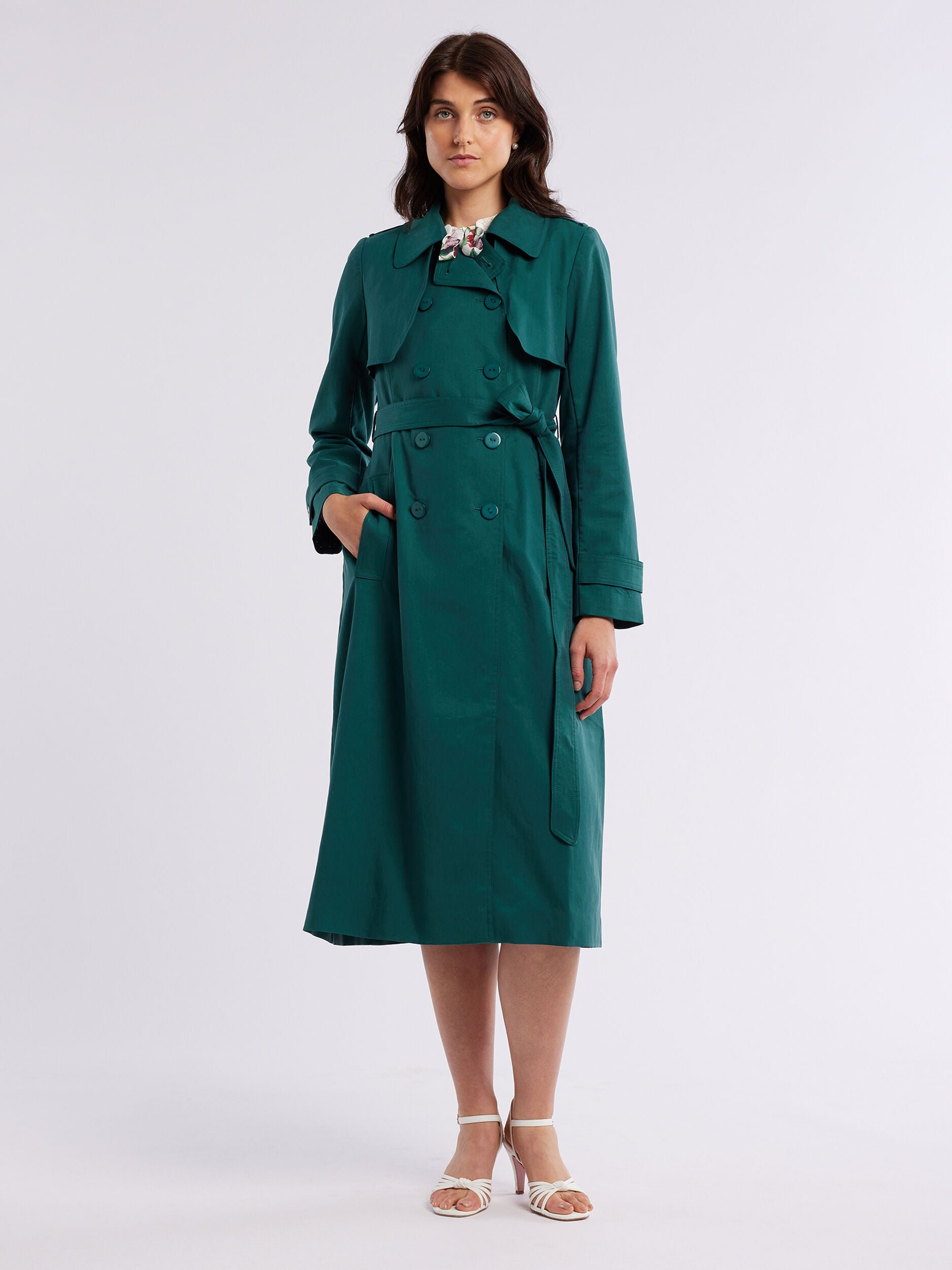 Make a statement in the Miley Trench Coat. The double-breasted design, shank fastening, and storm flap with a vent on the back yoke create a classic silhouette. Pockets, a self belt, and shoulder epaulets add practicality and style. The emerald green shade, spot print lining, cuff strap with button detail, and a longer line length complete this trench for a timeless piece.