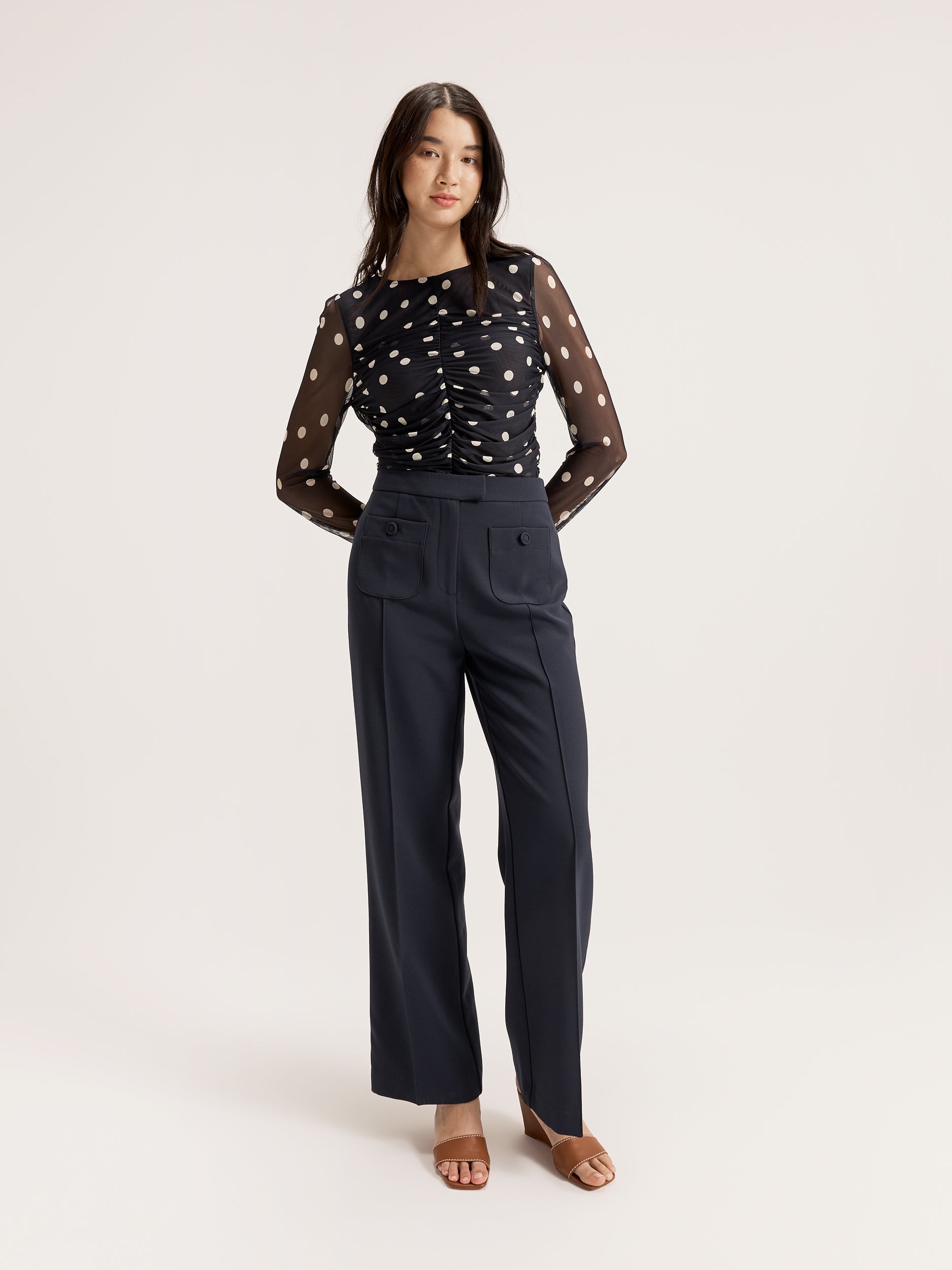 Your new favourite work pants are sorted; meet the Nicole Pant, the perfect blend of vintage and contemporary style! Made from a sturdy stretch fabric, the Nicole Pants are made for wearing to your 9-5 and beyond. Cut to a high waisted fit with a classic hook and bar waistband, the Nicole Pants sit snug to the hip and thigh before flowing into a comfortable wide leg silhouette at the knee, stopping just at the ankle to accommodate all your favourite footwear choices, from heels to flats and sneakers. The Nicole Pants are finished with vintage design details like front patch pockets and a detail crease down the centre front of the legs. Style with your favourite statement blouses or a simple knit and blazer for a chic corporate look.