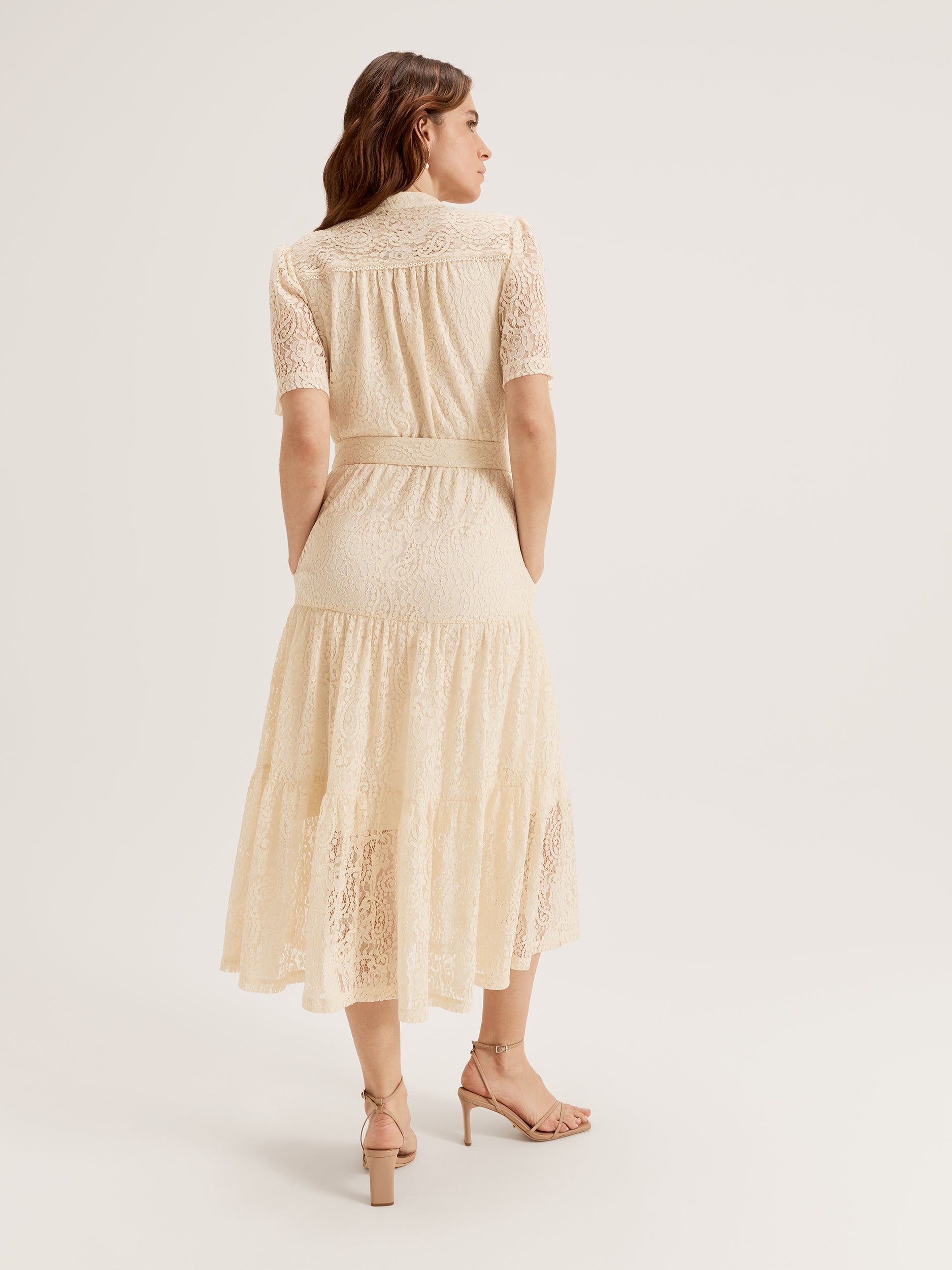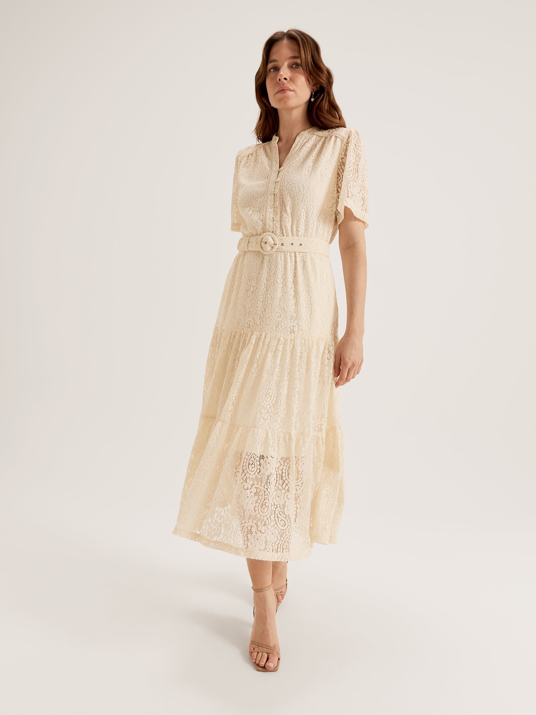 The Paisley Lace Dress is timeless, elegant, and designed to flatter every curve. Crafted from a stretch fabrication with a paisley motif lace, this bestselling new style features a button through bodice, elasticated waist, and a tiered skirt that flows gracefully to midi length. With a flat stand collar and delicate trim inserts in both the forward shoulder seam and button placket, every detail of this dress is part of a considered design that artfully enhances your silhouette. Fully lined for comfort and quality, the Paisley Lace Dress promises to elevate your style effortlessly. Pair it with your favourite summer sandals or heels for everyday wear or special occasions.