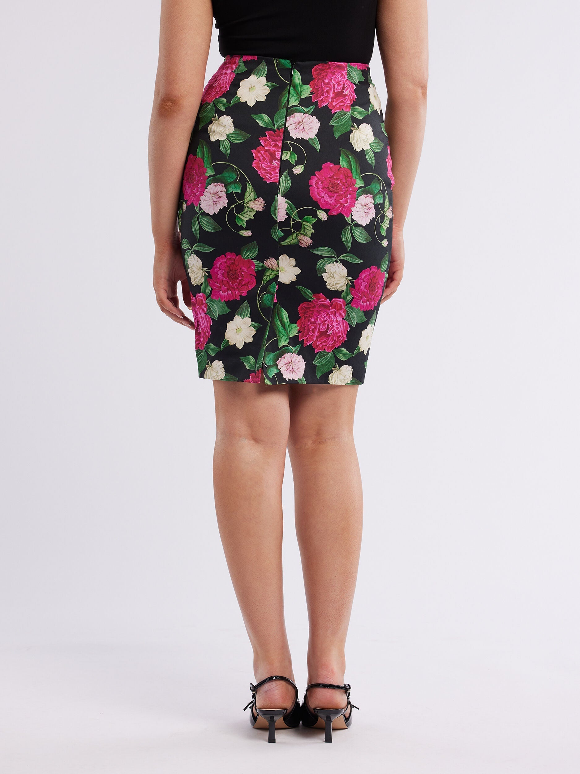 Indulge in chic sophistication with the Raspberry Peony Skirt. Crafted from cotton sateen, its pencil silhouette and knee-length design exude timeless elegance. Darts at the waist create a flattering shape, while the center back vent and invisible zip add a touch of practicality. Adorned with a captivating pink floral print, the black base ensures versatility and style.