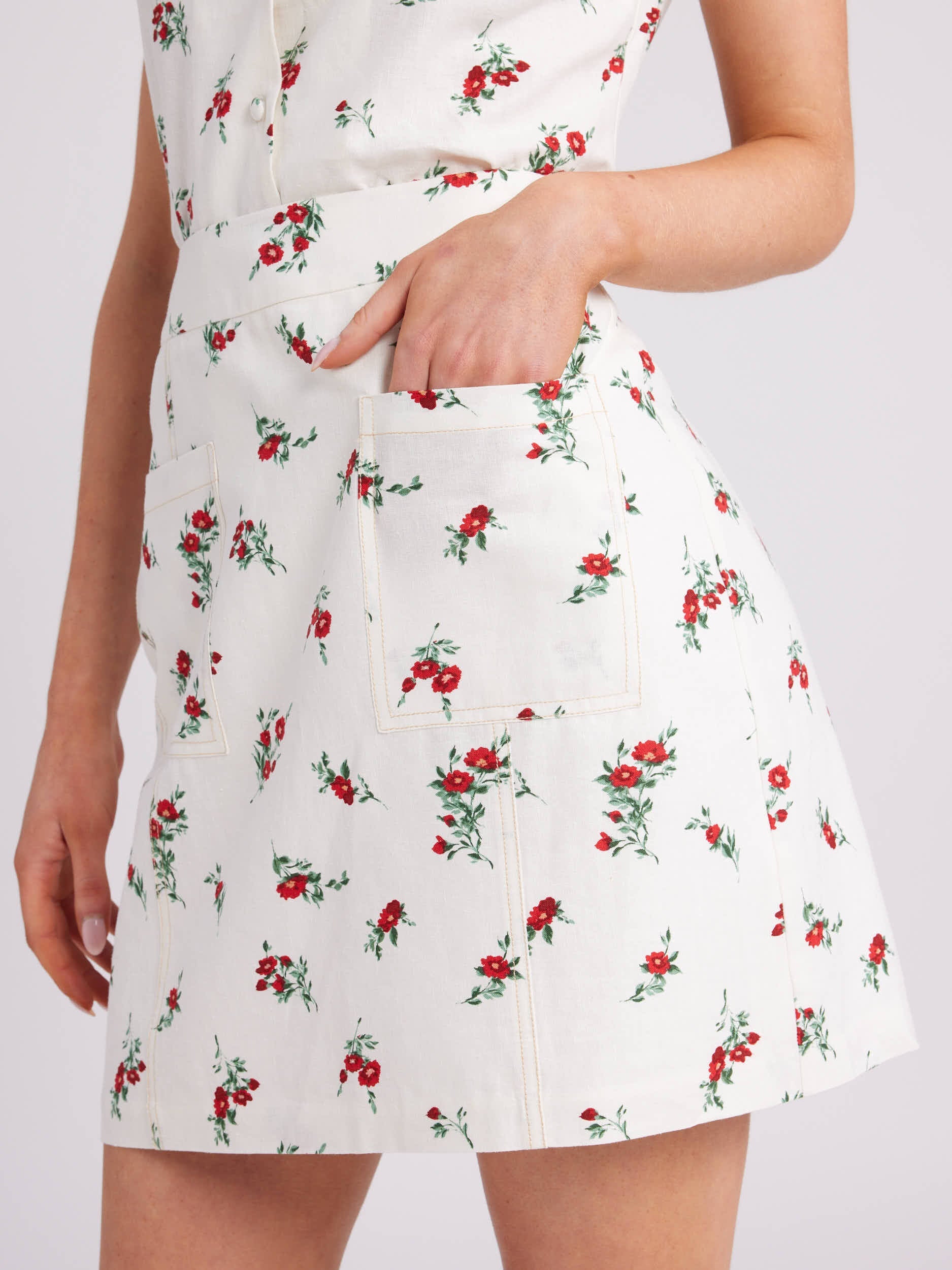 Introducing the Rosie Posie Skirt crafted from a linen blend with a cozy cotton lining, this skirt offers both comfort and a touch of elegance. The fully lined skirt ensures a smooth and comfortable fit with functional patch pockets at the front. Designed with contrast color stitching feature paired with the ditsy rose print to add a touch of charm and character to your look, making it perfect for various Review Occasions. For easy wear and removal, the Rosie Posie Skirt is equipped with an invisible zip at the center back. This skirt is a versatile and stylish addition to your wardrobe, combining both form and function in one exquisite piece.