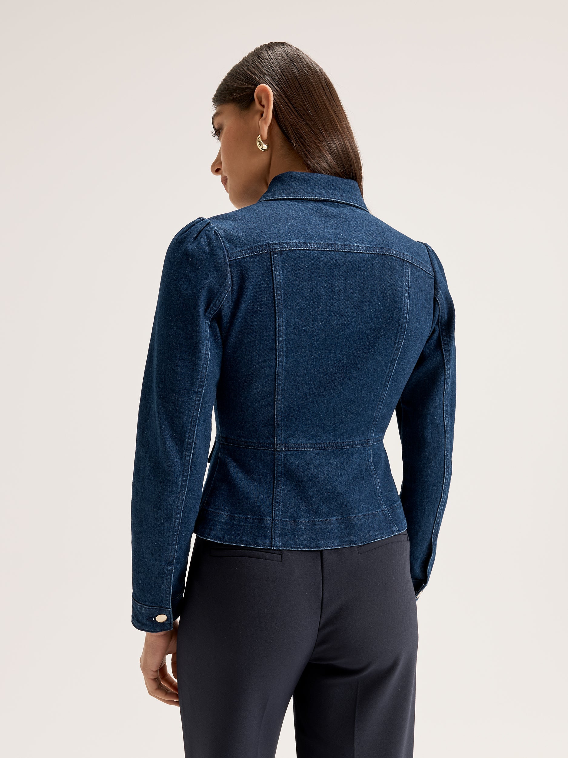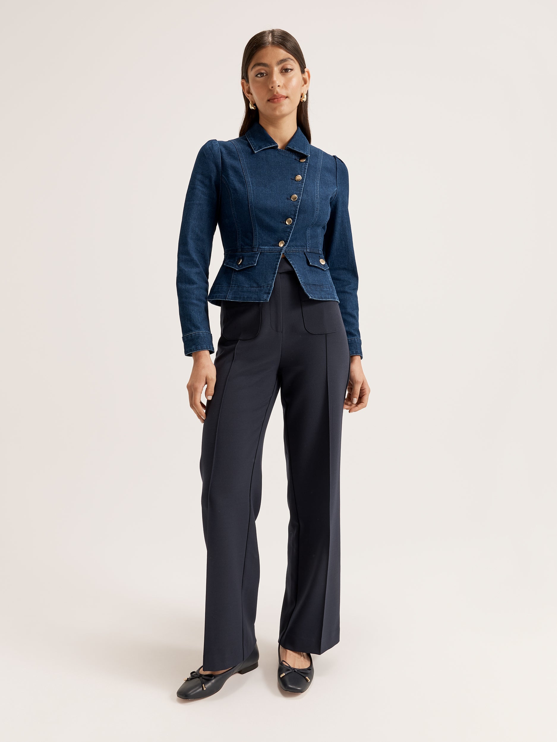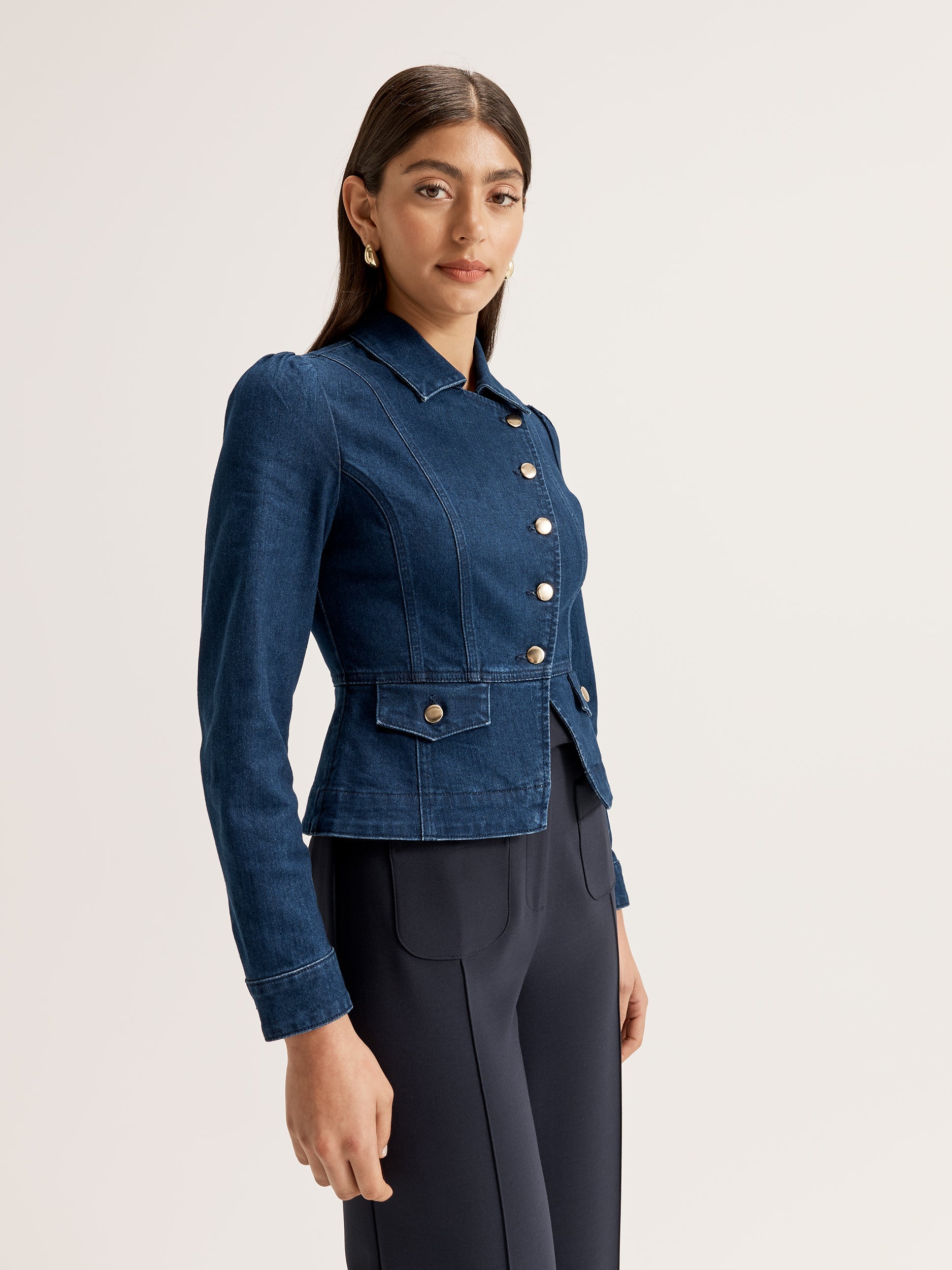 A new classic to add to your denim collection, the Rue Denim Jacket is an absolute must have for the season ahead. This stunning denim jacket is designed with sleek military accents, like an asymmetric button front with gold accent buttons, and features other figure flattering design details like a peplum hem and corset panelling. The Rue Denim Jacket is complete with a collared neckline, functional front pockets, and full length sleeves. Available in a rich mid blue wash, the Rue Denim Jacket is a truly modern take on a classic.