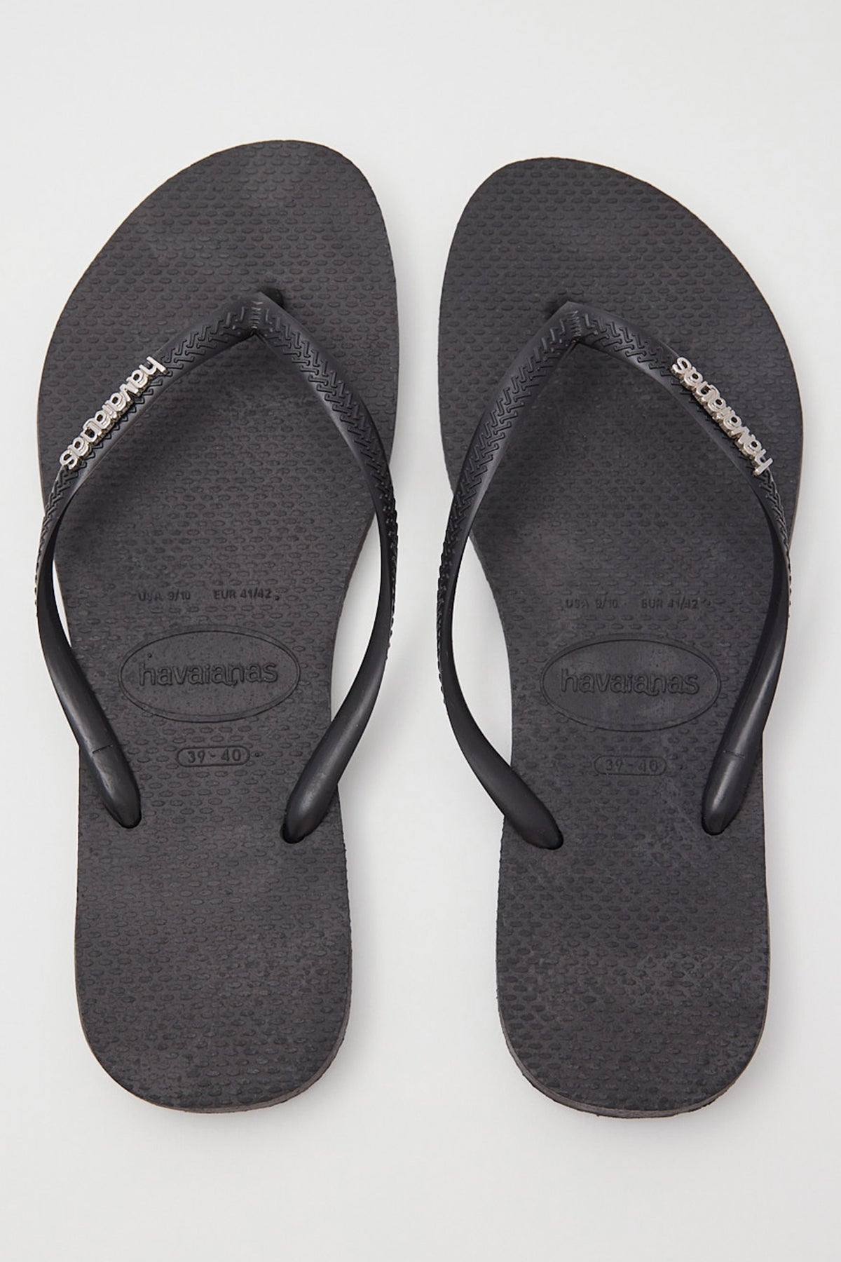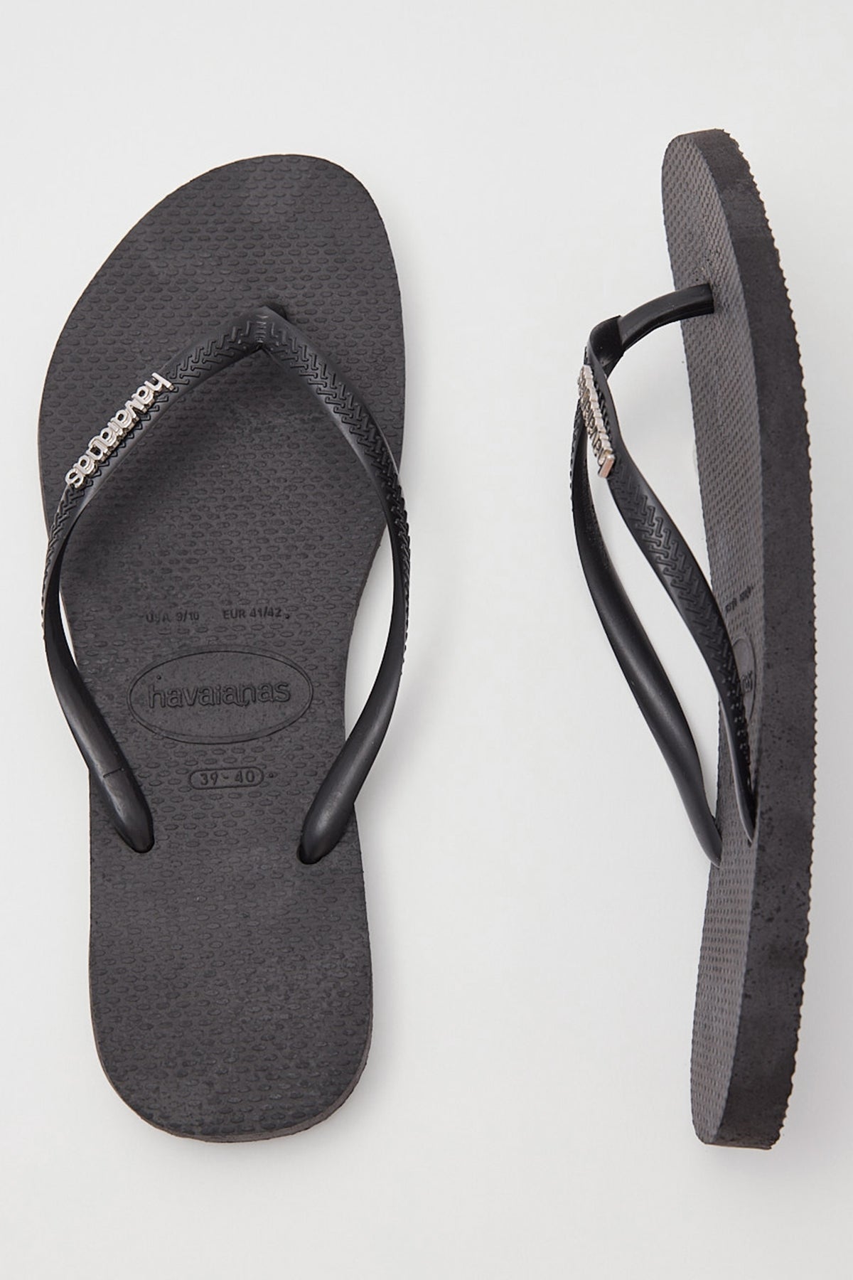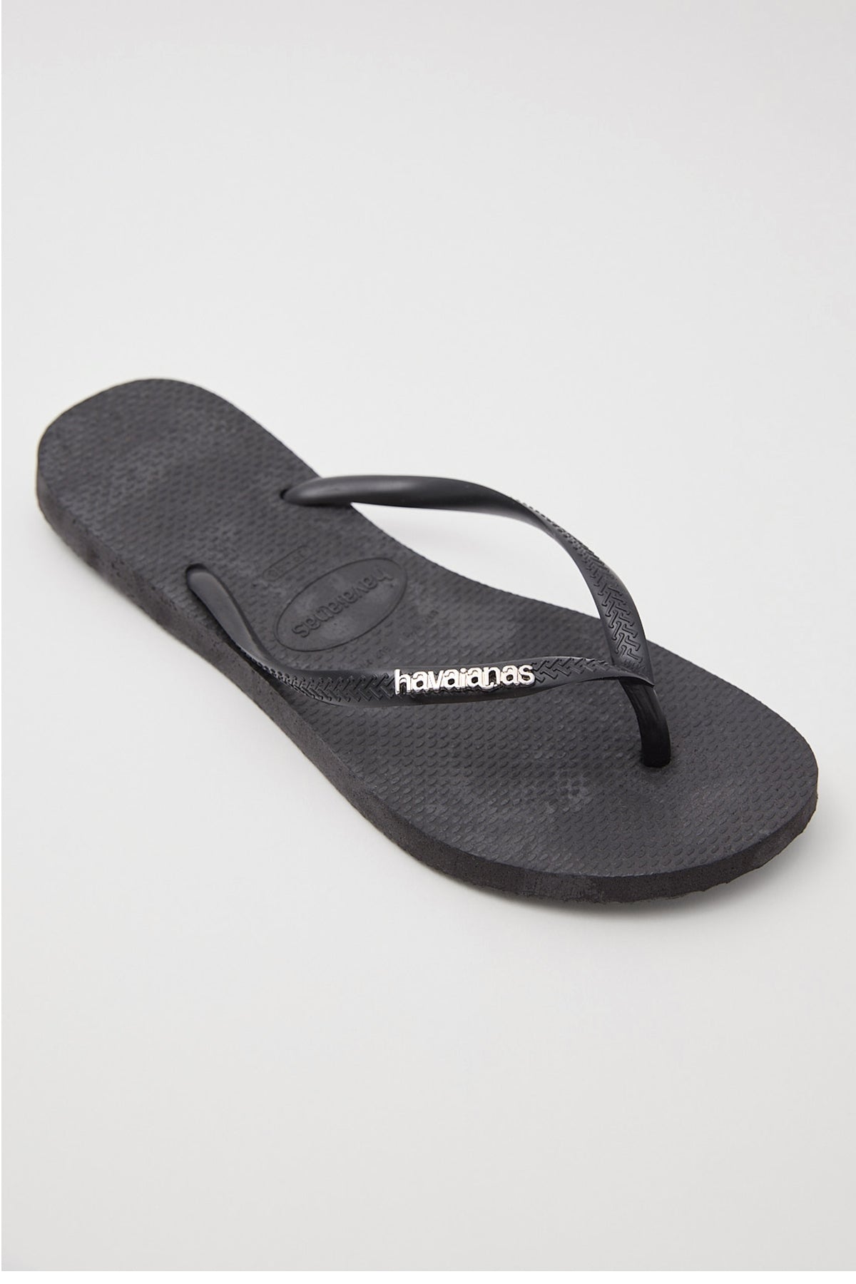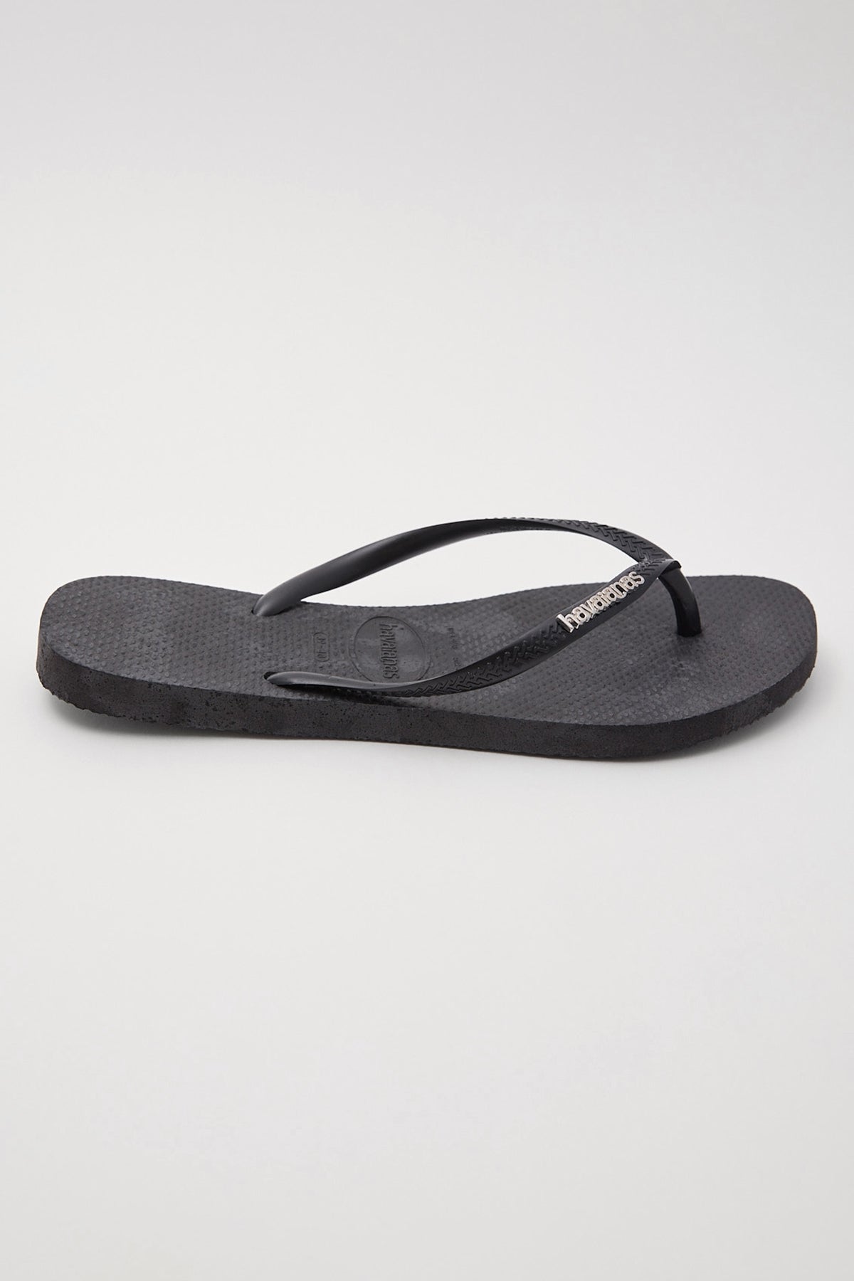 Slip into something a bit more comfortable with this slimline version of the iconic in classic black. Made out of the same premium rubber that we know and love this Slim Metal Logo pair of stamps the brand's name on the band in a chic silver metal. Upgrade your set and get this shiny pair into your off duty footwear mix.