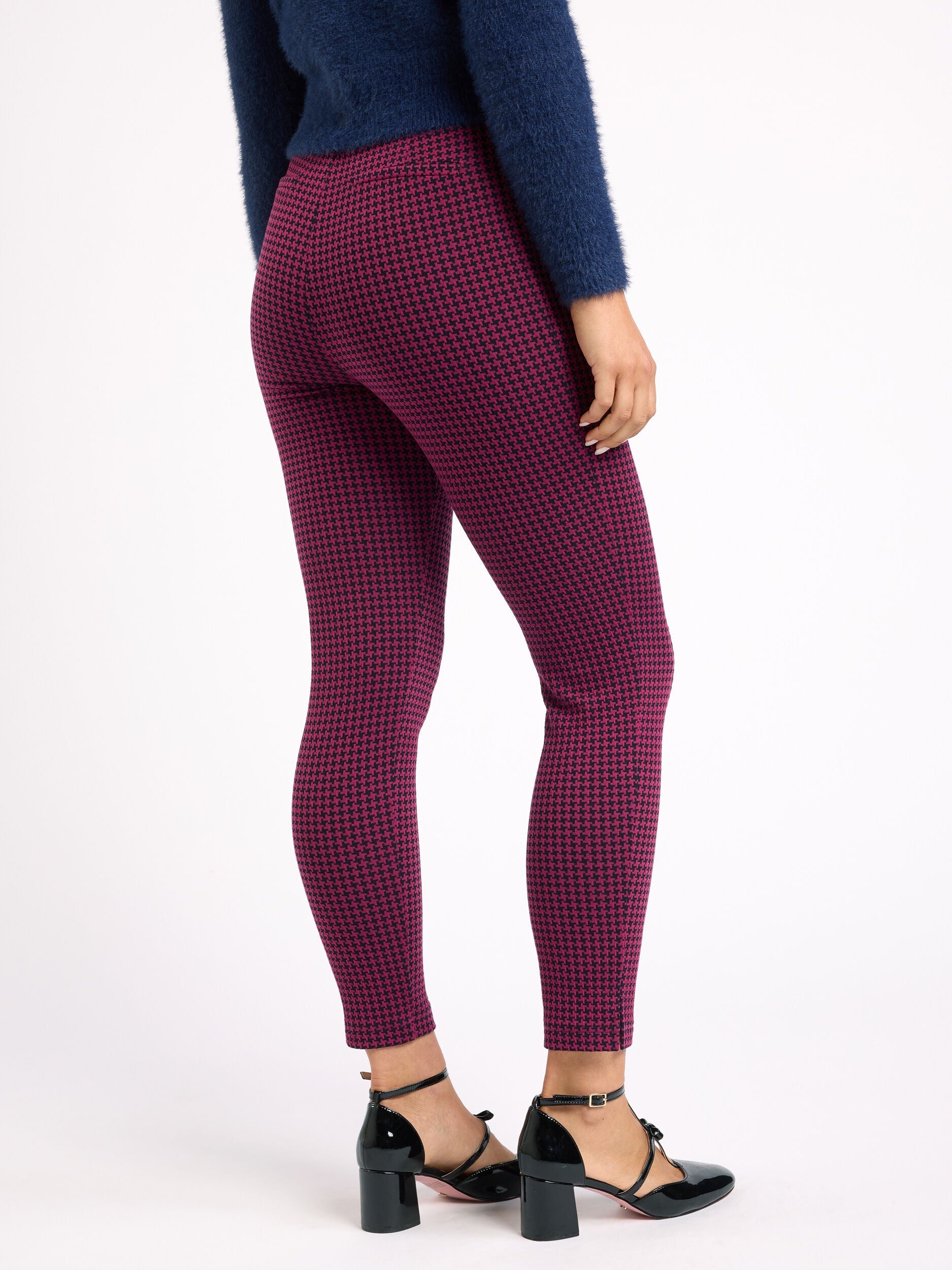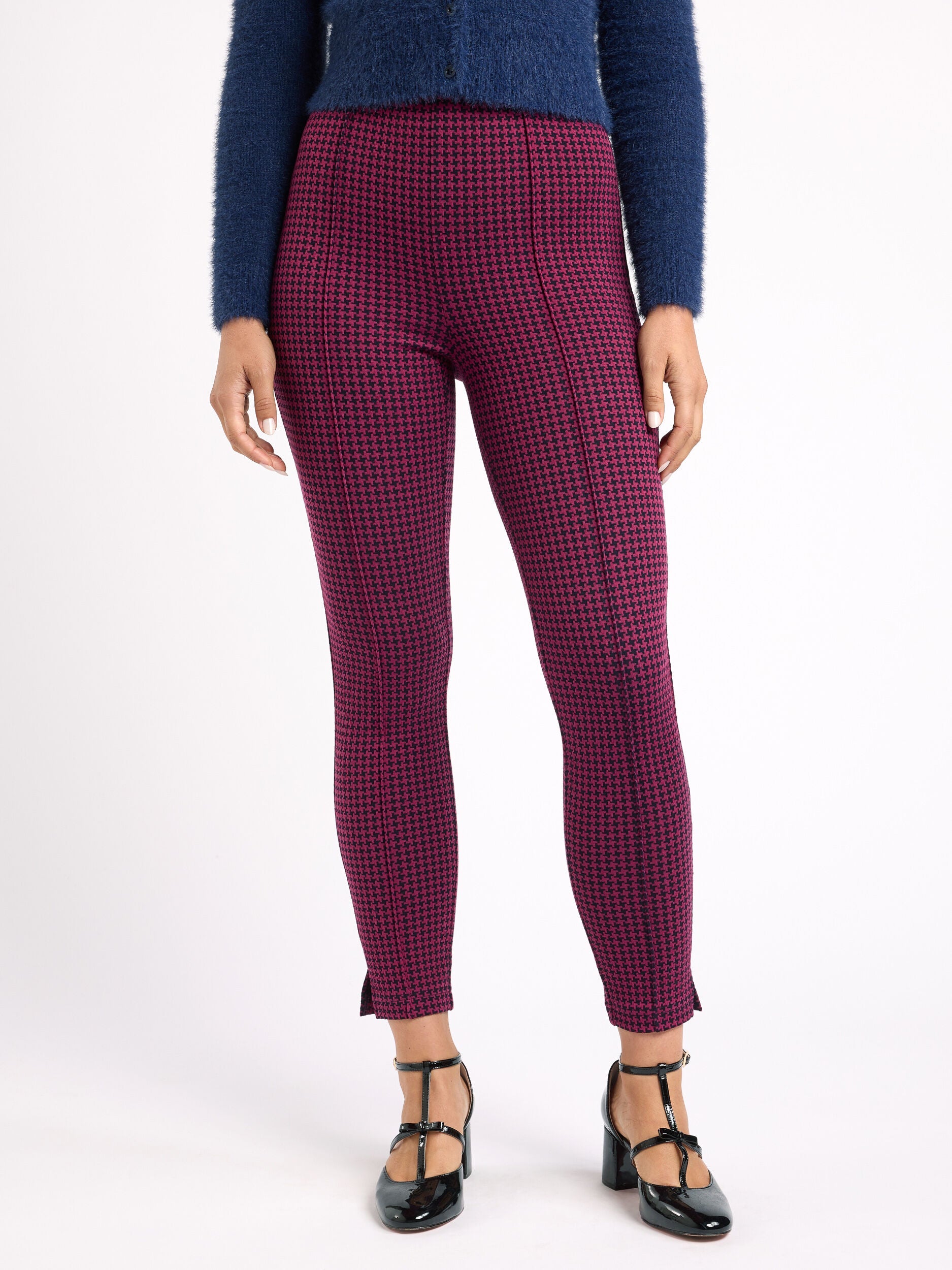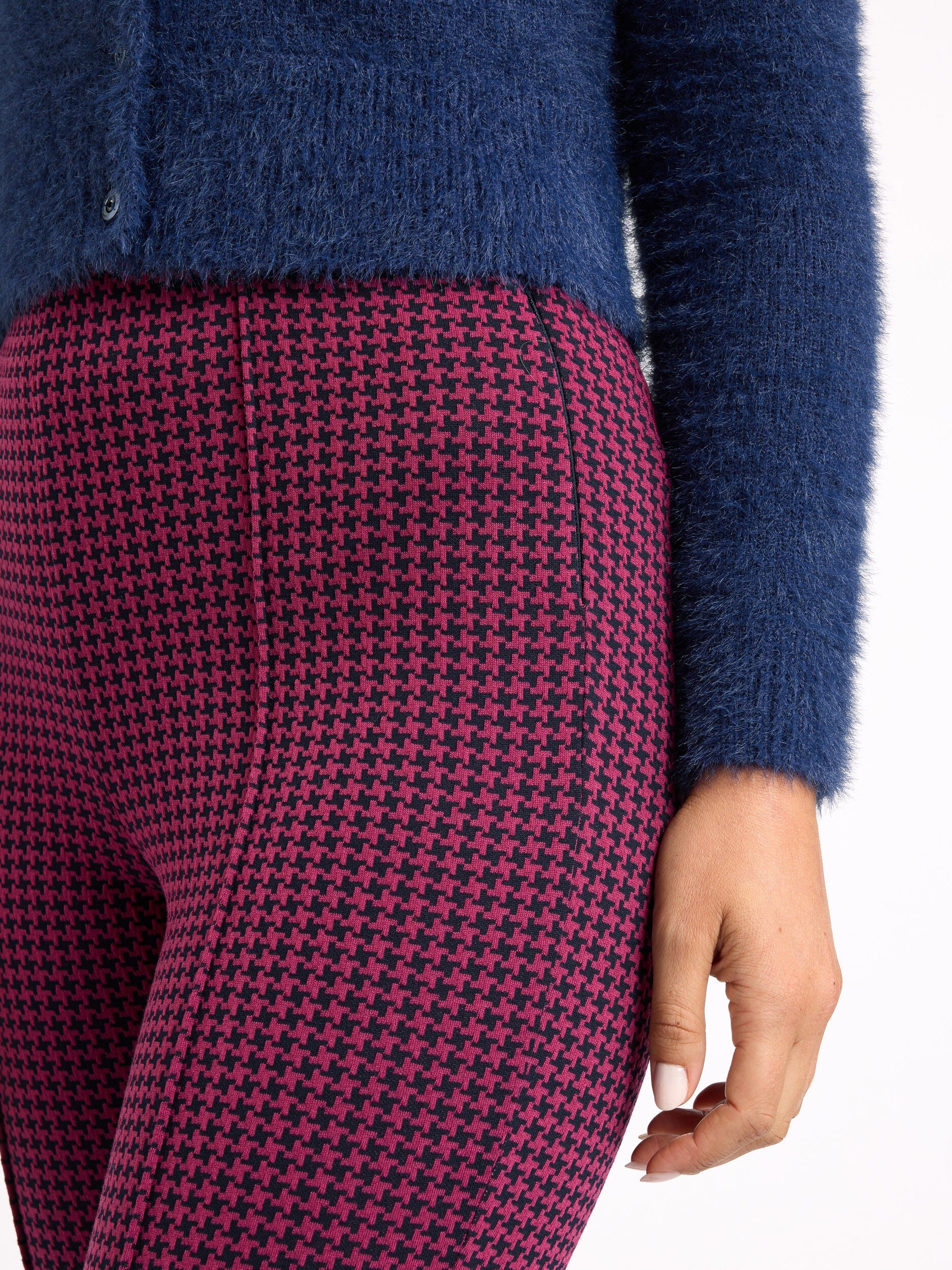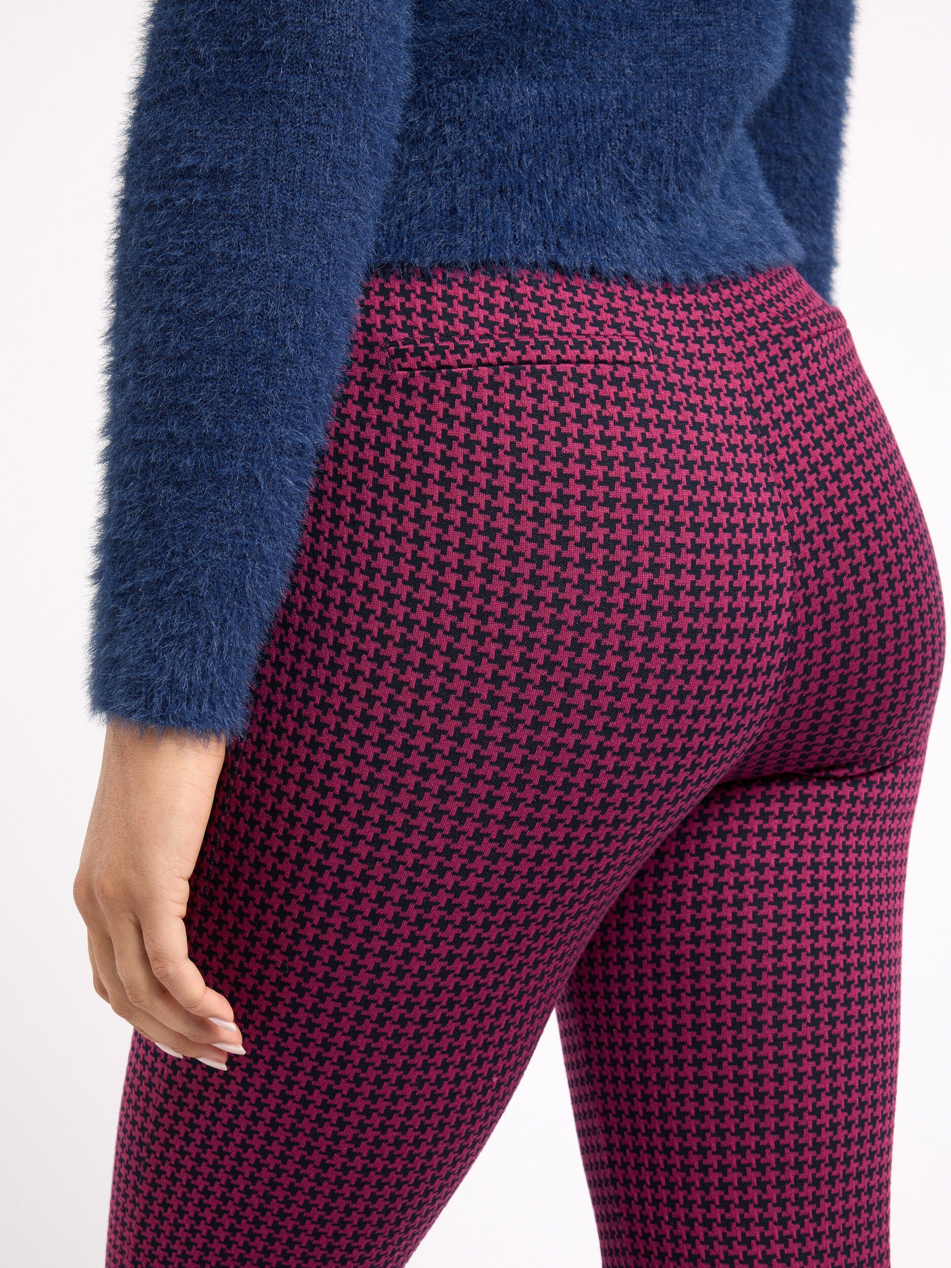Introducing the Soho Check Ponte Pant, a must-have for any fashion-savvy individual. These pants feature a timeless houndstooth pattern that adds a touch of sophistication to any outfit. The ponte stretch fabric is both comfortable and durable, making them perfect for both work and play. The ankle length design and slim fit create a flattering silhouette, while the high waisted elasticated waistband offers comfort and style. The mock back pockets and side invisible zip provide practicality, while the split hem detail adds a touch of elegance. These pants are perfect for any Review Occasion, from a day at the office to a night out on the town. The houndstooth pattern adds a touch of classic elegance, while the slim fit and ankle length design create a modern and stylish look. The high waisted elasticated waistband offers both comfort and a flattering silhouette, while the split hem detail adds a touch of sophistication. Whether you pair them with a blouse for a professional look or a crop top for a night out, the Soho Check Ponte Pant is sure to become a staple in your wardrobe.