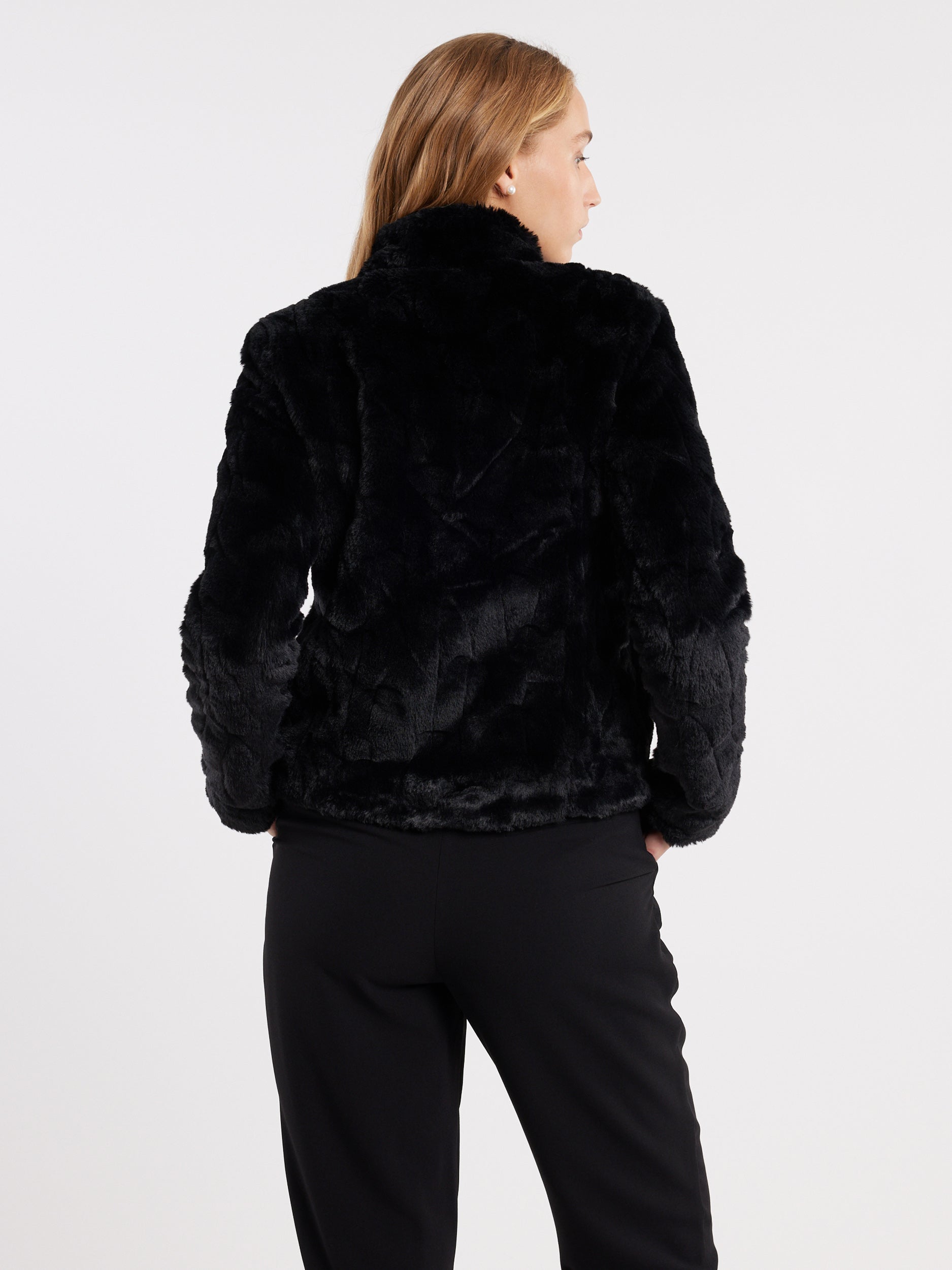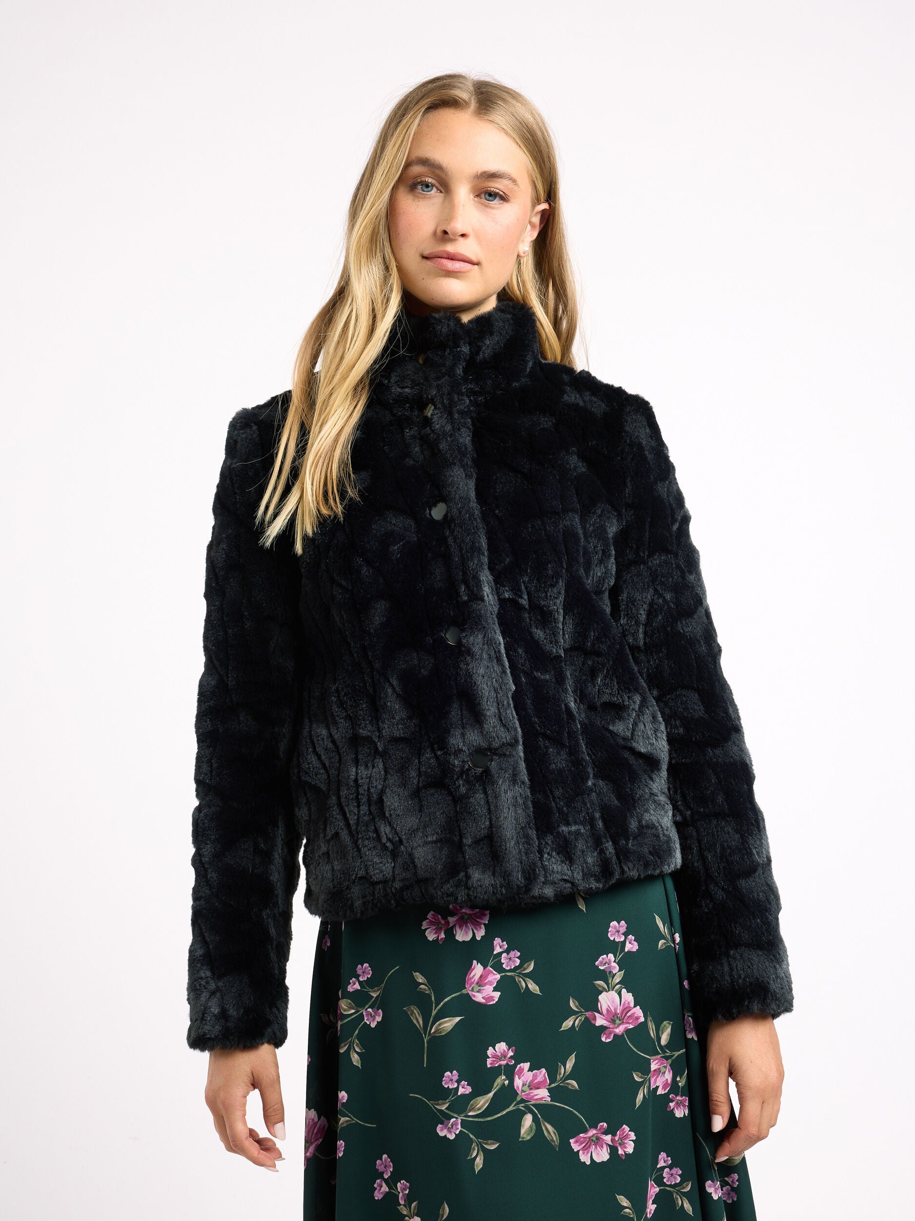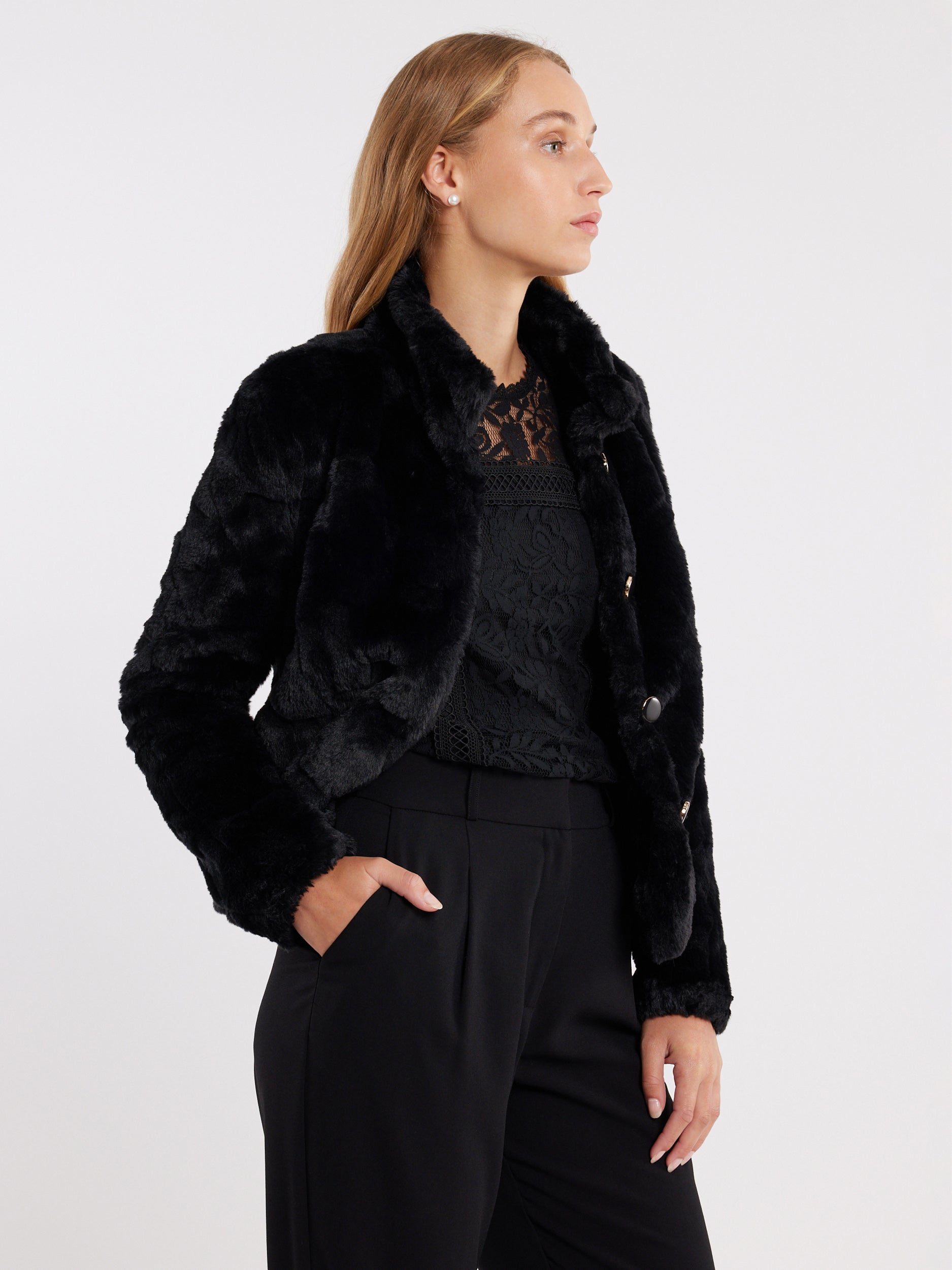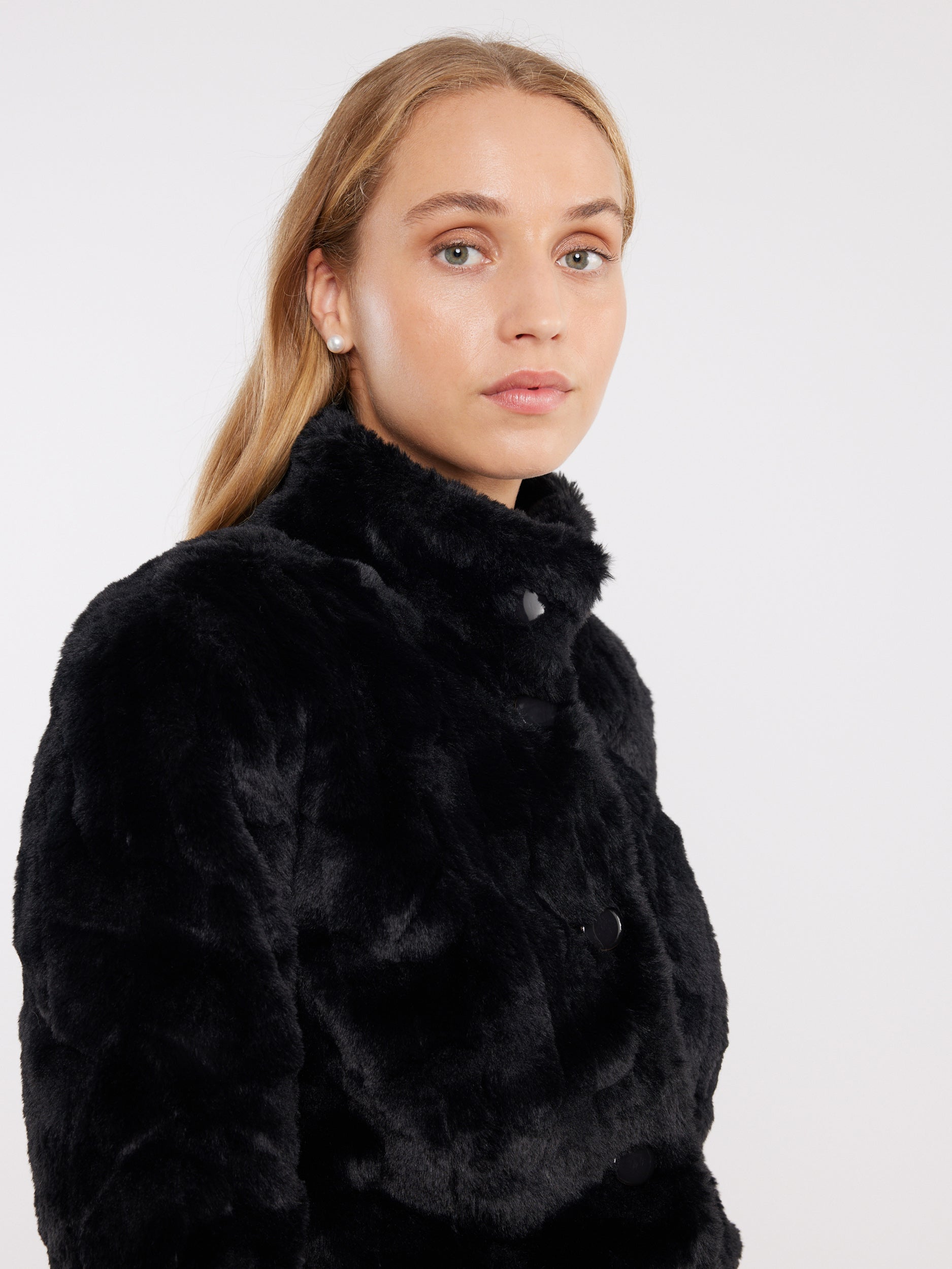 Introducing the Sovereign Jacket, a must-have addition to your winter wardrobe. Made from high-quality materials, this jacket is designed to keep you warm and stylish on even the coldest of days. The heavy-weight construction ensures that you stay snug and comfortable, while the textured faux fur adds a touch of luxury to your look. The jacket features a stand collar and shank buttons with gold rim, which give it a sophisticated and polished appearance. The long sleeves and lined interior keep you protected from the elements, while the size pockets provide ample storage for your essentials. The black shade of the jacket is versatile and easy to pair with a variety of outfits.