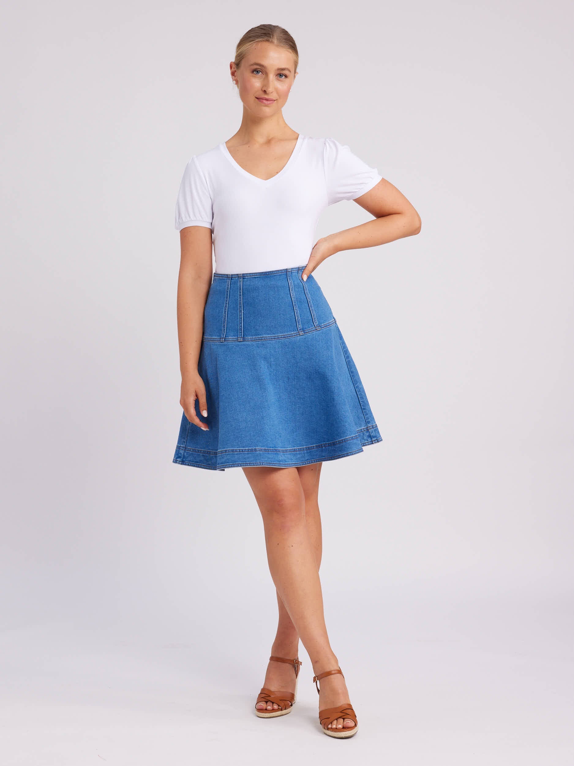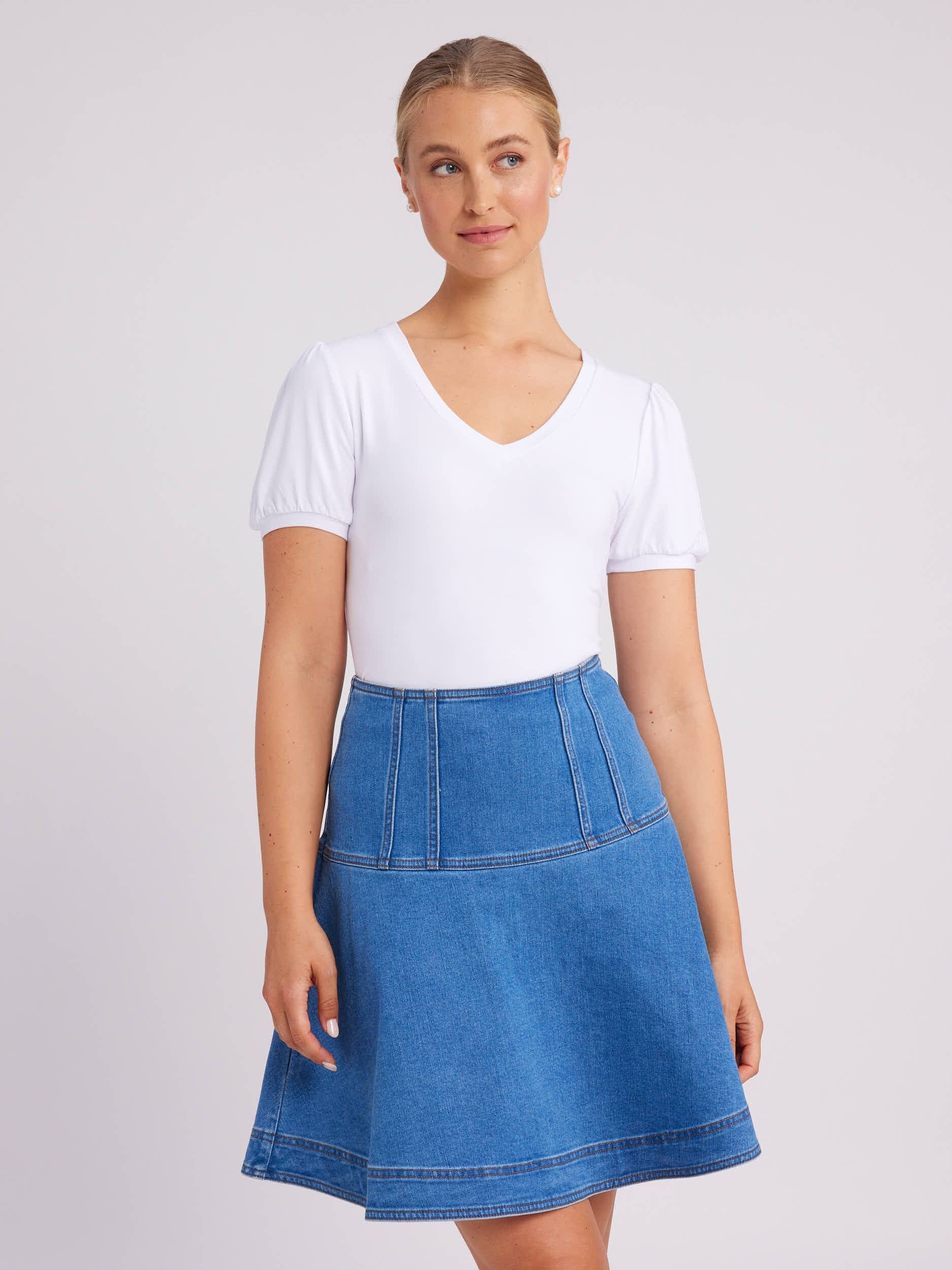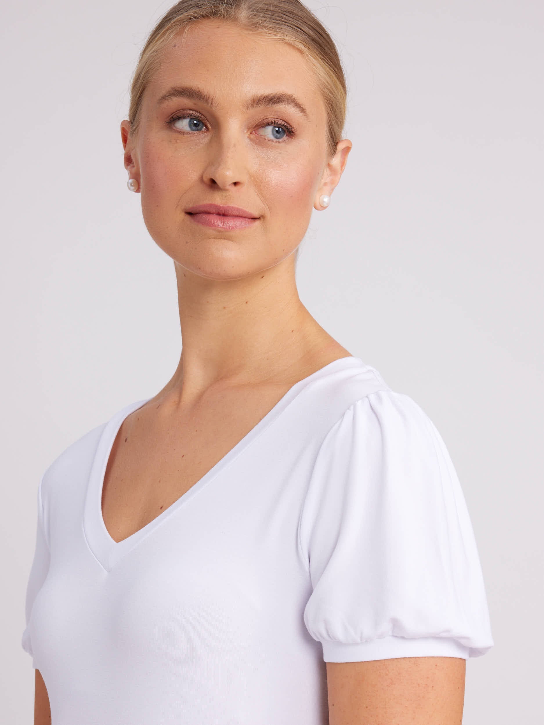 Step into sustainability with Tee Time. Crafted from planet-friendly Ecovero jersey in a fresh white shade, it boasts a V-neckline and short puff sleeves for a chic twist on a classic tee. The relaxed fit, stretch, and regular weight make it perfect for everyday comfort and style.