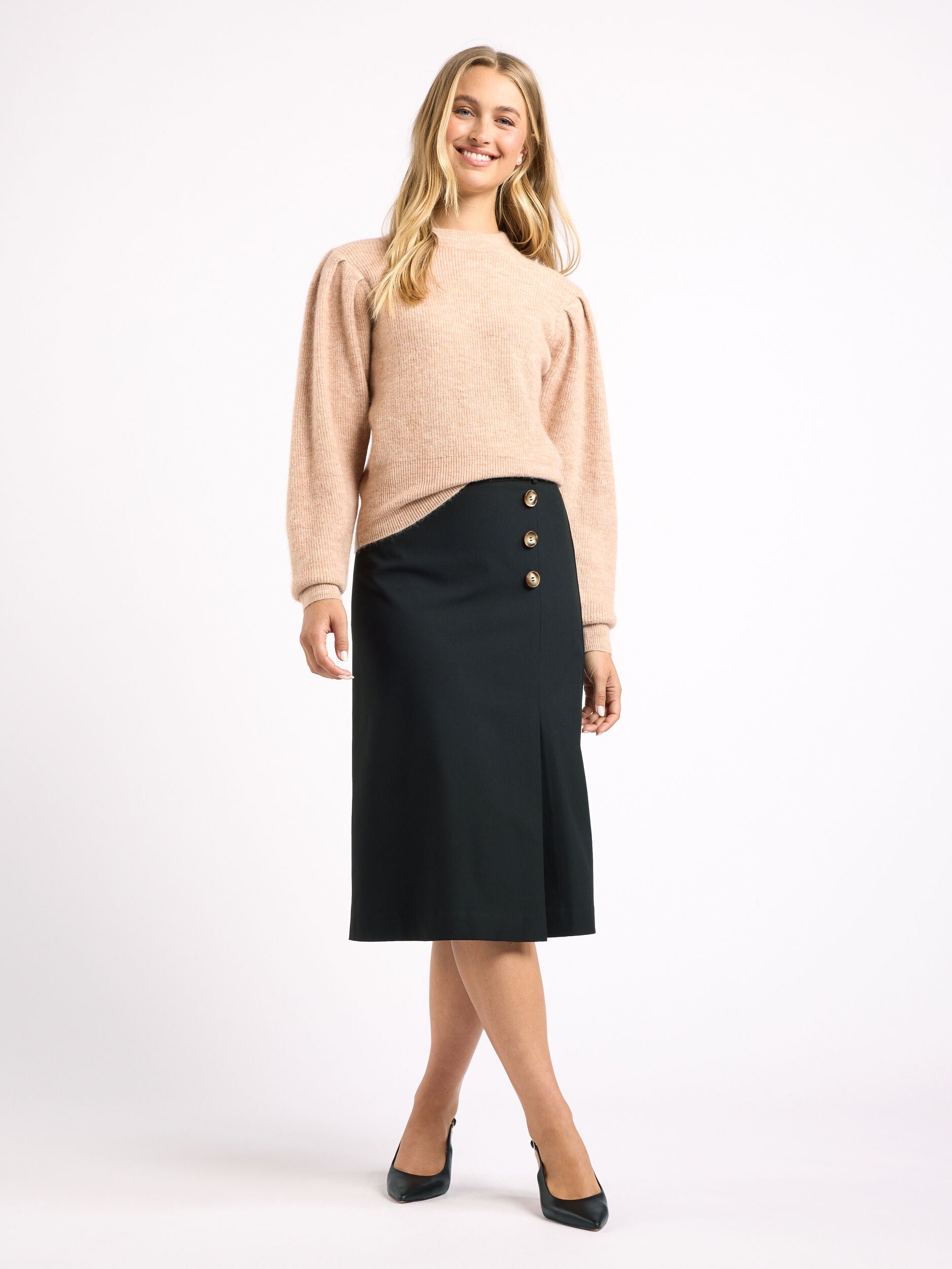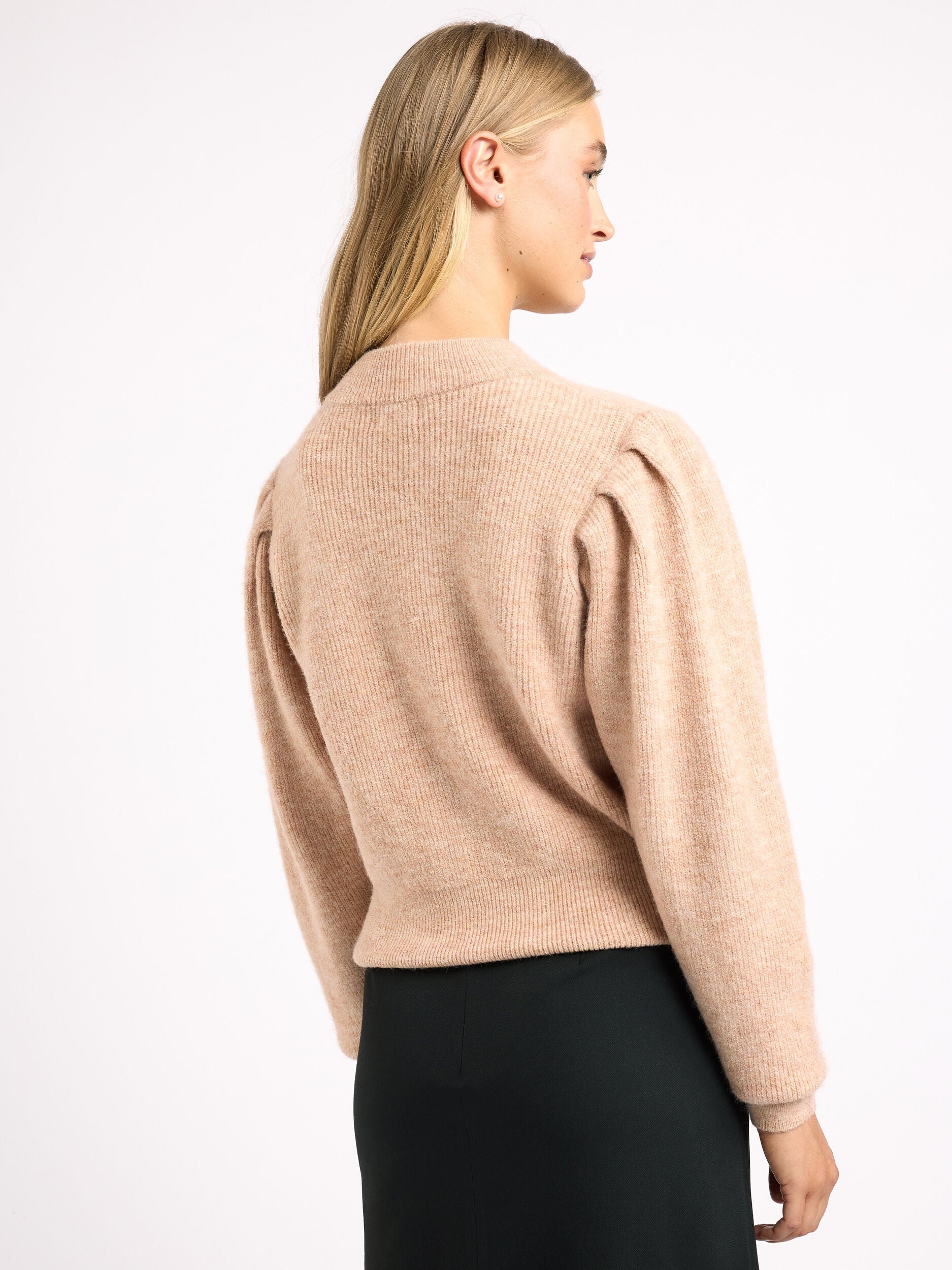 The Tilly Jumper is the perfect blend of comfort and style. Made from a soft wool blend, this jumper is both cozy and luxurious. The half cardigan stitch creates a textured look and adds interest to the design, while the round neckline adds a classic touch. The long voluminous sleeves are on-trend and add a fashion-forward element to the jumper. The straight fit and cropped length create a flattering silhouette that is both modern and versatile. The jumper also features stretch throughout, ensuring a comfortable fit all day long. The ribbed cuffs and hem add texture and structure to the overall design. The camel brown shade is timeless and pairs well with a variety of other colors, making it a versatile piece for any wardrobe. Whether you're dressing up or dressing down, the Tilly Jumper is the perfect choice.