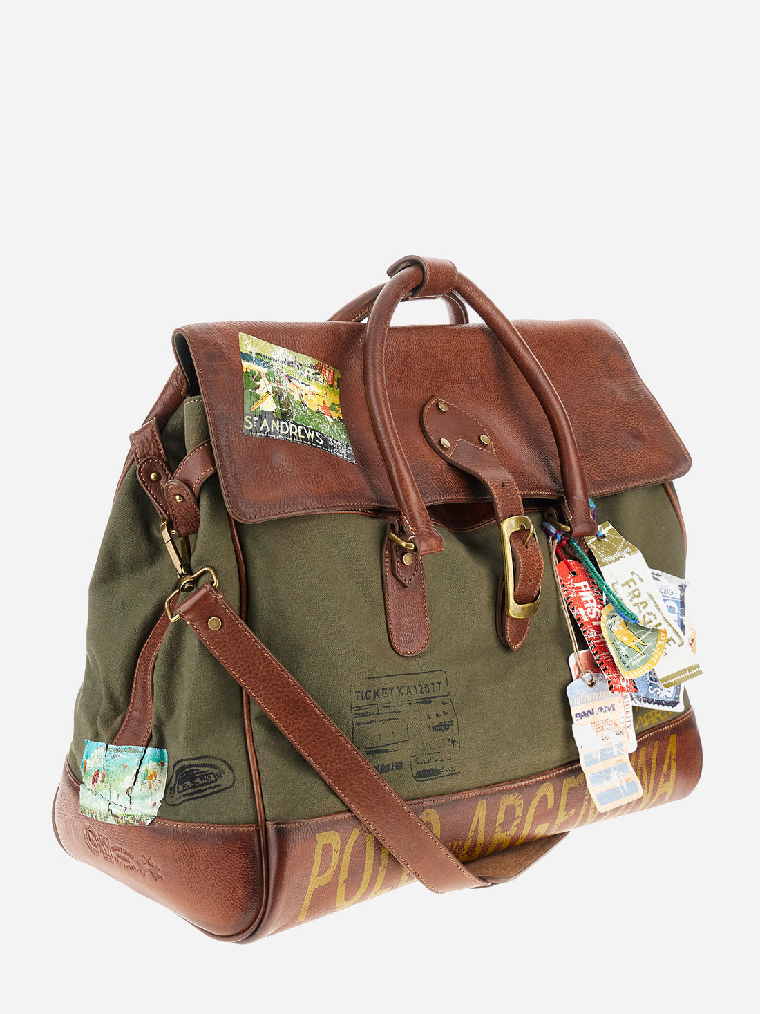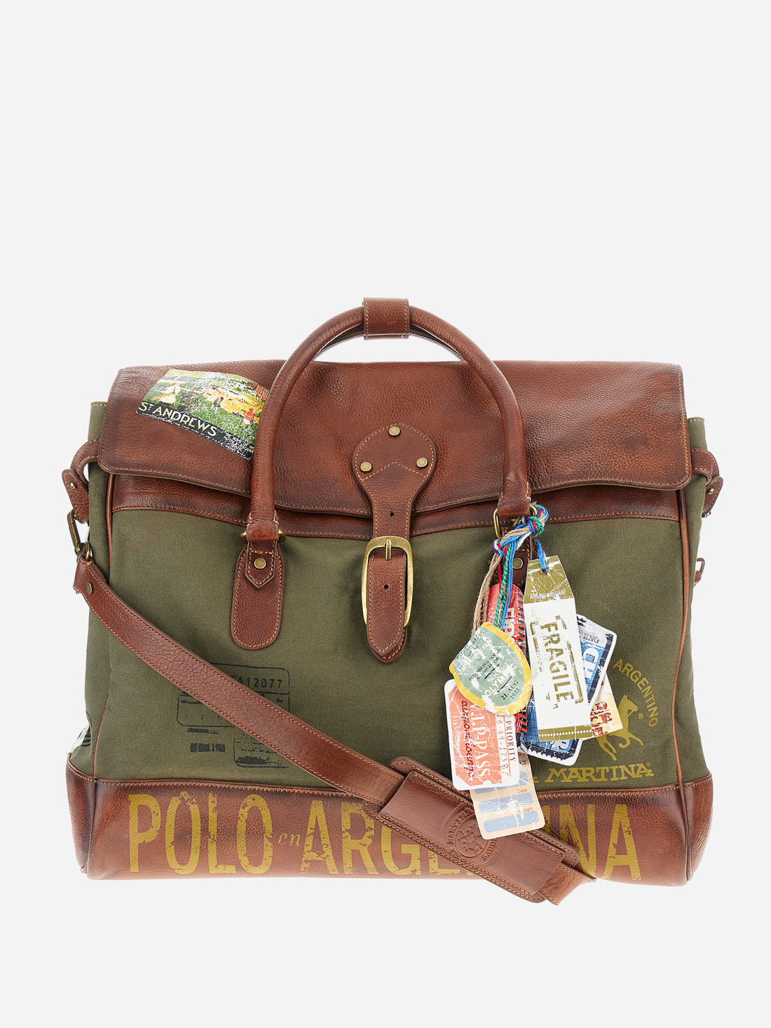 Unisex bicolor duffel bag made of 100% leather. Snap button closure. Equipped with two handles and a removable shoulder strap. Inside, there is a zippered pocket. Iconic design of the brand, embellished with writings, patches, and applied labels throughout the accessory. The La Martina logo is on the back. Dimensions (width x height x depth) 68x43x26 cm.