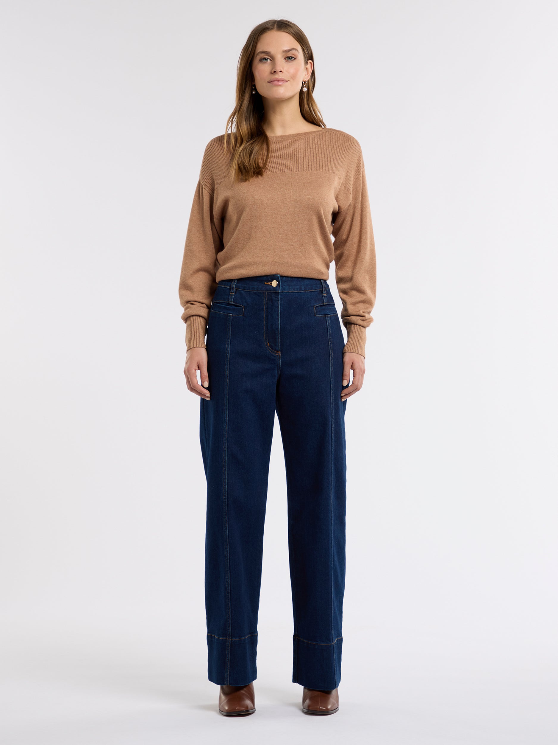 Wrap yourself in comfort and style with our Vanessa Jumper. Made from a luxurious cotton and wool blend, it features a relaxed fit with a jersey body and rib yoke. The open bateau neckline and lightweight design make it perfect for layering.
